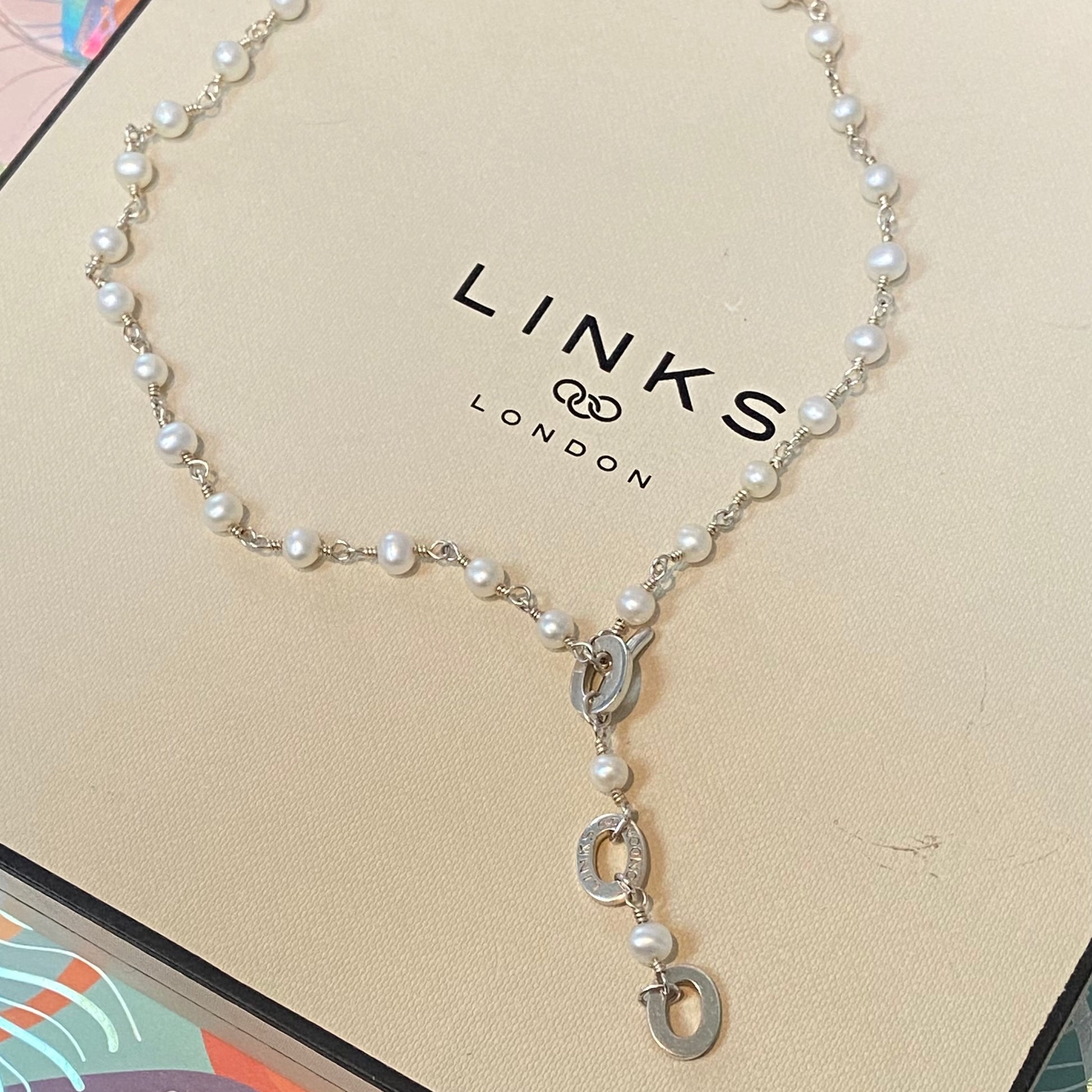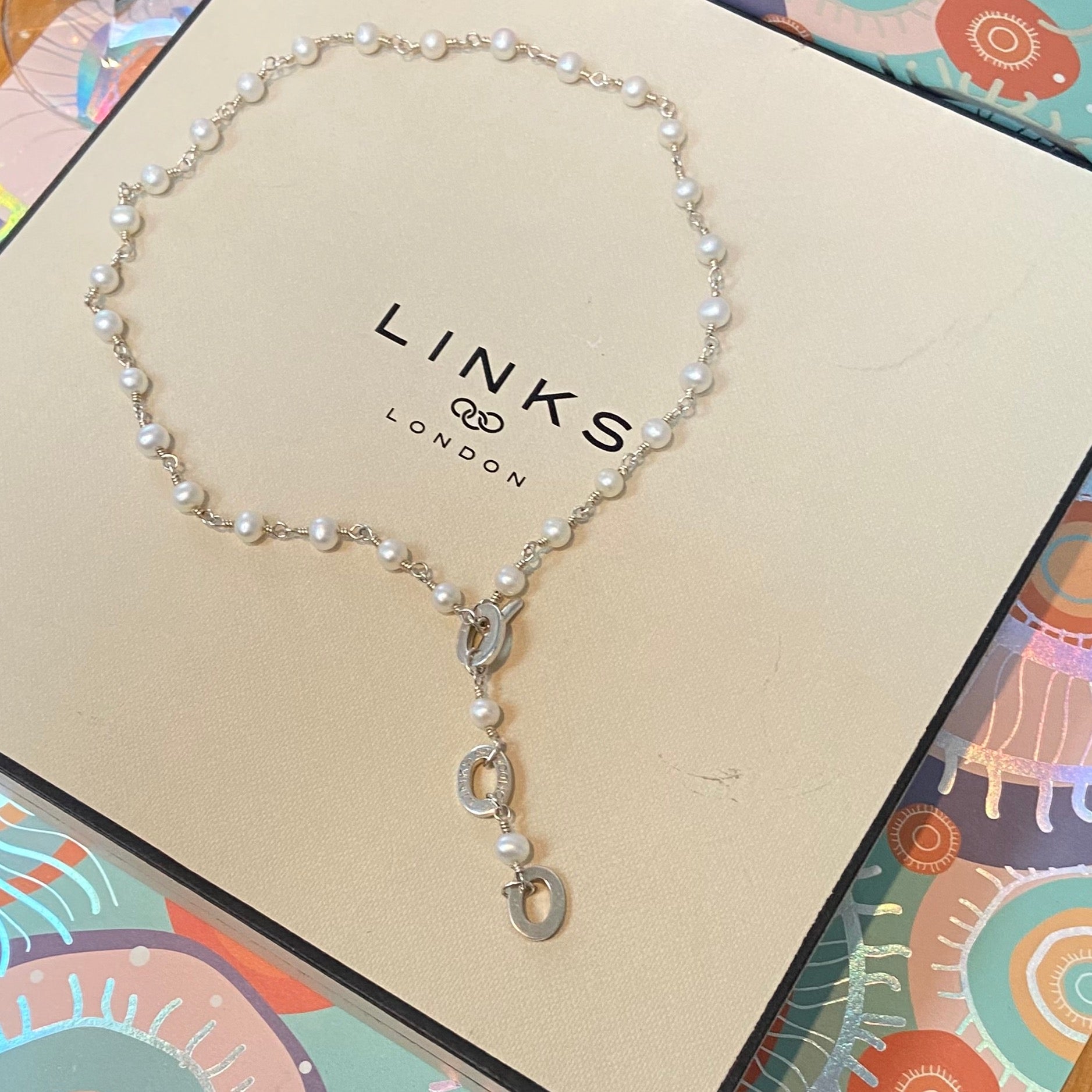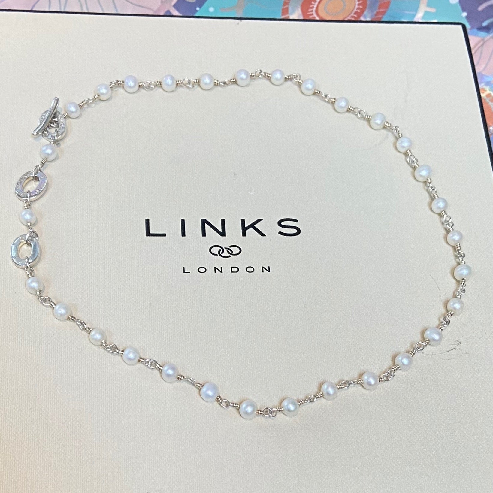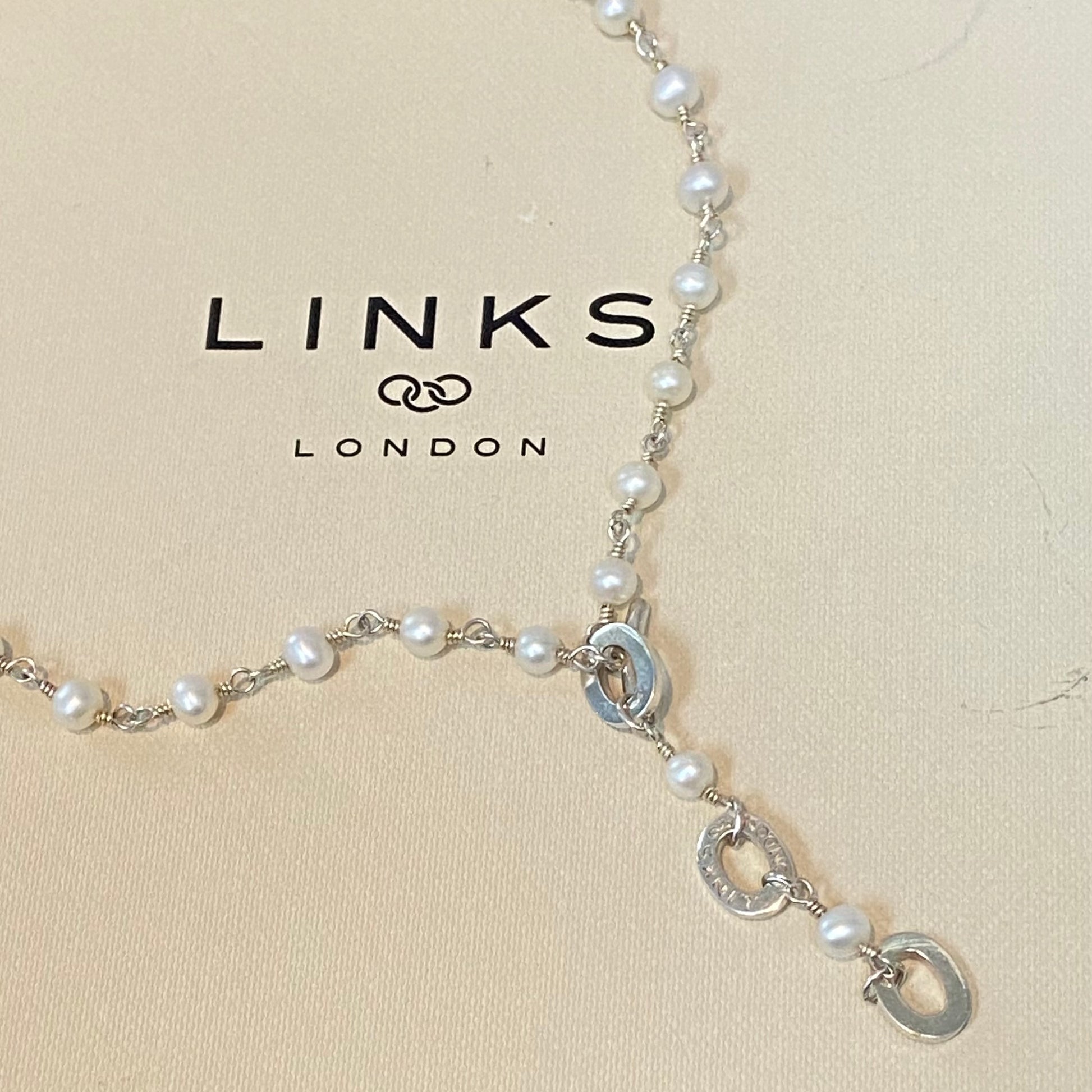 This item comes with the Links of London oval openings to make this the perfect adjustable necklace with a T bar clasp. The beautiful necklace is stamped 925 with the Links of London hallmarks. There are 30 pearls held together with Sterling Silver wire links.