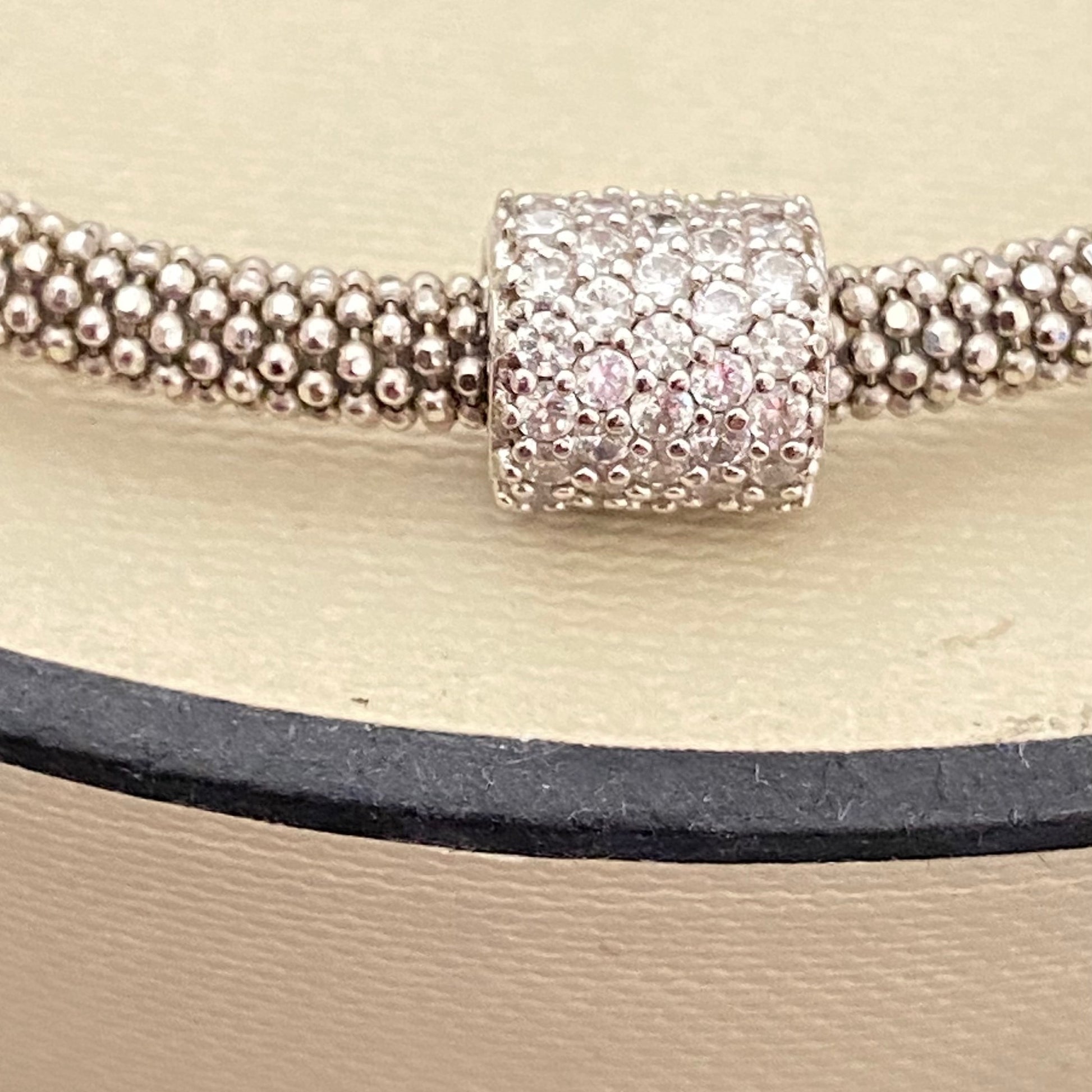 This silver bead bracelet, made from a special diamond cut sterling silver mesh with tiny facets to catch the light, glistens as it moves. A circular Cubic Zirconia pave encrusted sterling silver bead, like an orb in the galaxy, sparkles. Wrap it around your wrist and a sleek understated magnetic clasp also makes it easy to secure. The best thing about this bracelet is its versatility. By day, worn alone, it's a sprinkling of glamour. Wear it stacked in contrasting hues and it's an instant evening statement.