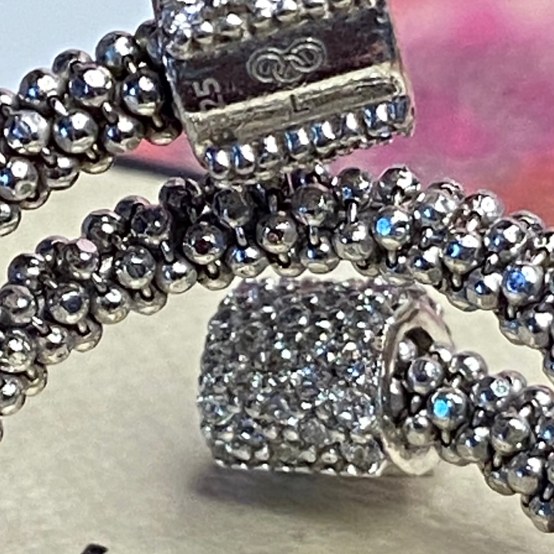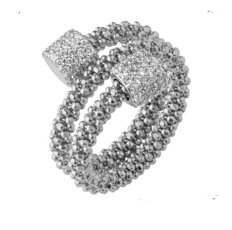 A circular Barrel of Cubic Zirconia pave encrusted sterling silver bead, like an orb in the galaxy, sparkles with glamour. Wrap it around your finger and a sleek, statement ring. The best thing about this ring is its versatility. By day, worn alone, it's a sprinkling of glamour. You certainly get noticed with this ring. The bubbles are inspired by the bubbles of champagne and the sparkle of the galaxy.