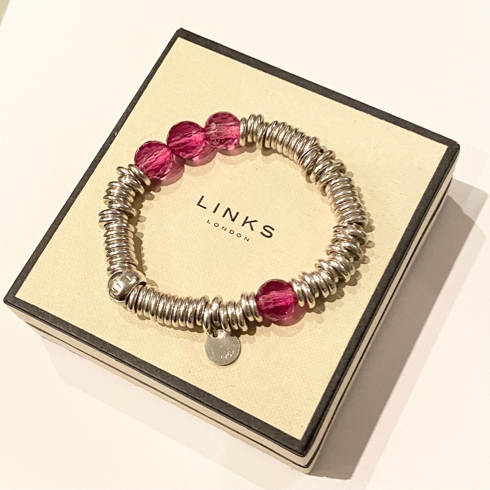 The Links of London Sweetie Bracelet has the Iconic Bead and the silver bead with the Links Logo tag displays their unique Links of London Sterling Silver Hallmarks.