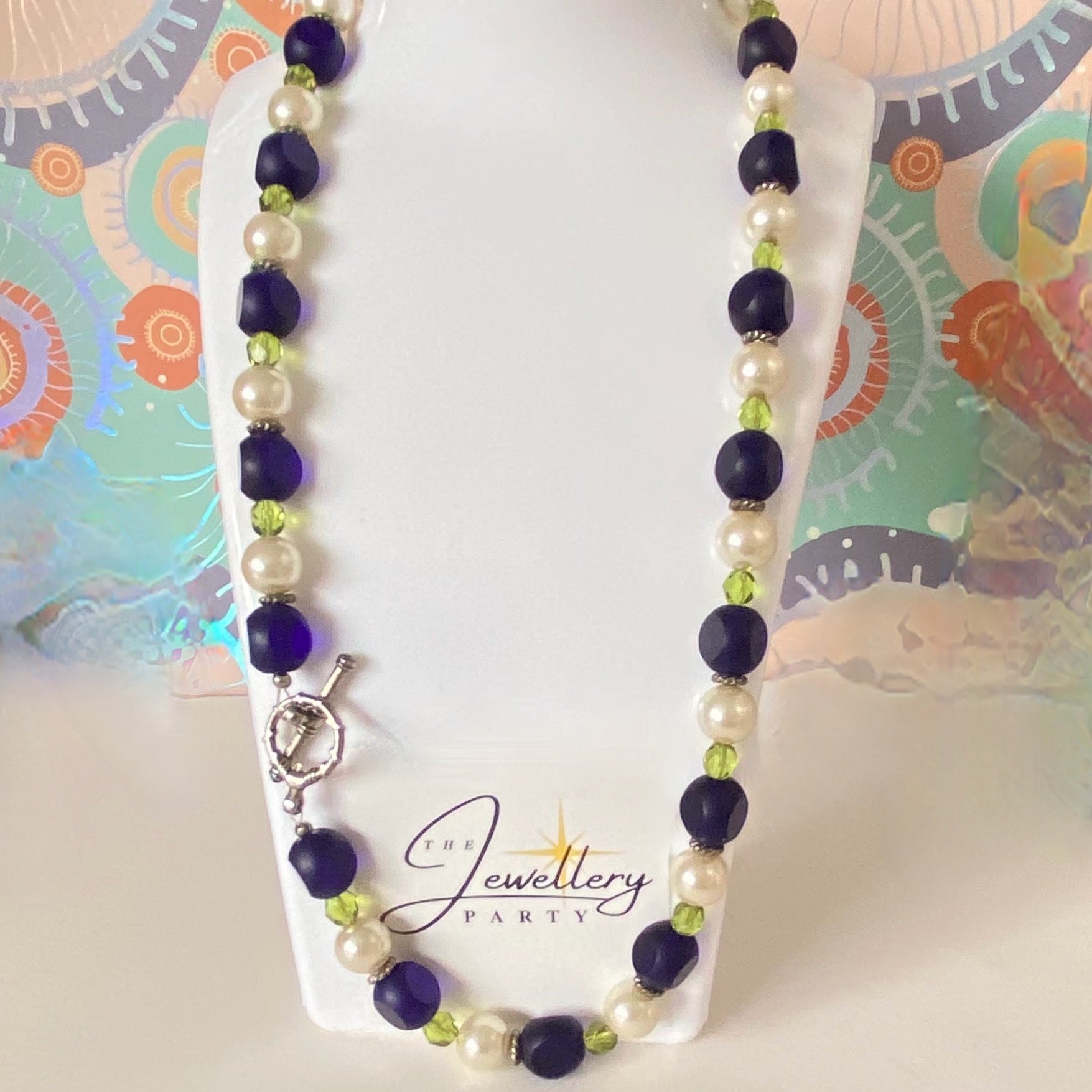 This is a lovely Costume jewellery necklace made from Faux pearls which are in super condition and glass beads. Held together with a T bar clasp which is rather decorative. The Deep purple glass beads really stand out against the Faux Pearls and the little pale green beads making this a stunning easy to wear addition to your daily wear.