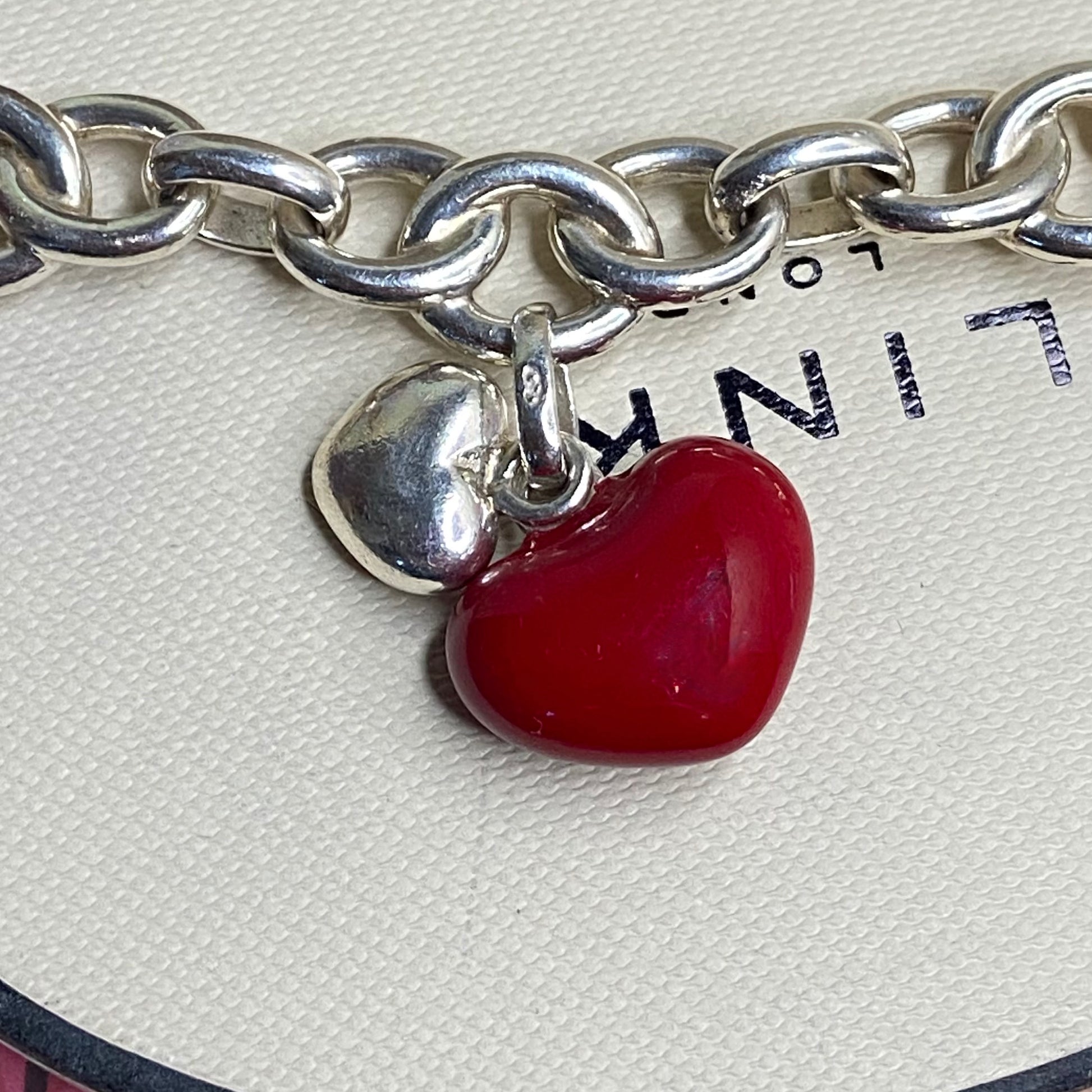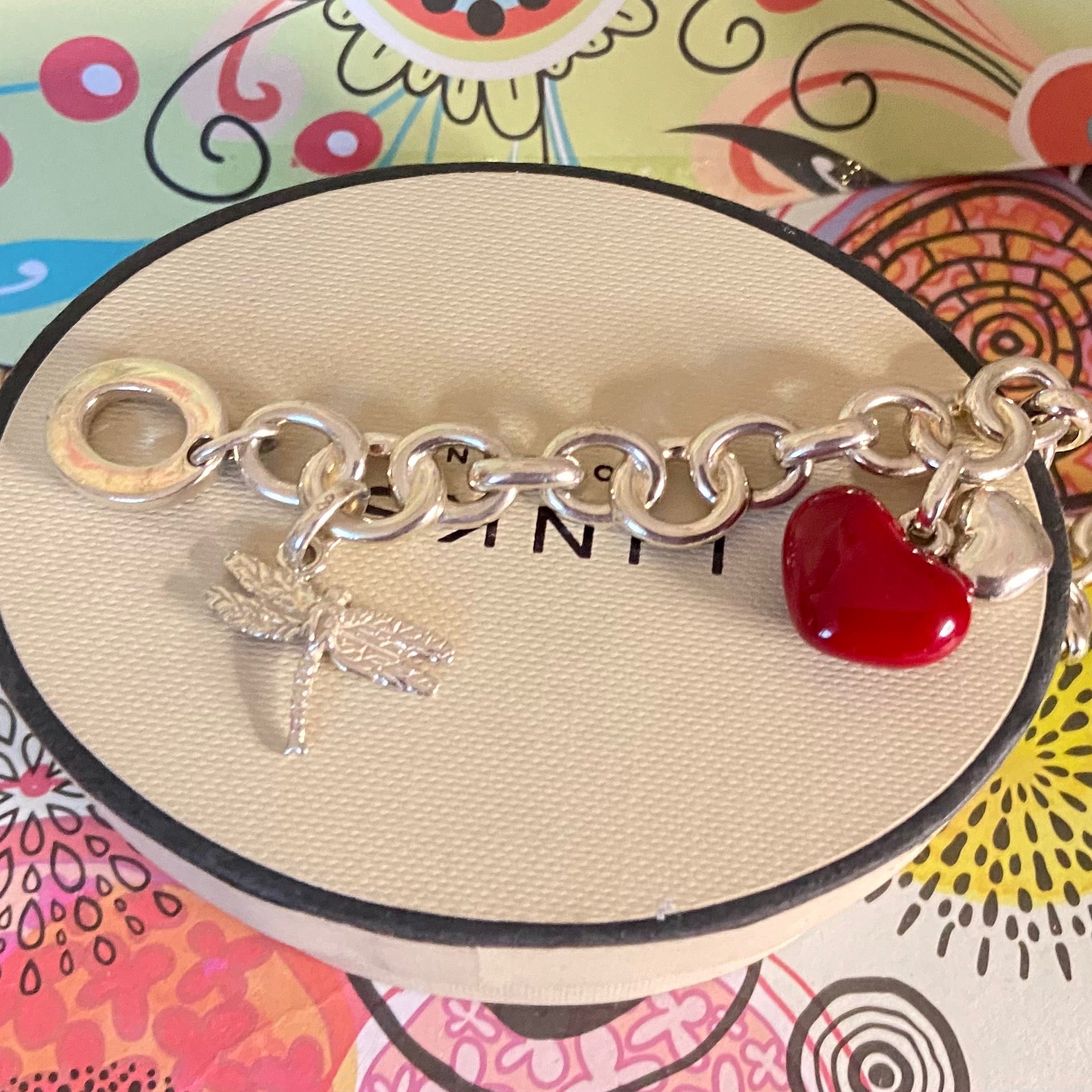 Item: Fully Hallmarked Sterling Silver T-Bar Bracelet Links of London including 3 Charms, Elephant, Red enamelled heart with a silver heart attached and a Dragon Fly. 21cm end to end. 40g