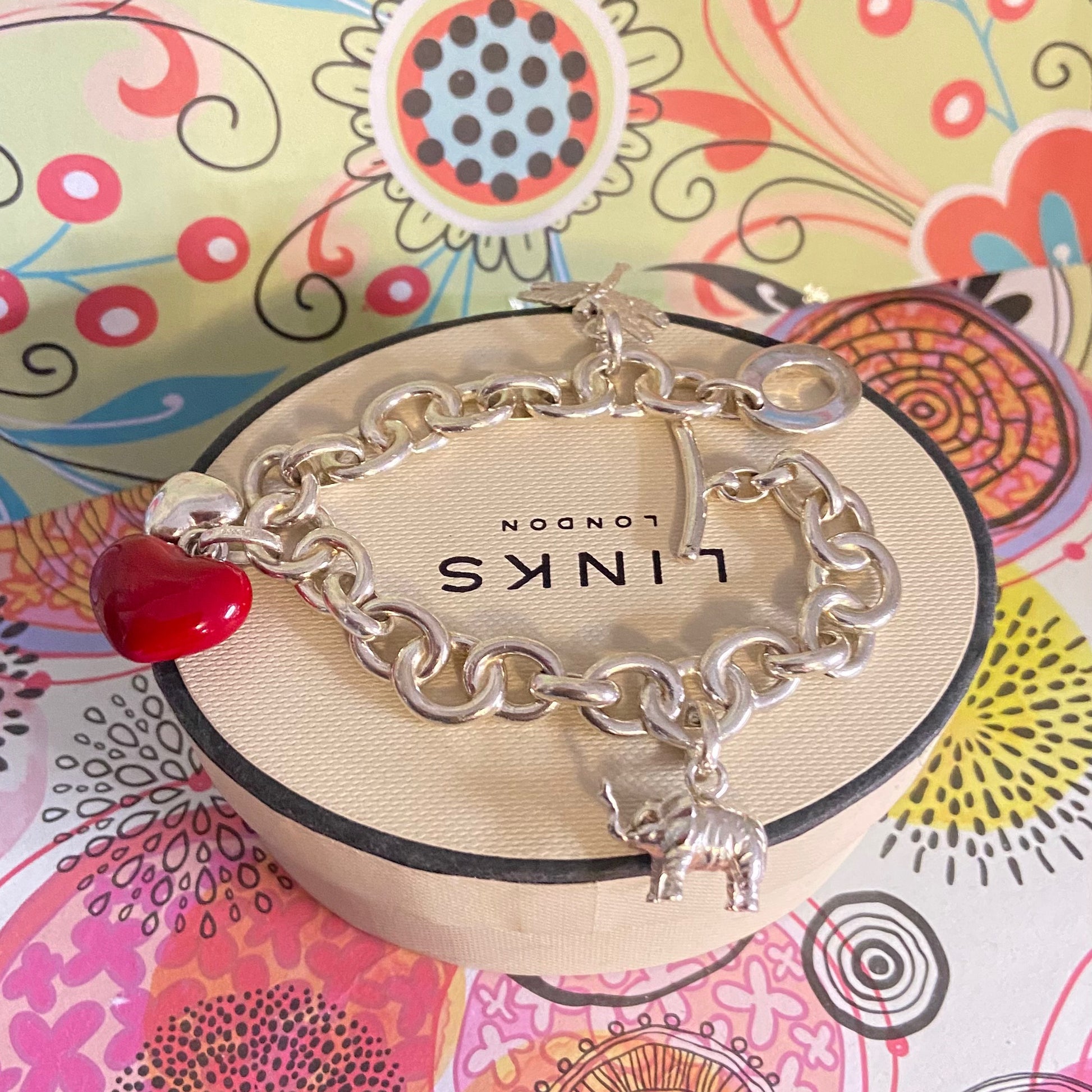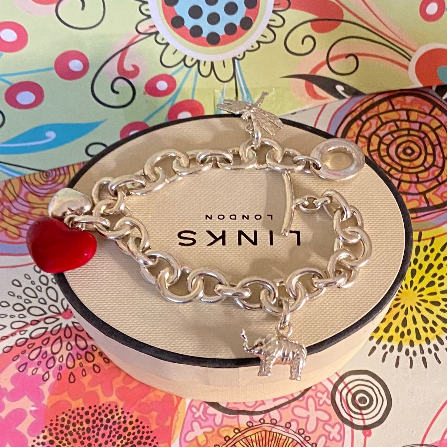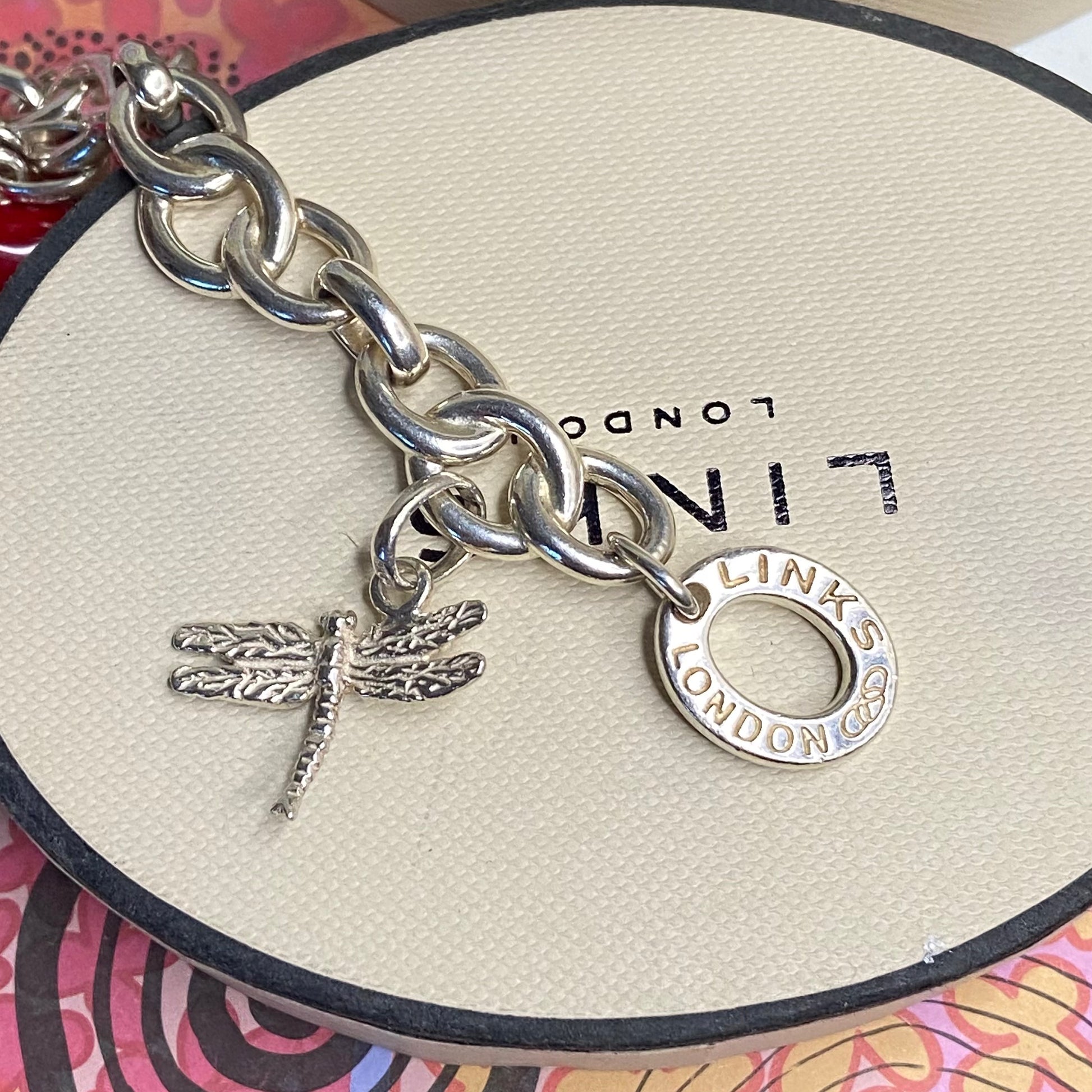 Beautiful heavy Links of London rare Links style bracelet, 21cm end to end measurements with 31g of Sterling Silver. This Links of London bracelet is inspired by the Love of London, the signature collection is their most iconic. The original owner put together a selection of charms that reflect the strength of an elephant, the hearts of love and the wings of a dragonfly. Are you going to be the new owner of this beautiful bracelet