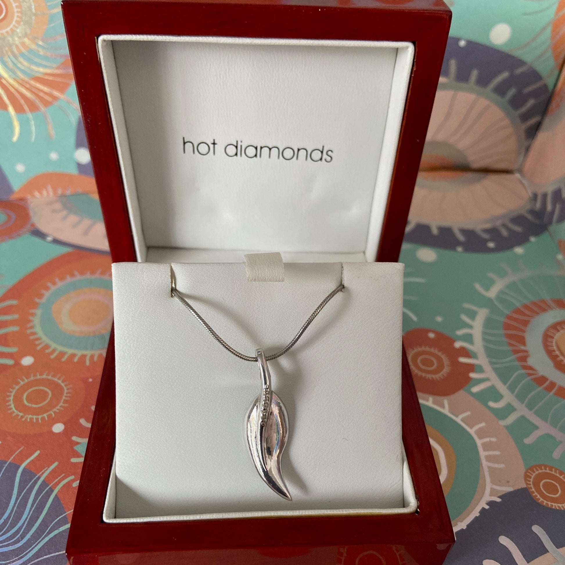 The earrings are stud earrings measuring 2cm x 0.6cm with 3 diamonds, with the 925 and DIA Hallmarks. The Necklace is a beautiful Diamond Leaf Pendent 3.3cm x 1cm with 5 Sparkle Diamonds held on a snake chain 44cm adjustable to 39cm, with the 925 and DIA Hallmark. This collection is in perfect condition and comes in the original Vintage Hot Diamonds wooden box. The box has very minor wear as it was in storage.