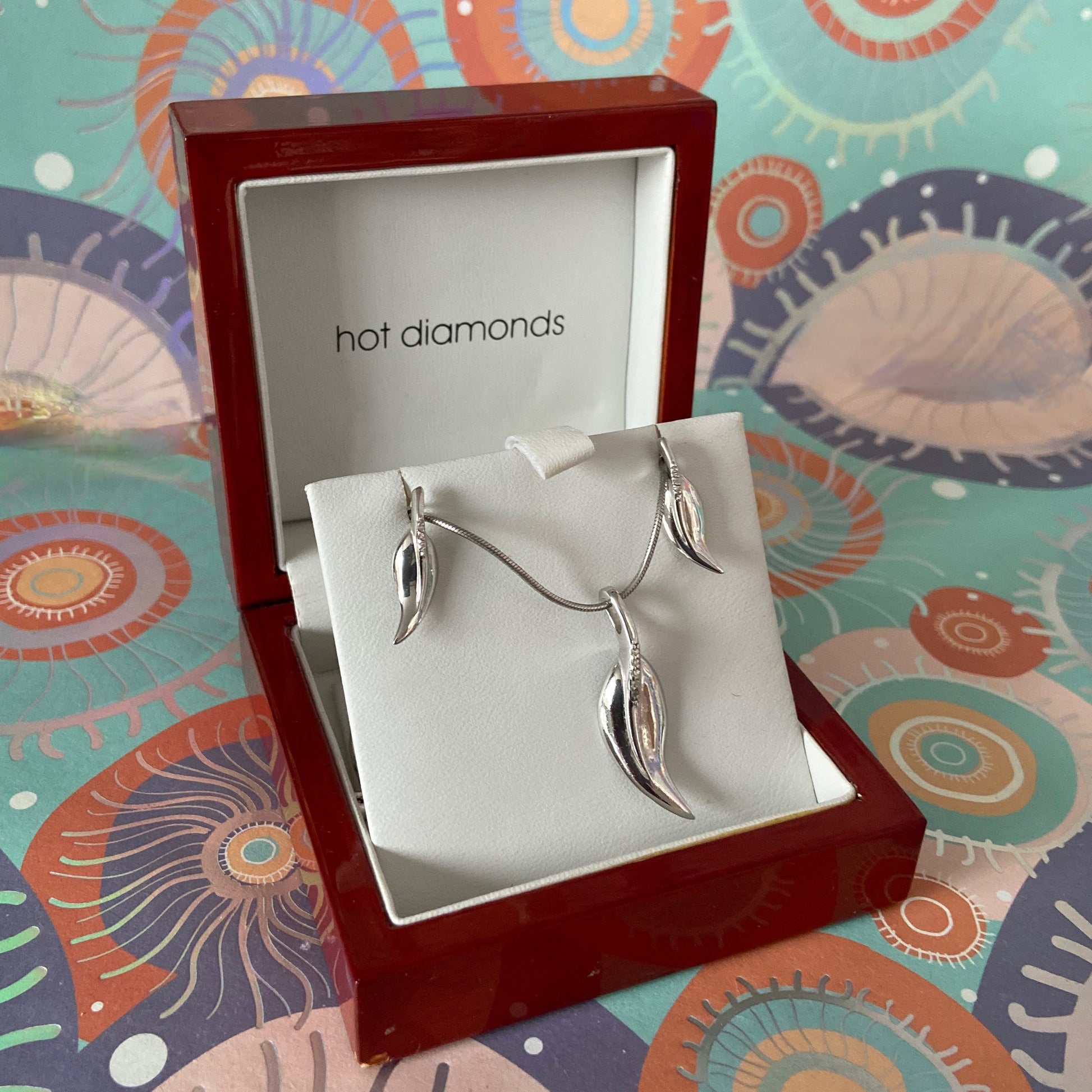 A rare opportunity to purchase the vintage Hot Diamonds Leaf Stem design Earrings and Necklace set, crafted in Sterling Silver with Diamonds.