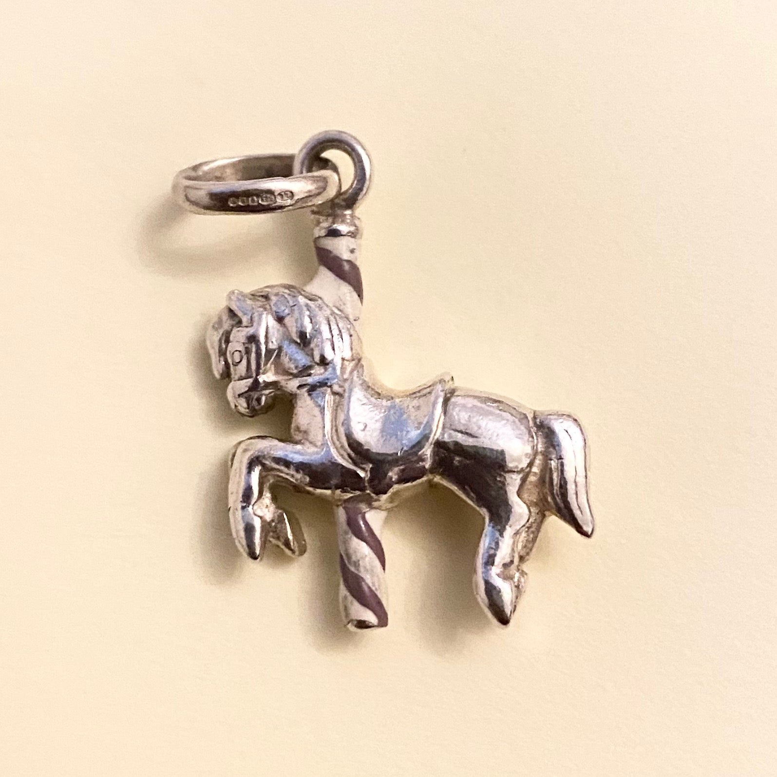This Horse Beautifully crafted in sterling silver and the pole is white striped enamel and fully hallmarked, this is a lovely charm. This charm is inspired by our love of Merry-go-rounds from Fair grounds. It is an amusement ride that rotates in a circular motion with wooden horses that move up and down in a galloping motion.