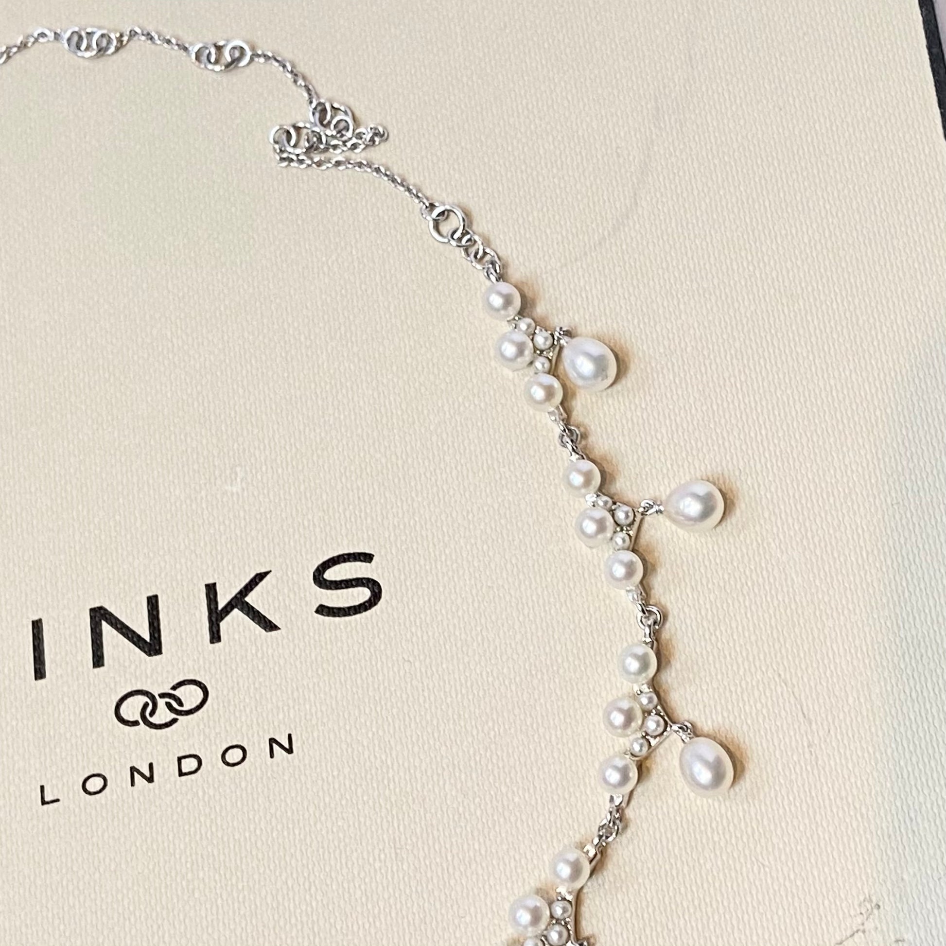 This item comes with the Links of London gift cover slip, black pillow and large square box. This item is in perfect condition, crafted with Sterling Silver and Pearls. The box has very minor wear due to storage. This would make the perfect gift for a wedding or any special occasion.