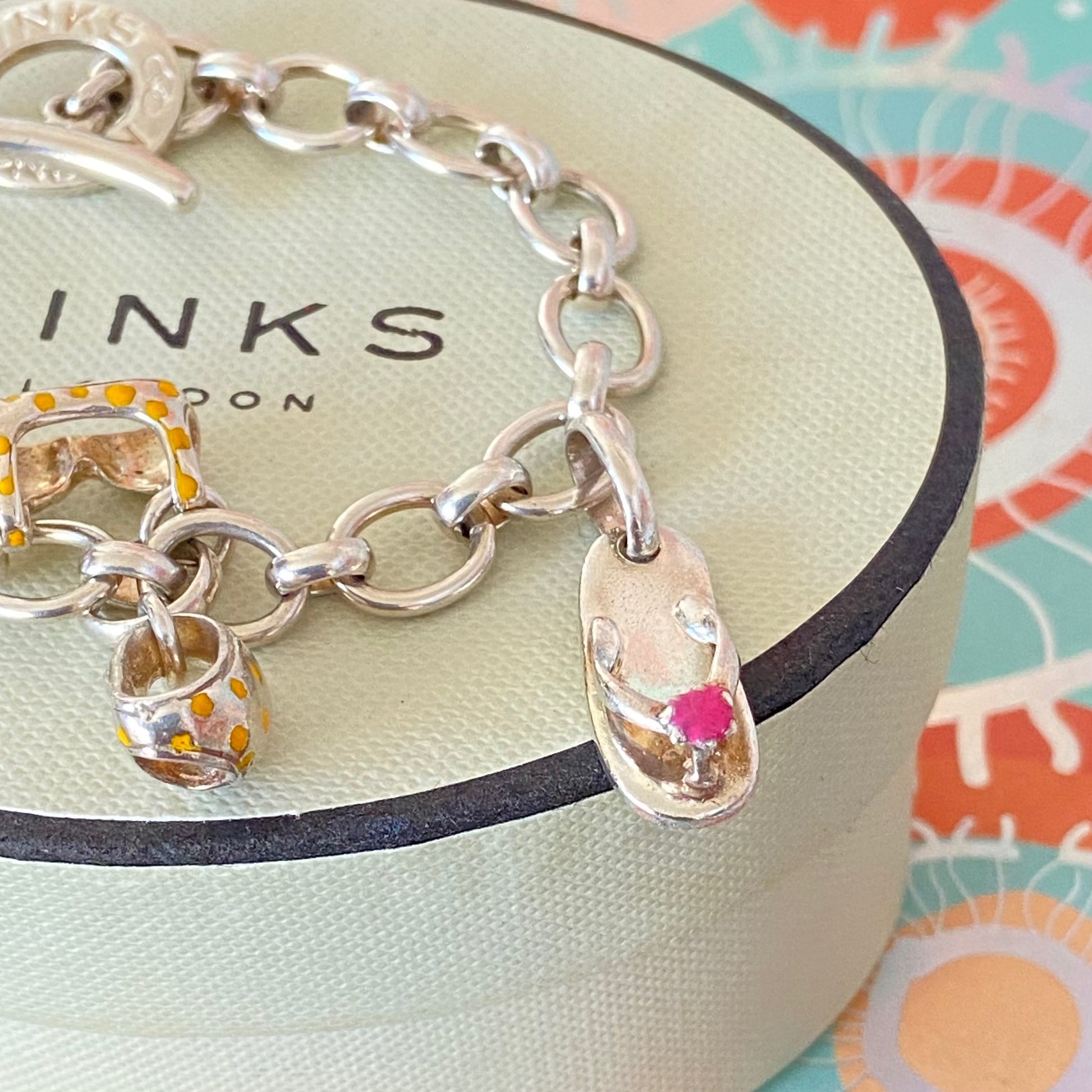 This is one of Links of London Classic popular Signature Bracelet designs. Crafted from Sterling Silver with the Links of London and Hallmark on the oval clasp, beautifully designed. The Flip Flop and Yellow Polka Dot Bikini are authentic Links of London Charms featuring a silver Flip Flop with a pink flower and a Bikini with yellow polka dot enamel dots. The weight of Sterling Silver bracelet is 18g.
