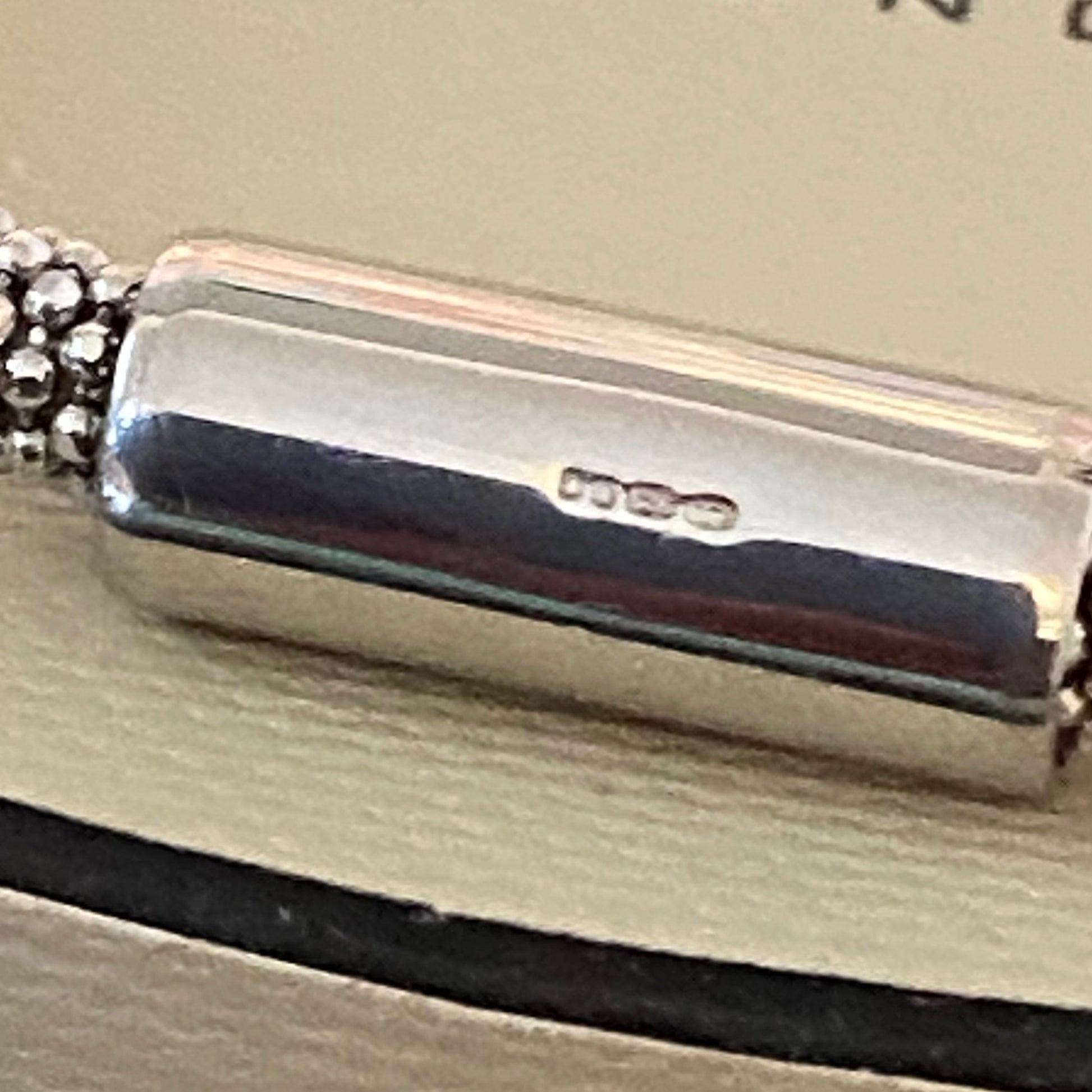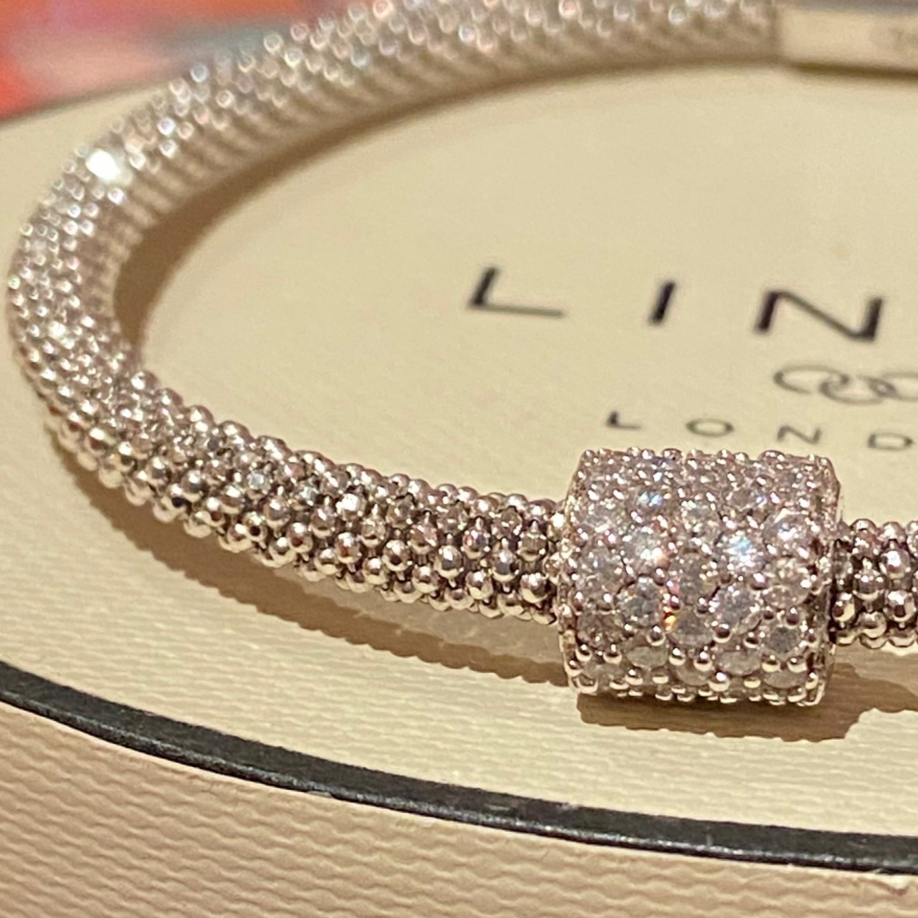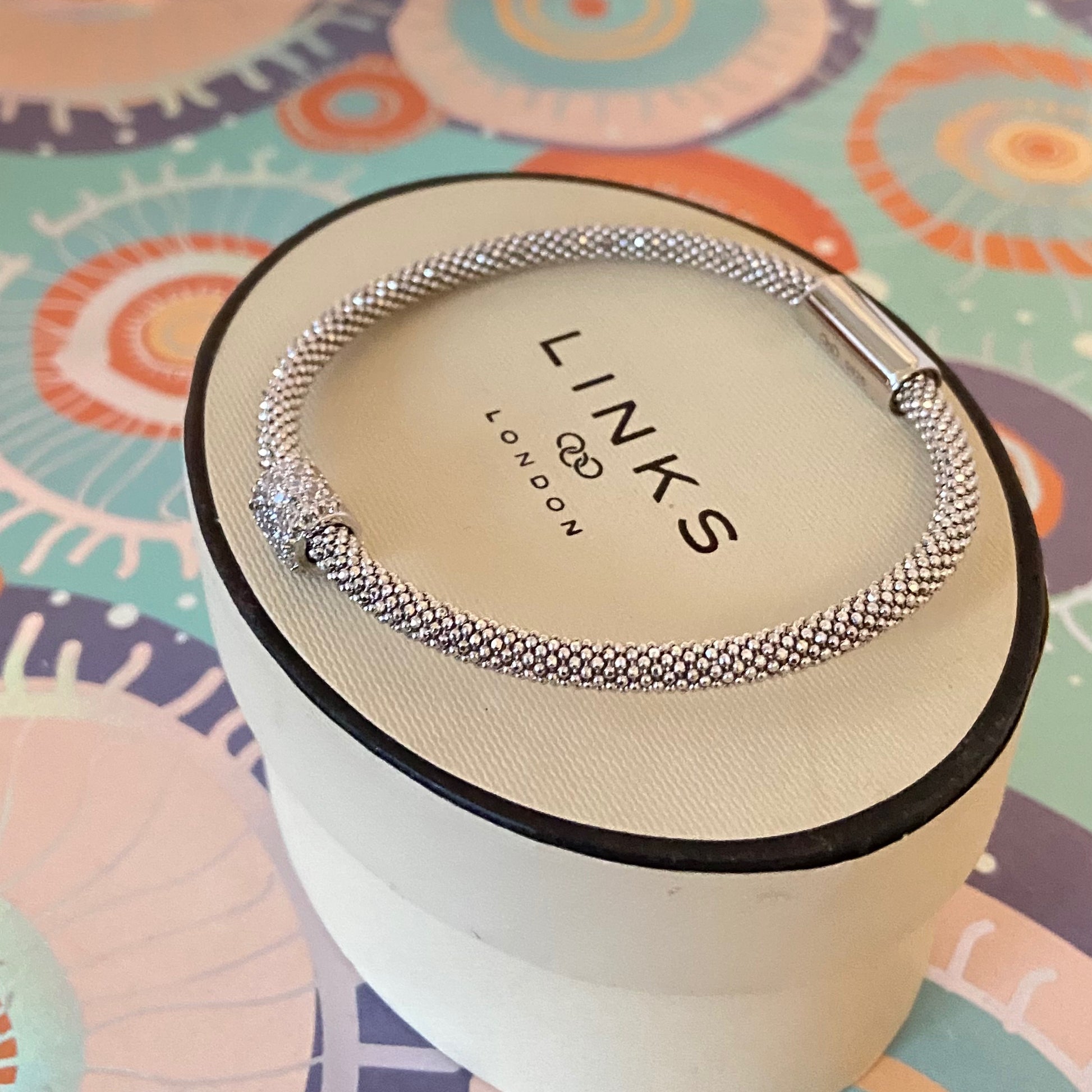 This silver bead bracelet, made from a special diamond cut sterling silver mesh with tiny facets to catch the light, glistens as it moves. A circular Cubic Zirconia pave encrusted sterling silver bead, like an orb in the galaxy, sparkles. Wrap it around your wrist and a sleek understated magnetic clasp also makes it easy to secure. The best thing about this bracelet is its versatility. By day, worn alone, it's a sprinkling of glamour. Wear it stacked in contrasting hues and it's an instant evening statement. What a great opportunity to purchase a piece of history with the original Links of London vintage packaging.