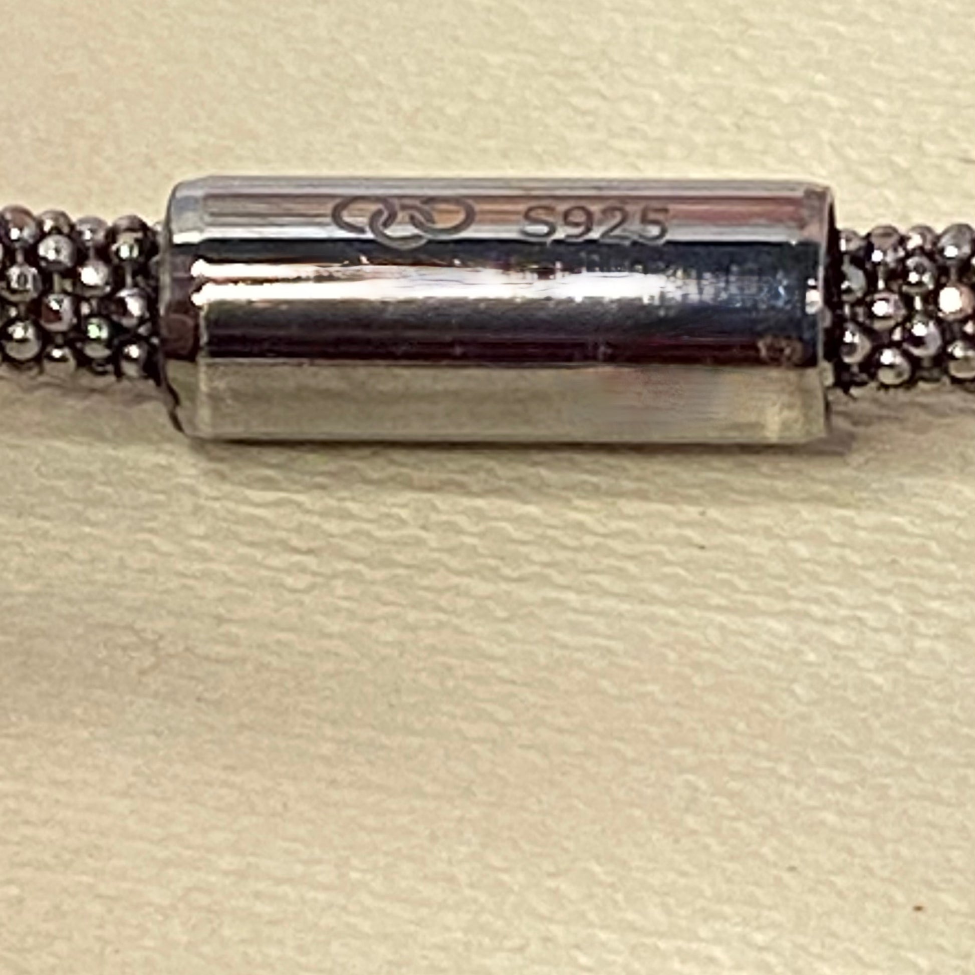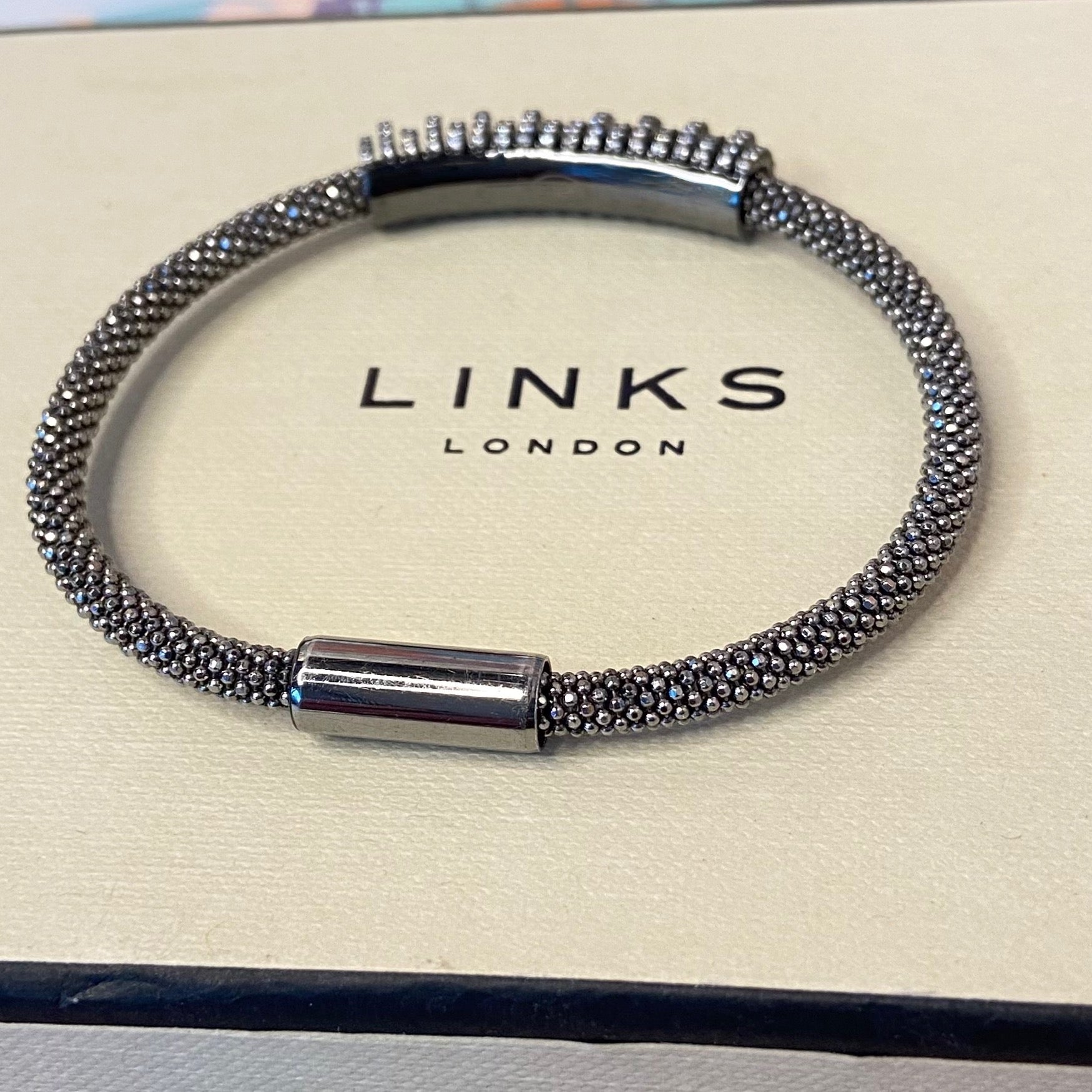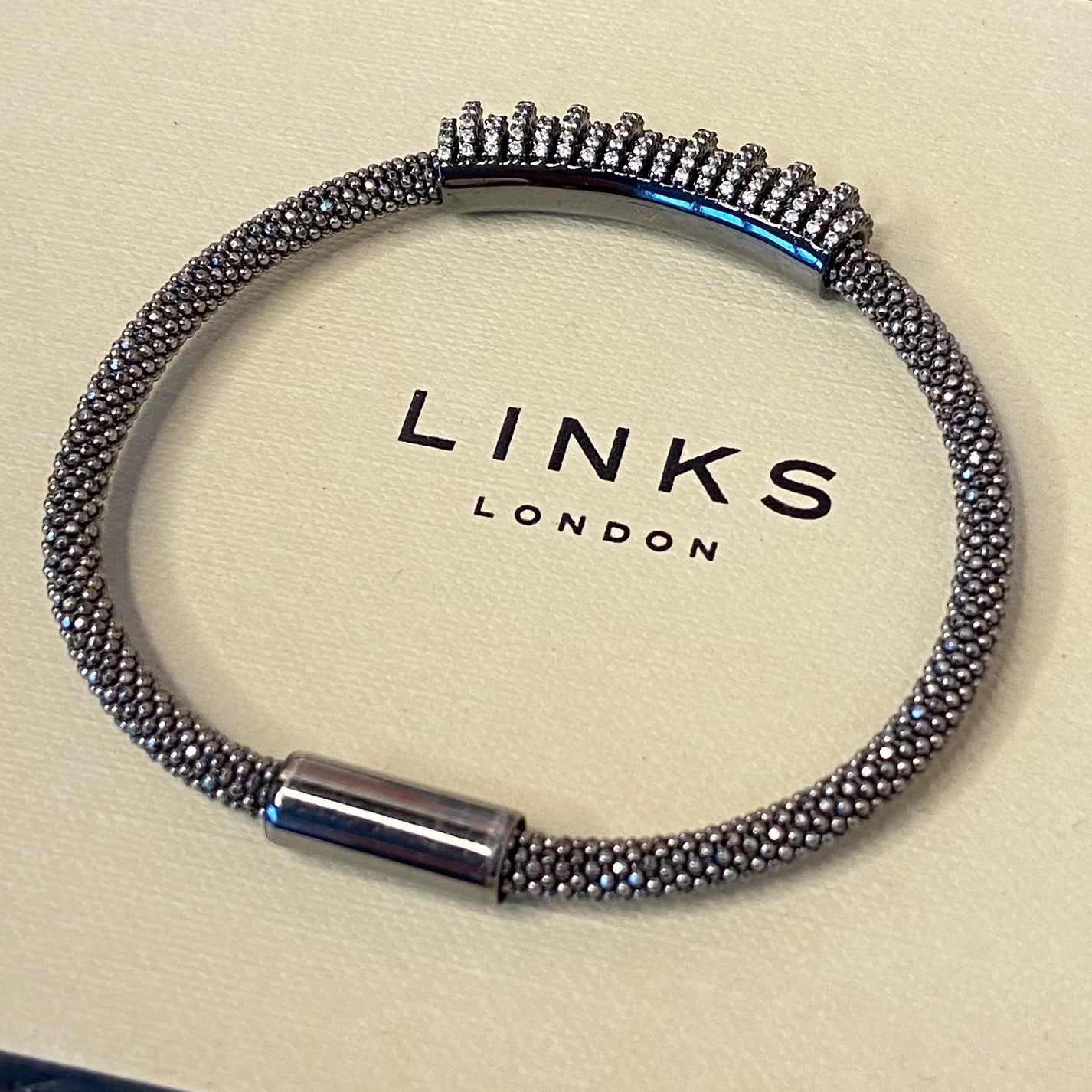 The bracelet is Sterling Silver 925 hallmarked with the classic Links of London Logo and the Sterling silver hallmarks on the clasp. The Clasp is magnetic making this such an easy bracelet to wear. The bracelet is 18.5cm end to end. The Cubic Zirconia stones add the sparkle and glamour.
