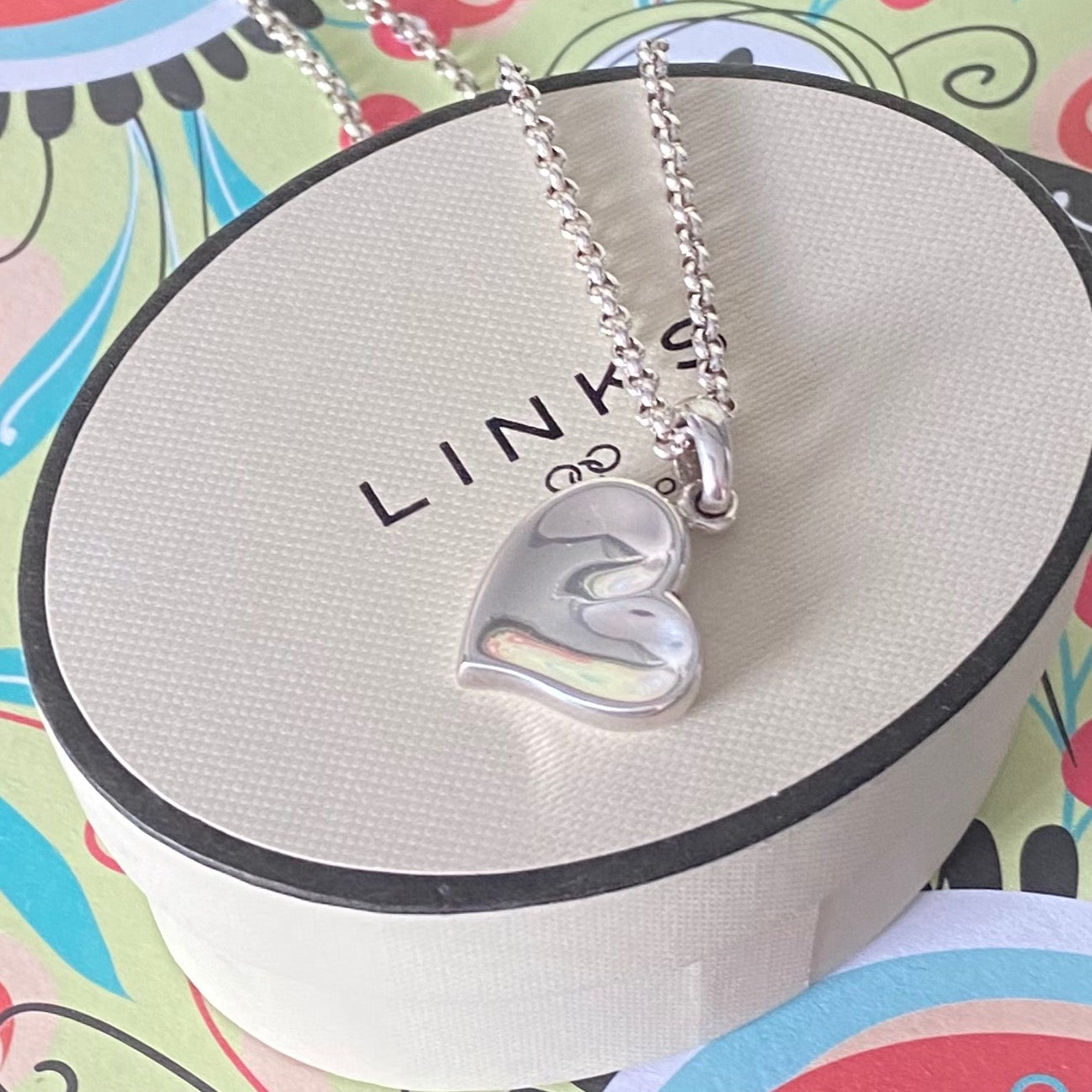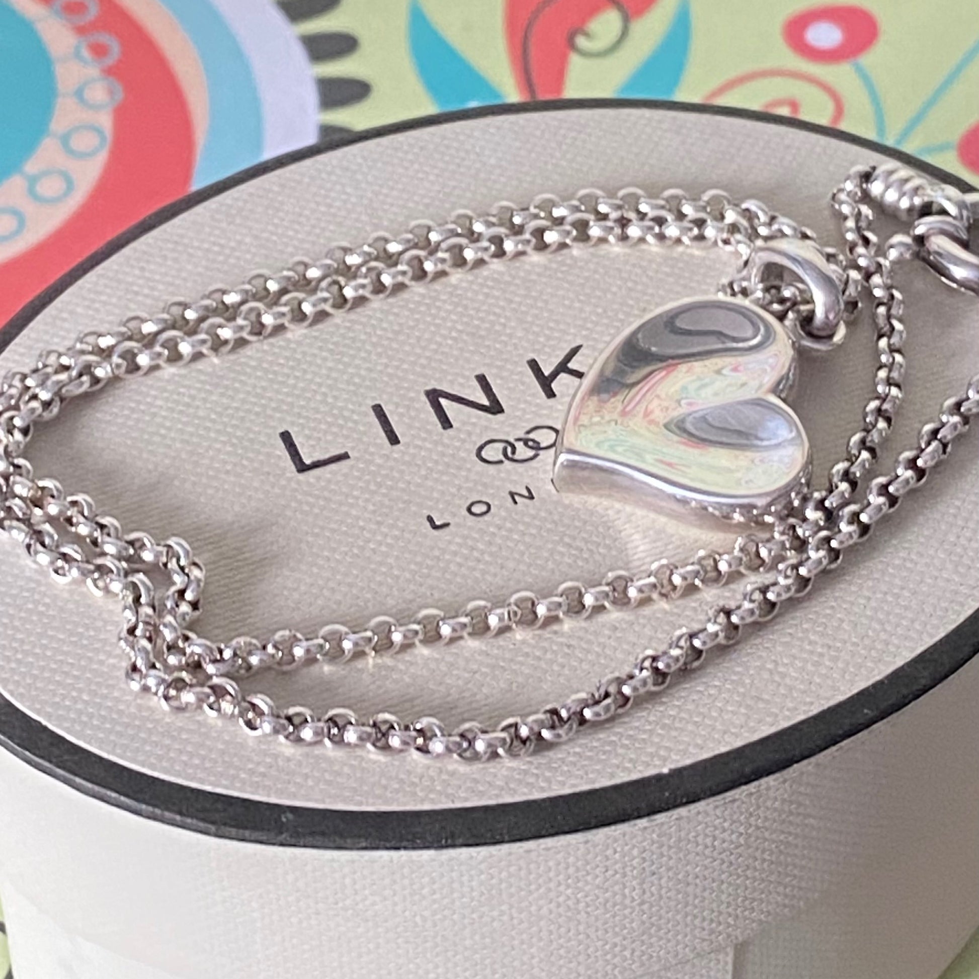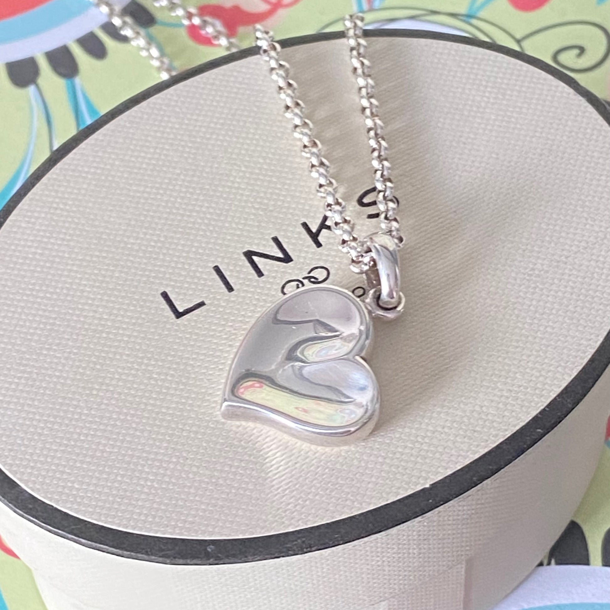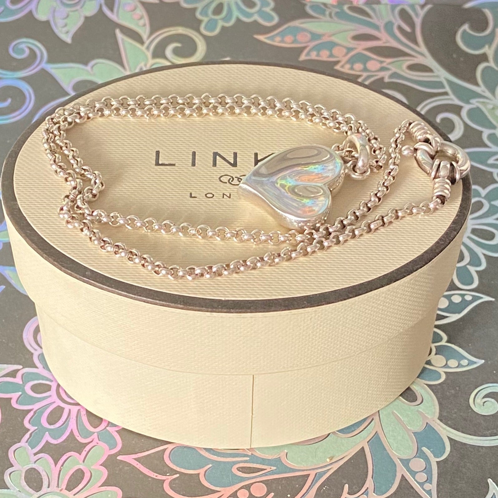 Beautiful addition to a jewellery collection. you can wear this during the day or perfect for the evening. The Links of London Hallmark is on the loop of the clasp. The necklace is in perfect condition, the heart has minor wear, which is not noticeble unless you look very close. It is not easy to photograph the wear as it is tiny. Never the less who ever wears this will feel stunning it really is a lovely item. The item will arrive in the beautiful Blue leatherette box with a gold clasp.