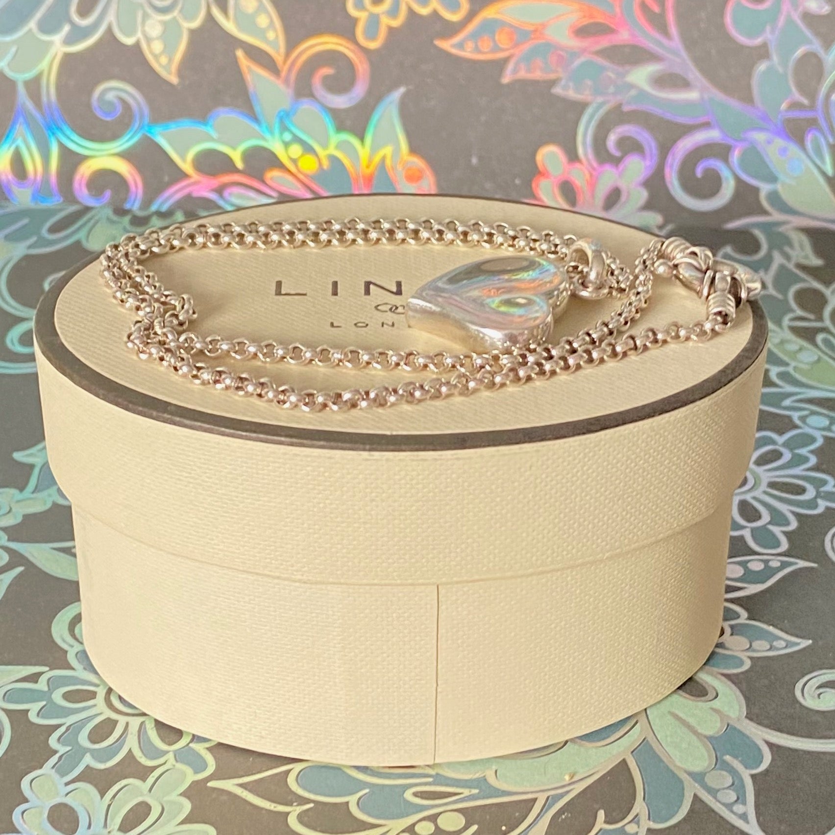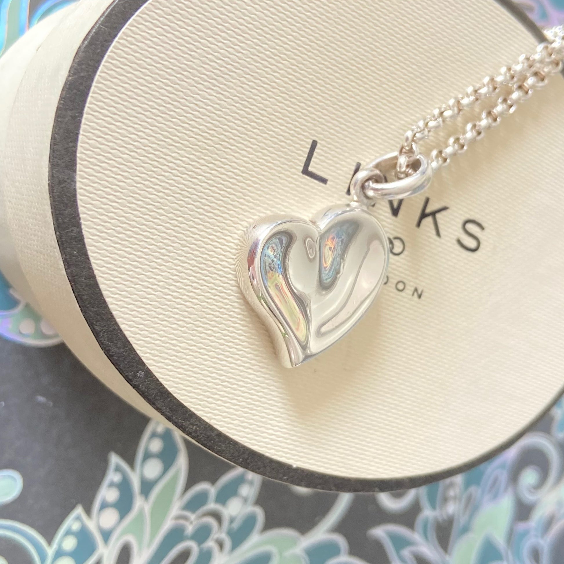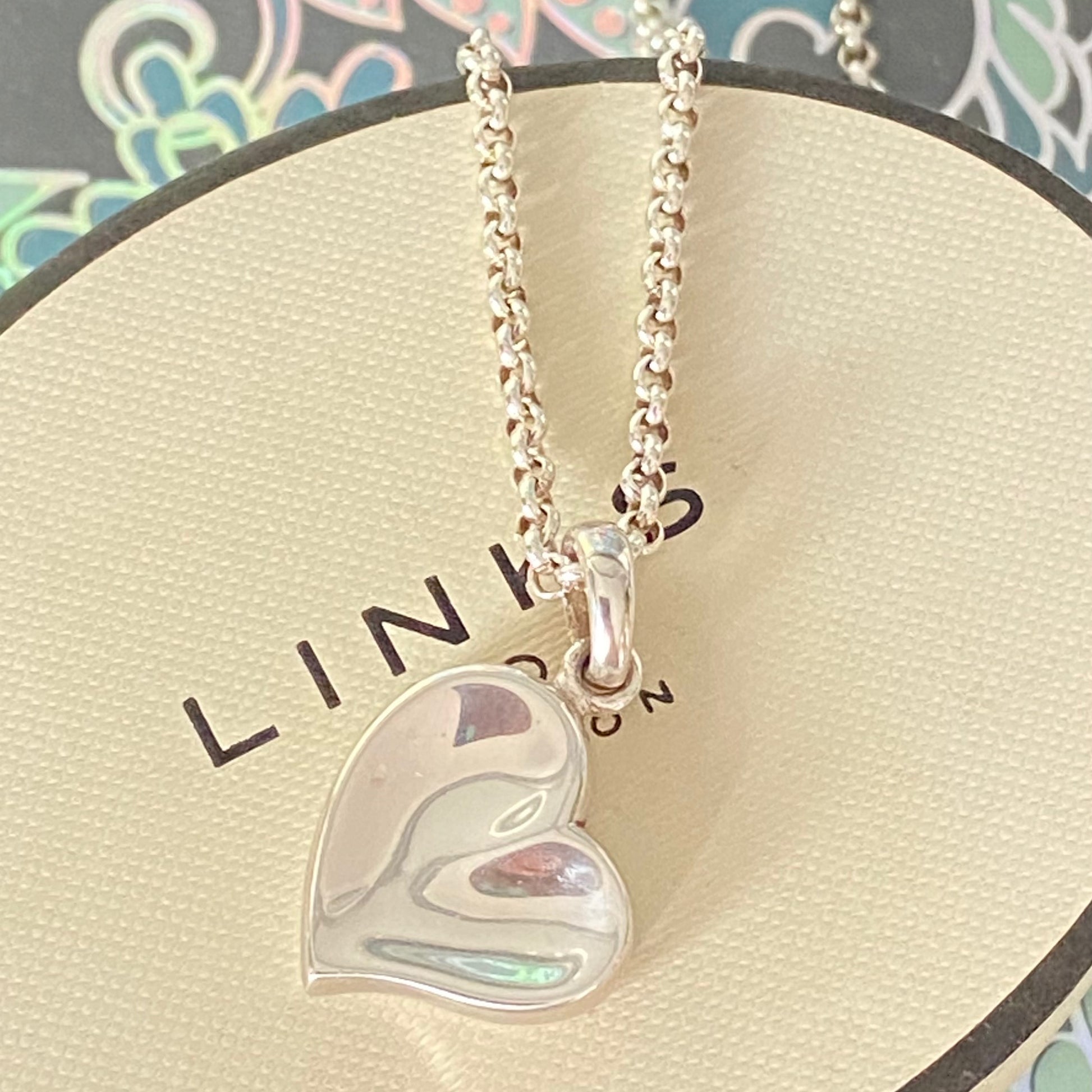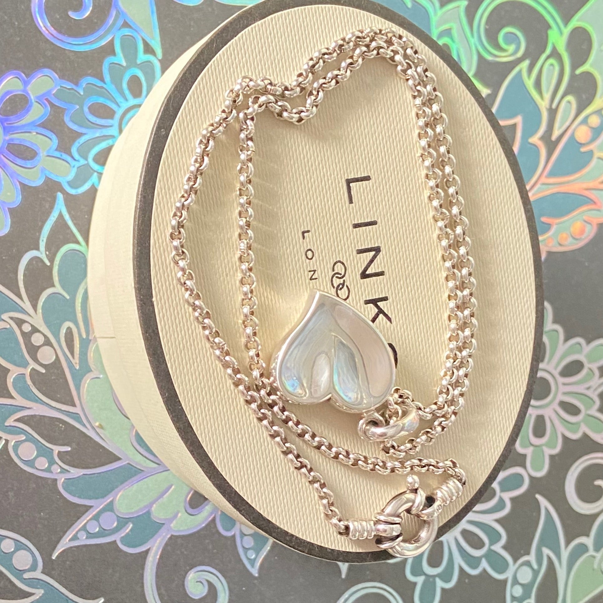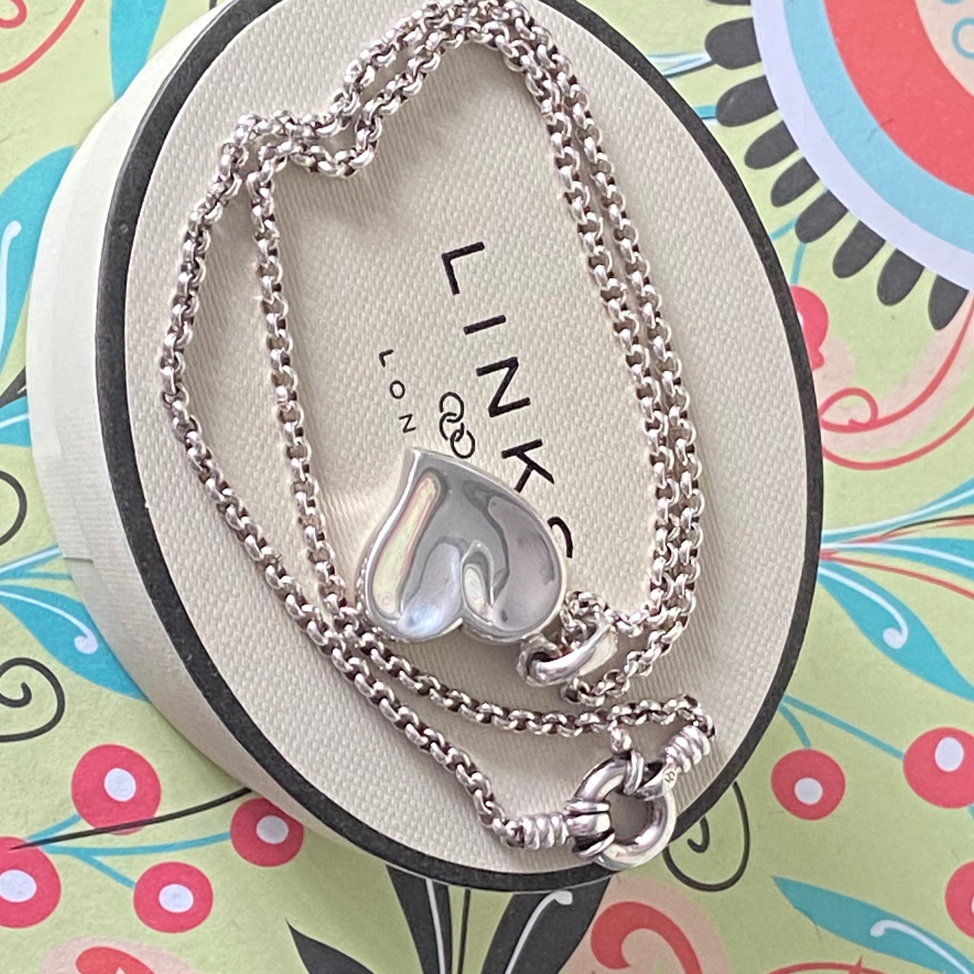 Beautiful addition to a jewellery collection. you can wear this during the day or perfect for the evening. The Links of London Hallmark is on the loop of the clasp. The necklace is in perfect condition, the heart has minor wear, which is not noticeble unless you look very close. It is not easy to photograph the wear as it is tiny. Never the less who ever wears this will feel stunning it really is a lovely item. The item will arrive in the beautiful Blue leatherette box with a gold clasp.