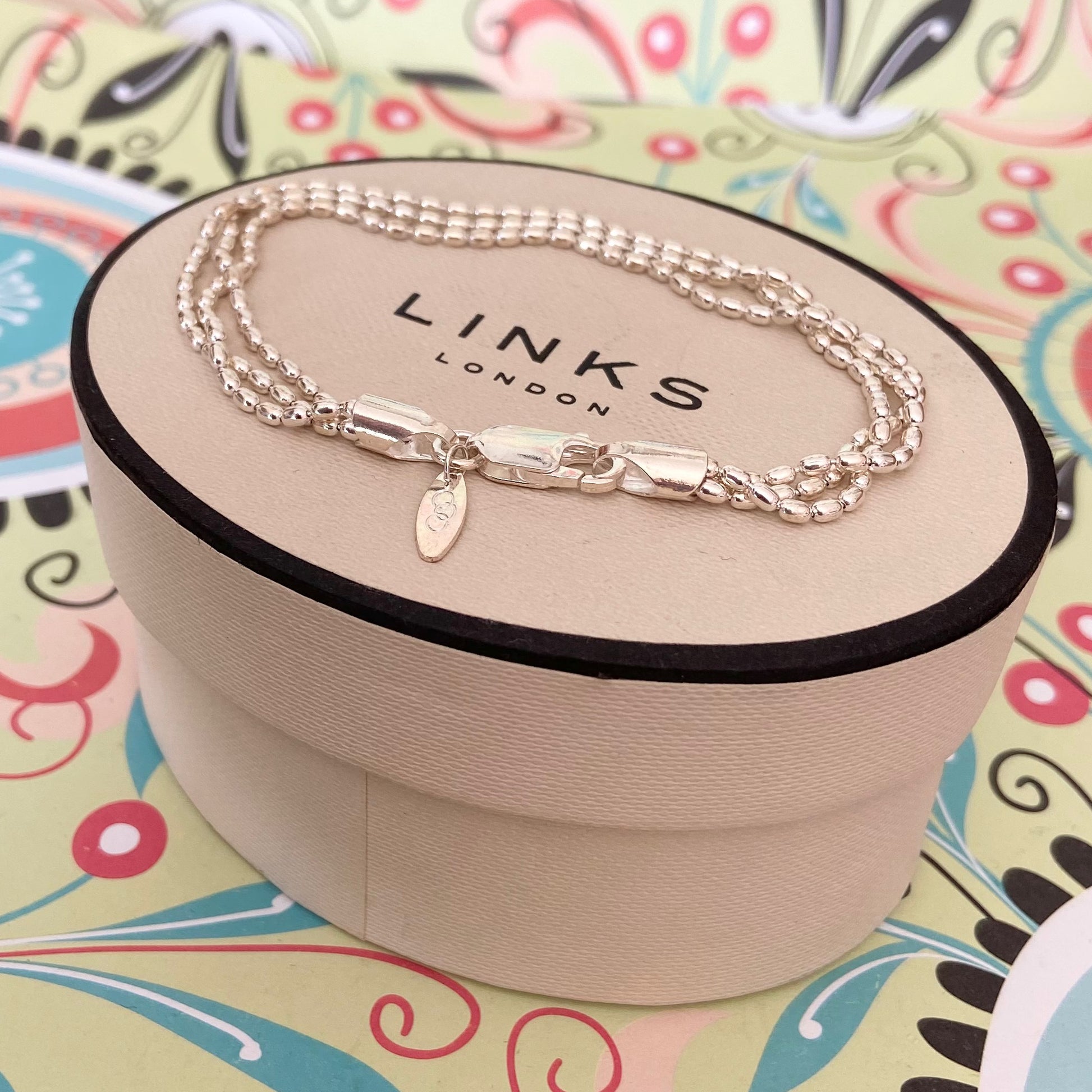 Fully Hallmarked Sterling Silver Three Strand Bracelet Links of London, features 3 rows of rice beads and is Hallmarked s925. The bracelet is a lovely statement piece and is 19.5cm end to end. The item comes with the Links of London Pouch and Box although there is minor wear to the box.