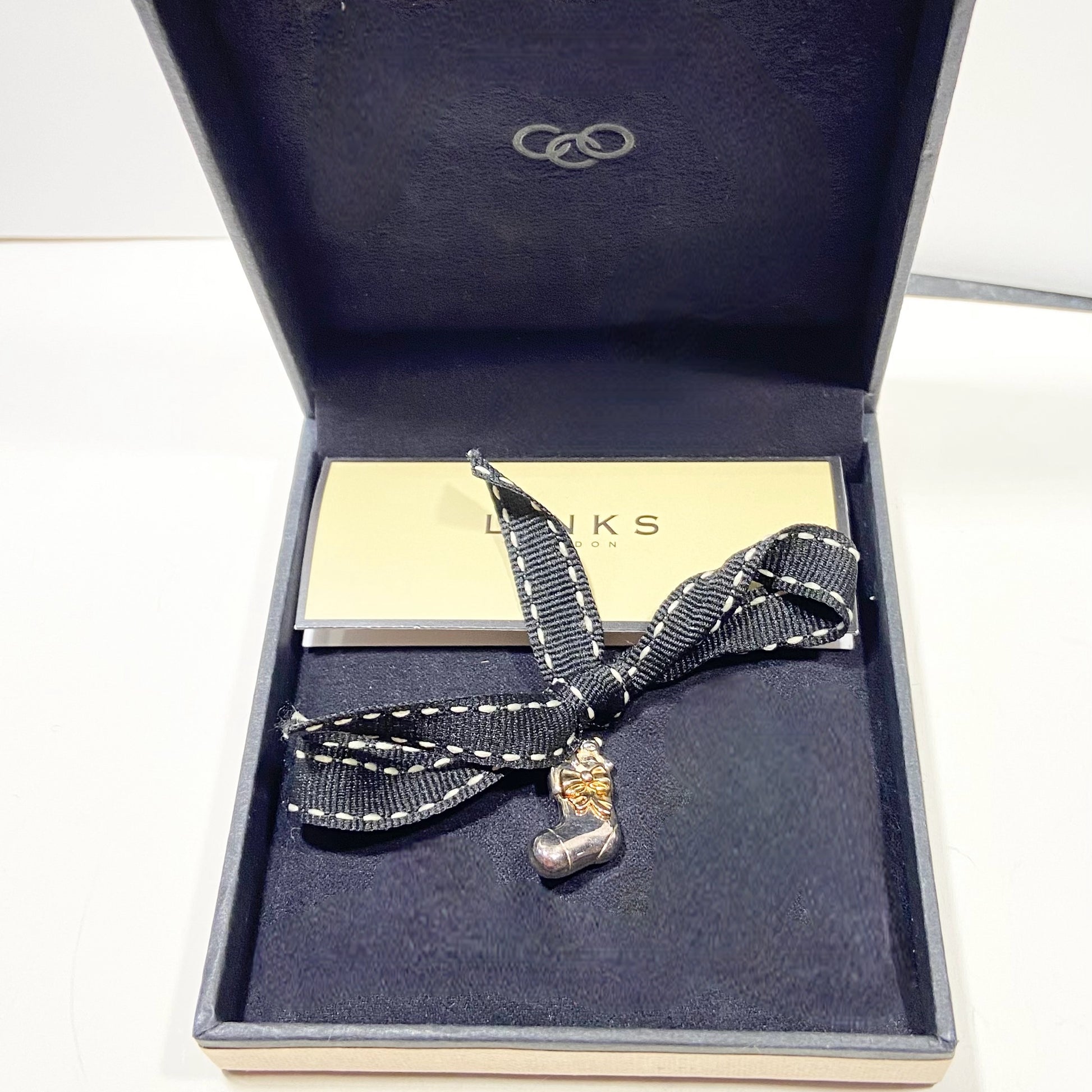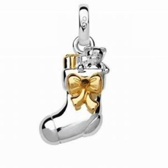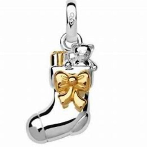 This item is brand new including the original box, which has minor wear as in the photographs. From Links of London their festive Charm range, this charm is made from 18 carat gold vermeil on a sterling silver base and sterling silver and features a stocking with a teddy bear and bow.
