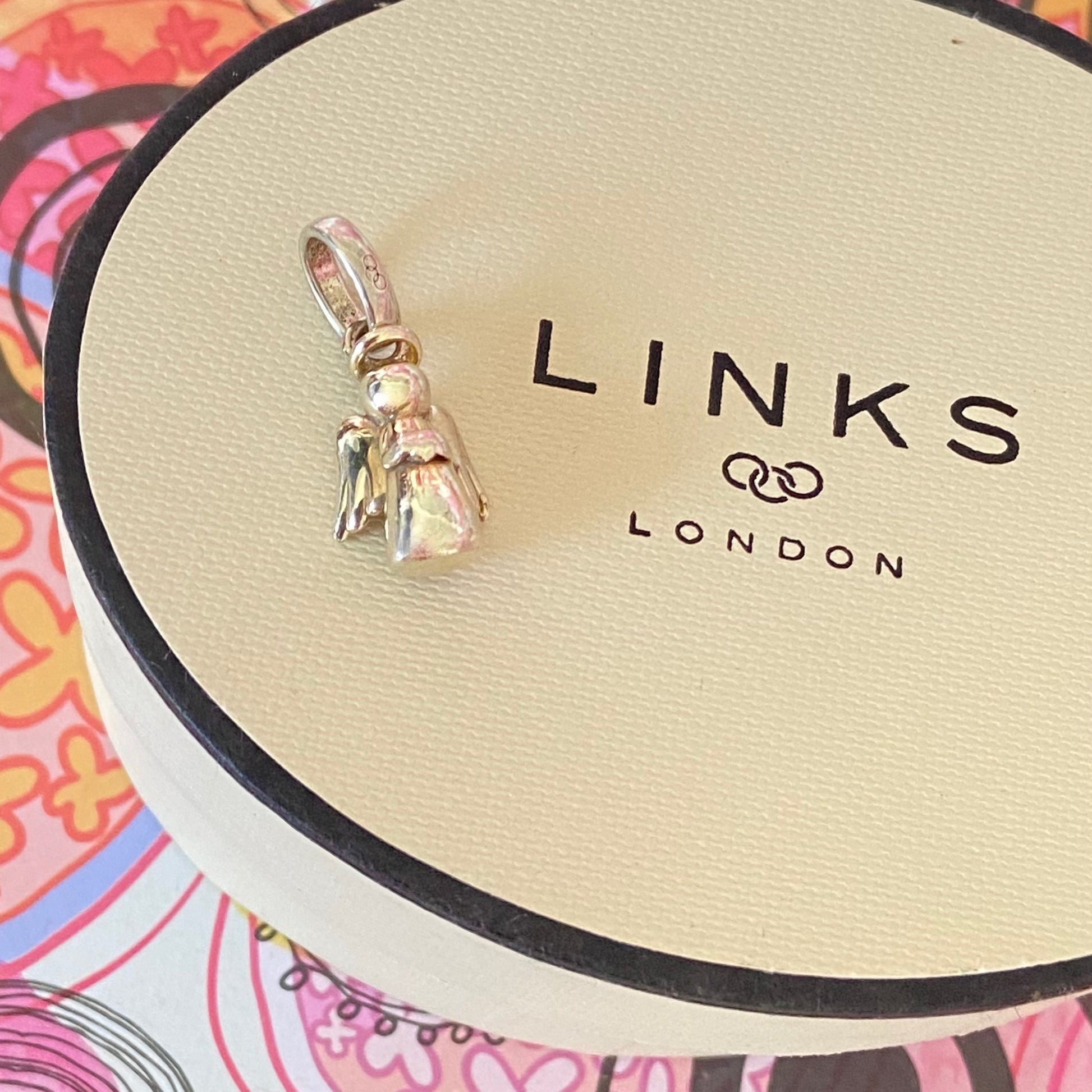 This lovely charm has lost its gold plate over time revealing the silver. This item has been crafted in sterling silver by Links of London. It would make a super affordable gift to that special person. The charm has the Links of London Logo and the s925 Stamp inside the bale. It has been cleaned and polished to make this a lovely gift for that special person