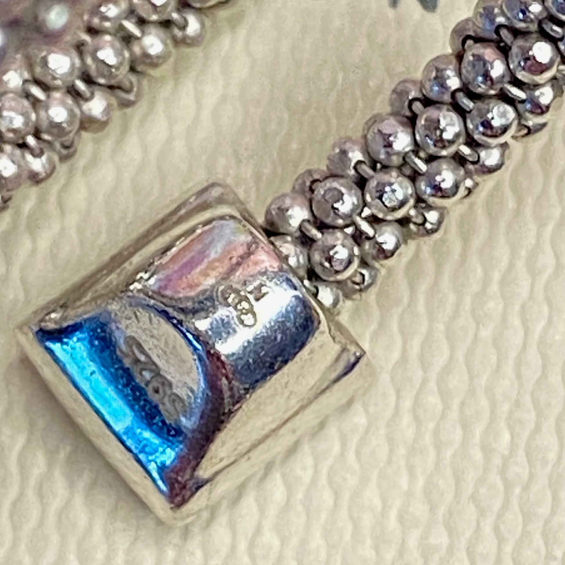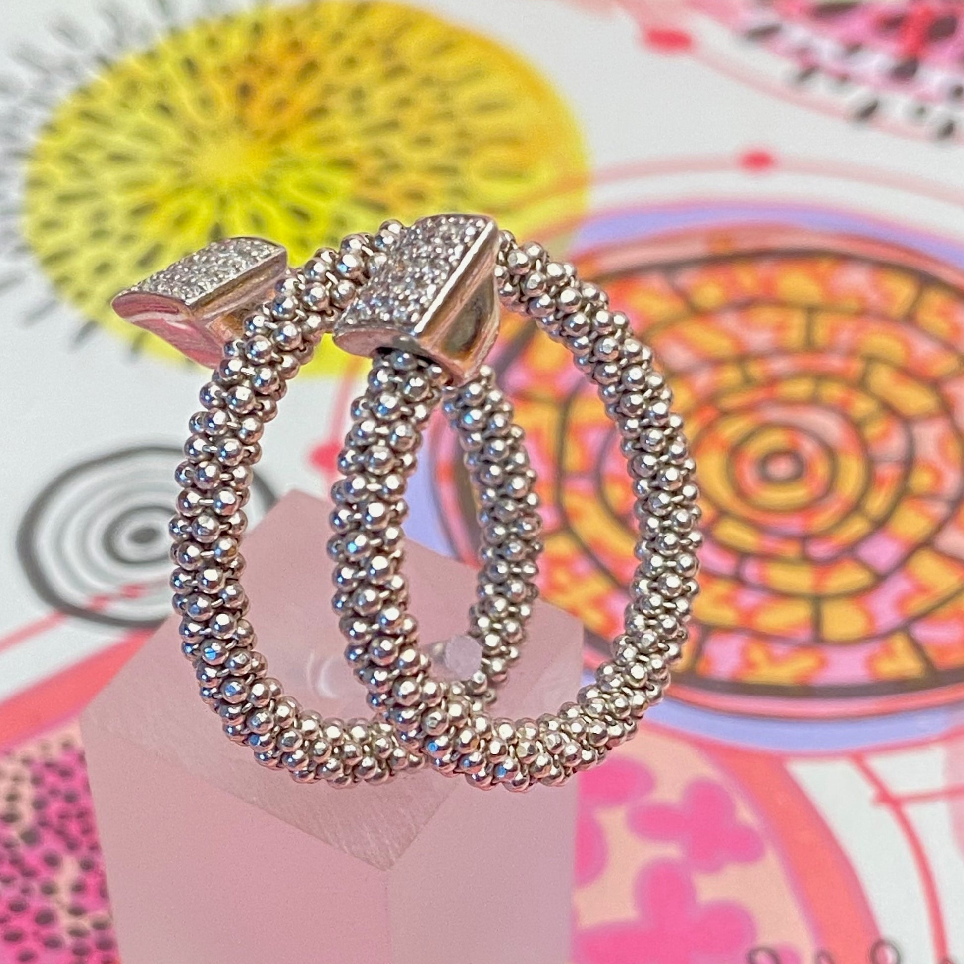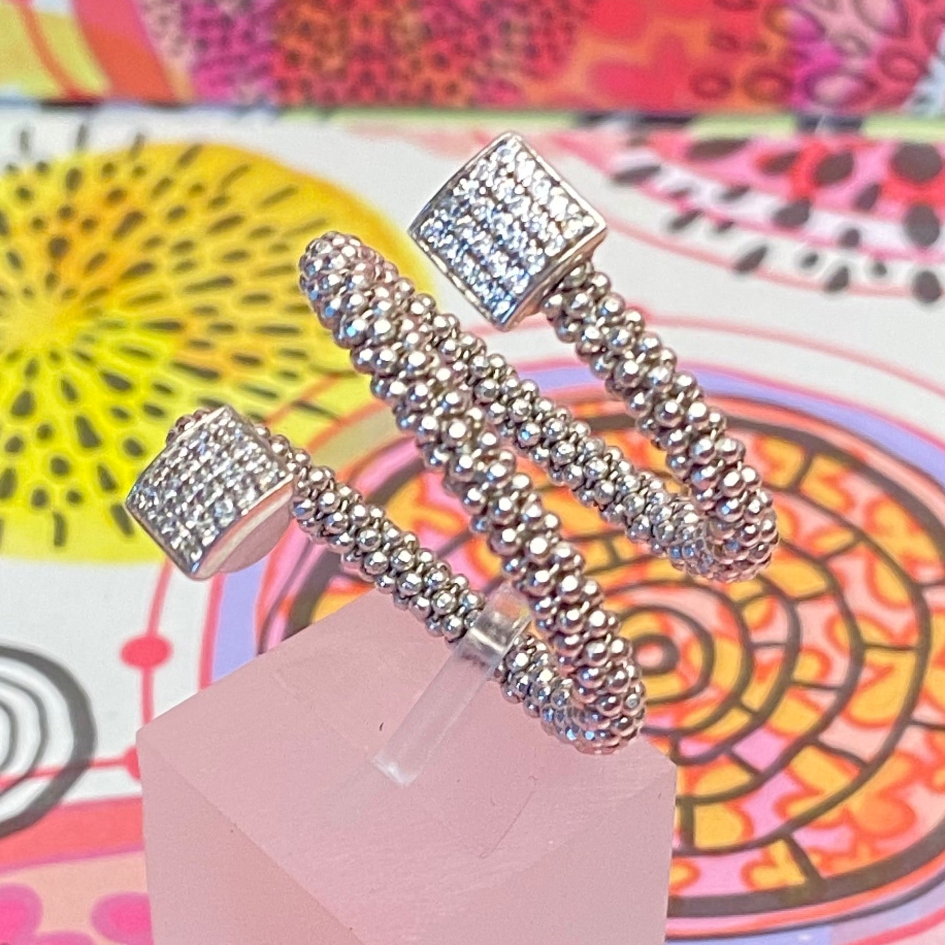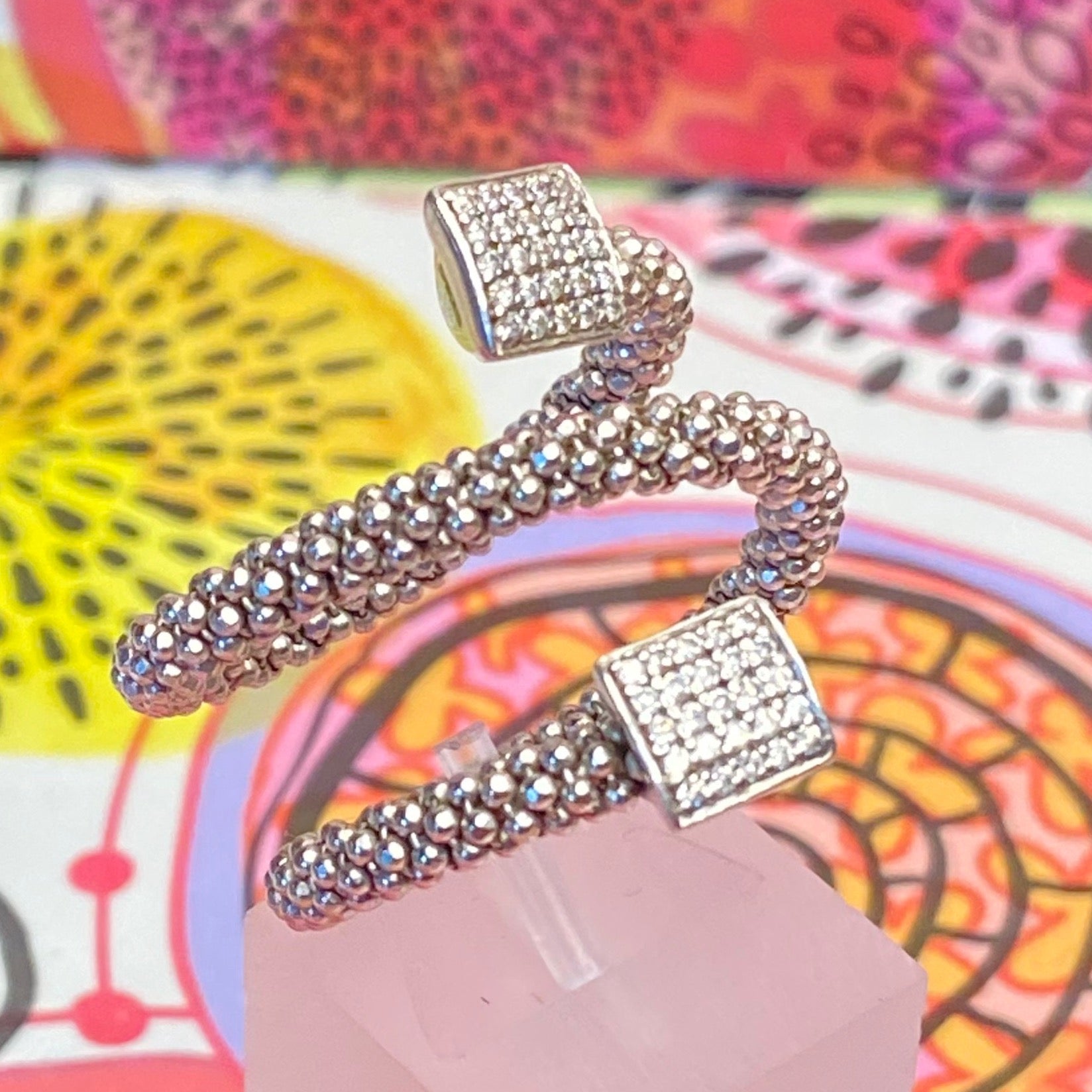 A square Barrel of Cubic Zirconia pave encrusted sterling silver bead, sparkles with glamour. Wrap it around your finger and a sleek, statement ring. The best thing about this ring is its versatility. By day, worn alone, it's a sprinkling of glamour. You certainly get noticed with this ring. The bubbles are inspired by the bubbles of champagne and the sparkle of the galaxy.