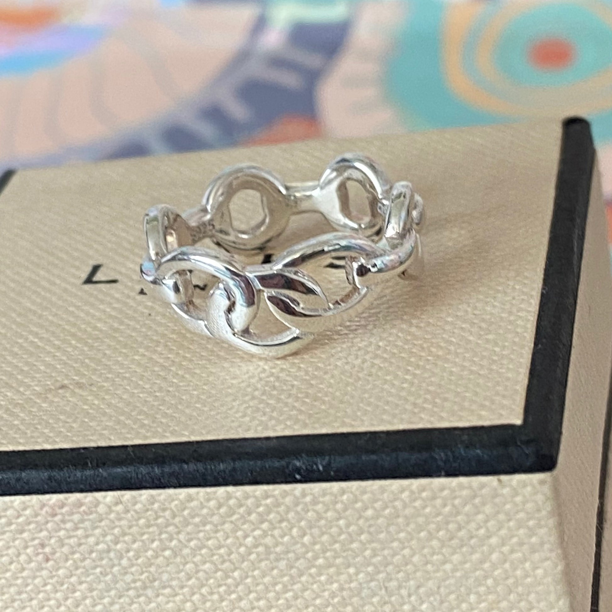 The Tri Link Ring Size L, is crafted from Sterling Silver by the Iconic Links of London Jewellers. The ring is a size L, with S925 and the Links of London official Hallmarks.