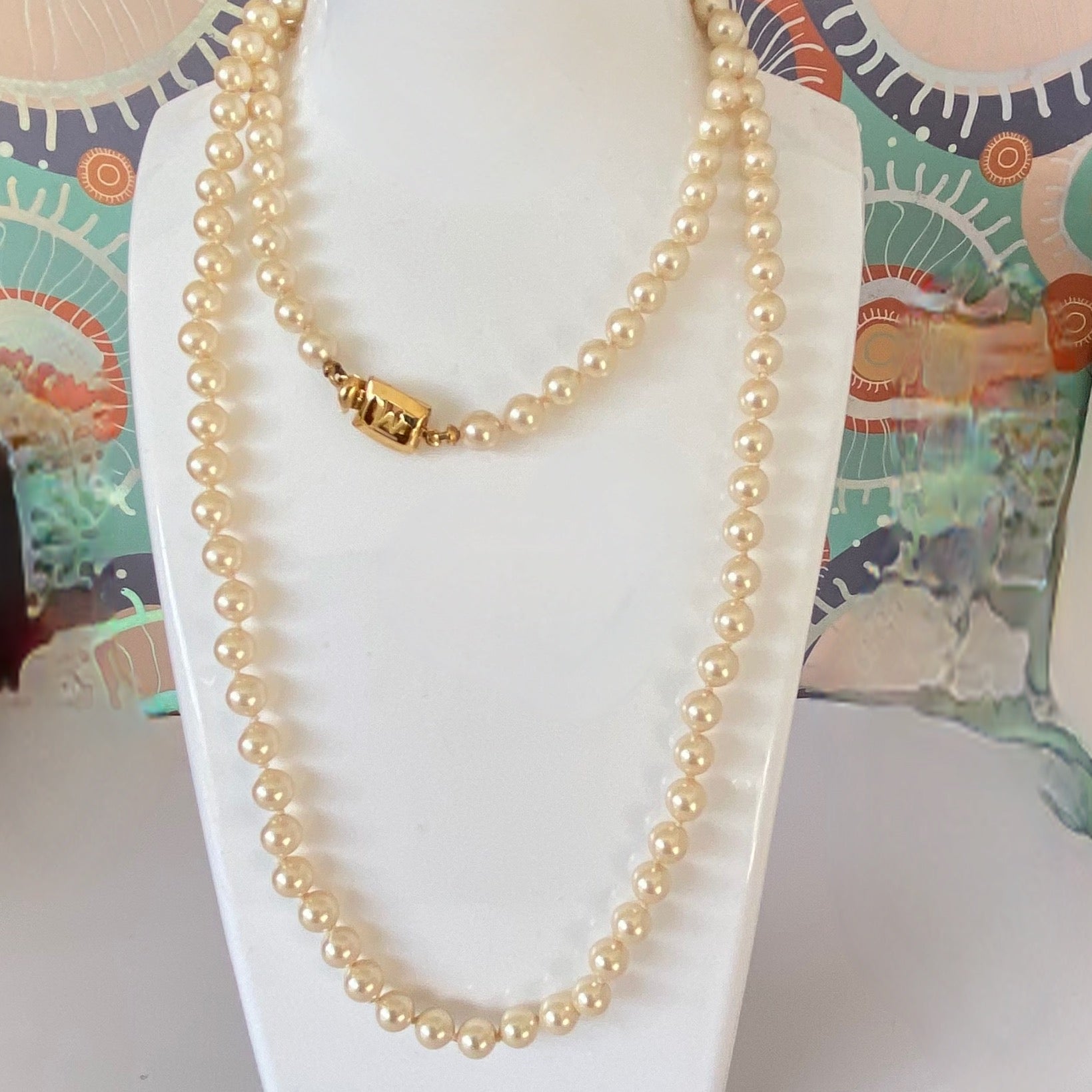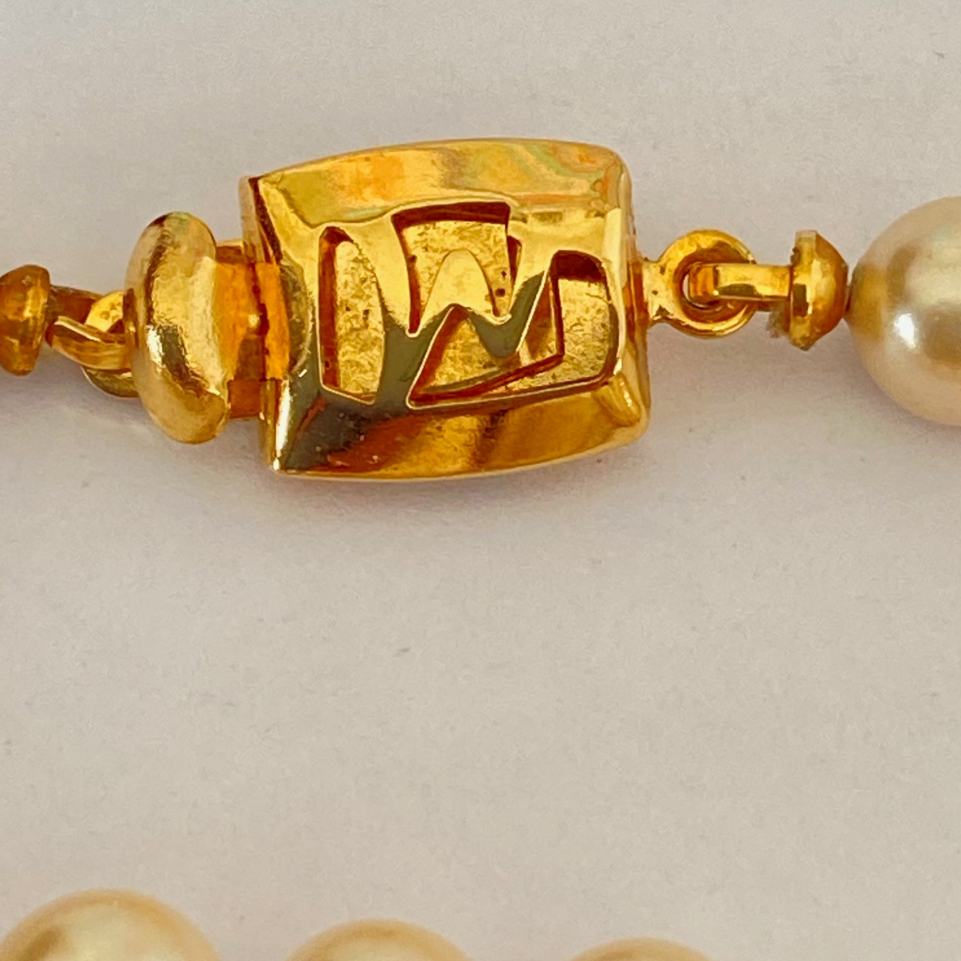 The Single row of faux pearls with a gold tone clasp with the M logo and Monet Signature on the back. The Necklace is 74cm end to end Long with each bead 0.5mm wide.