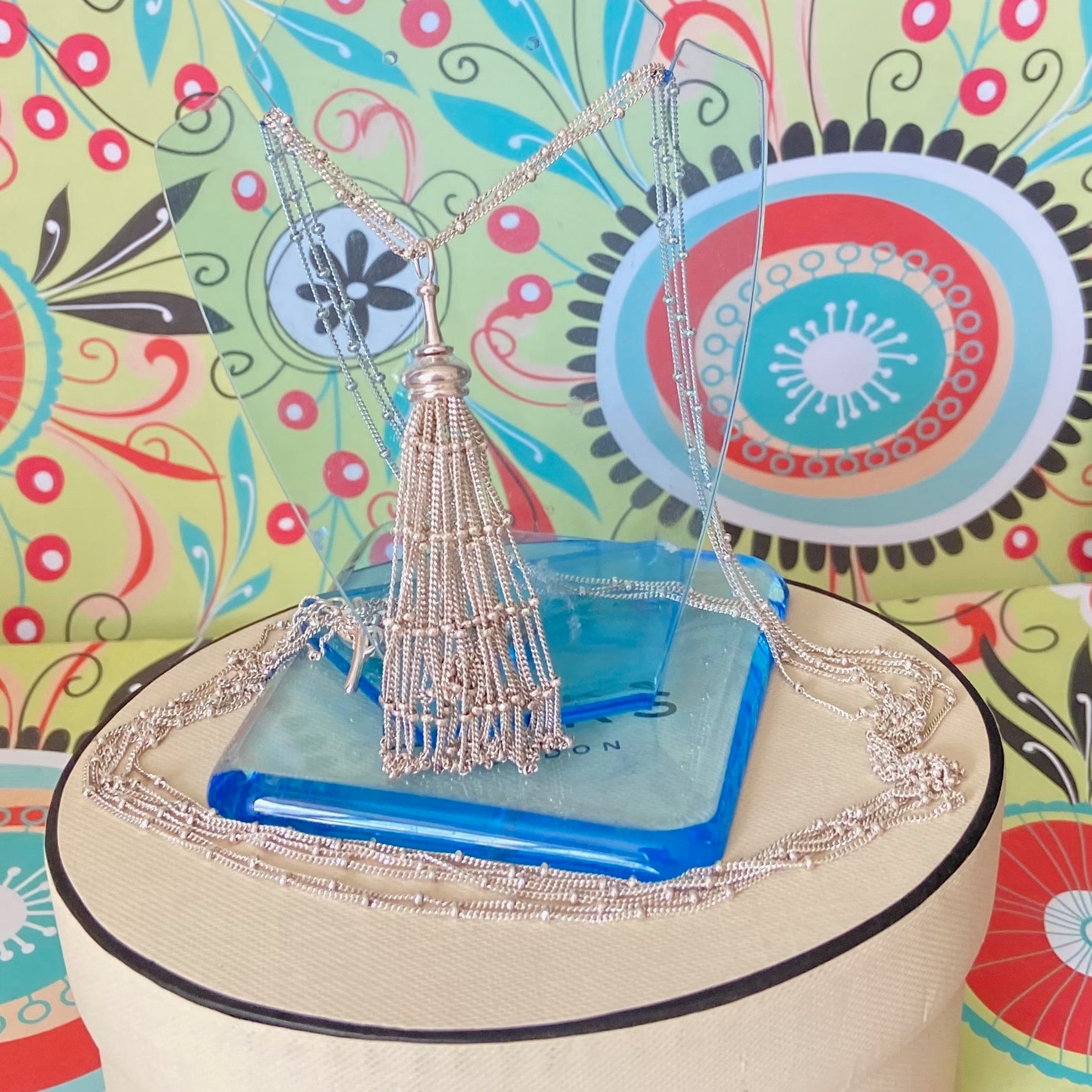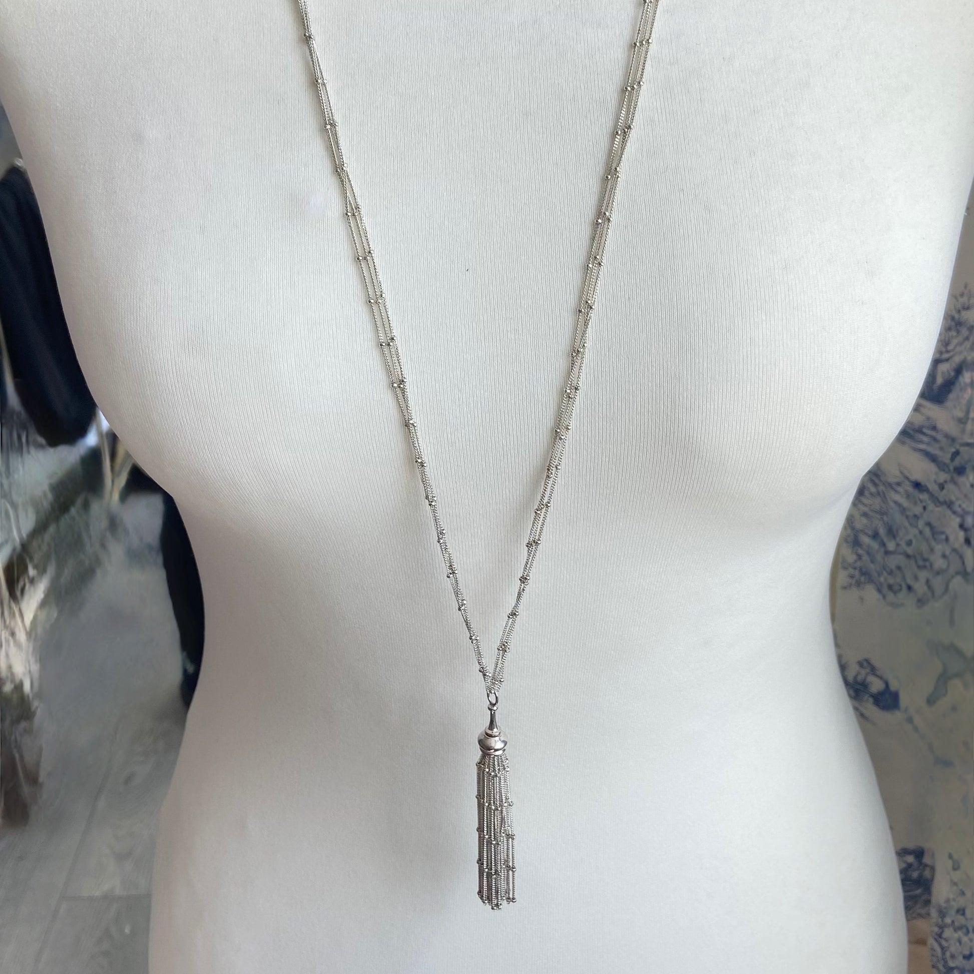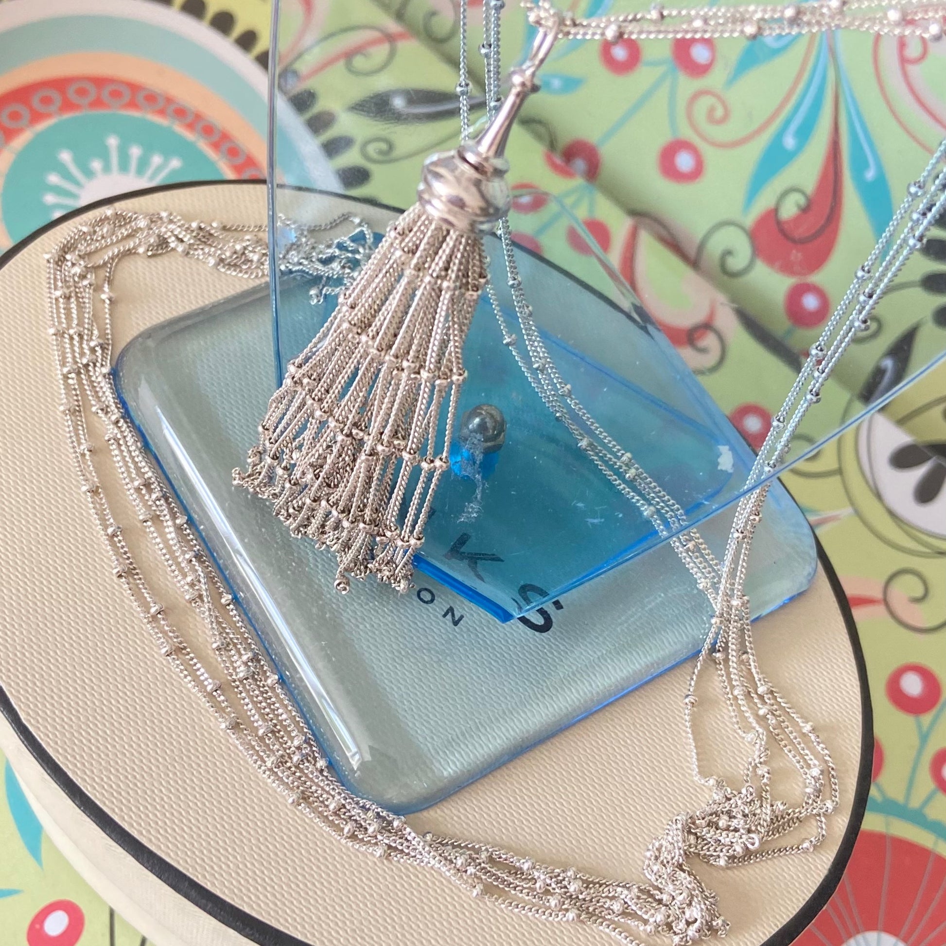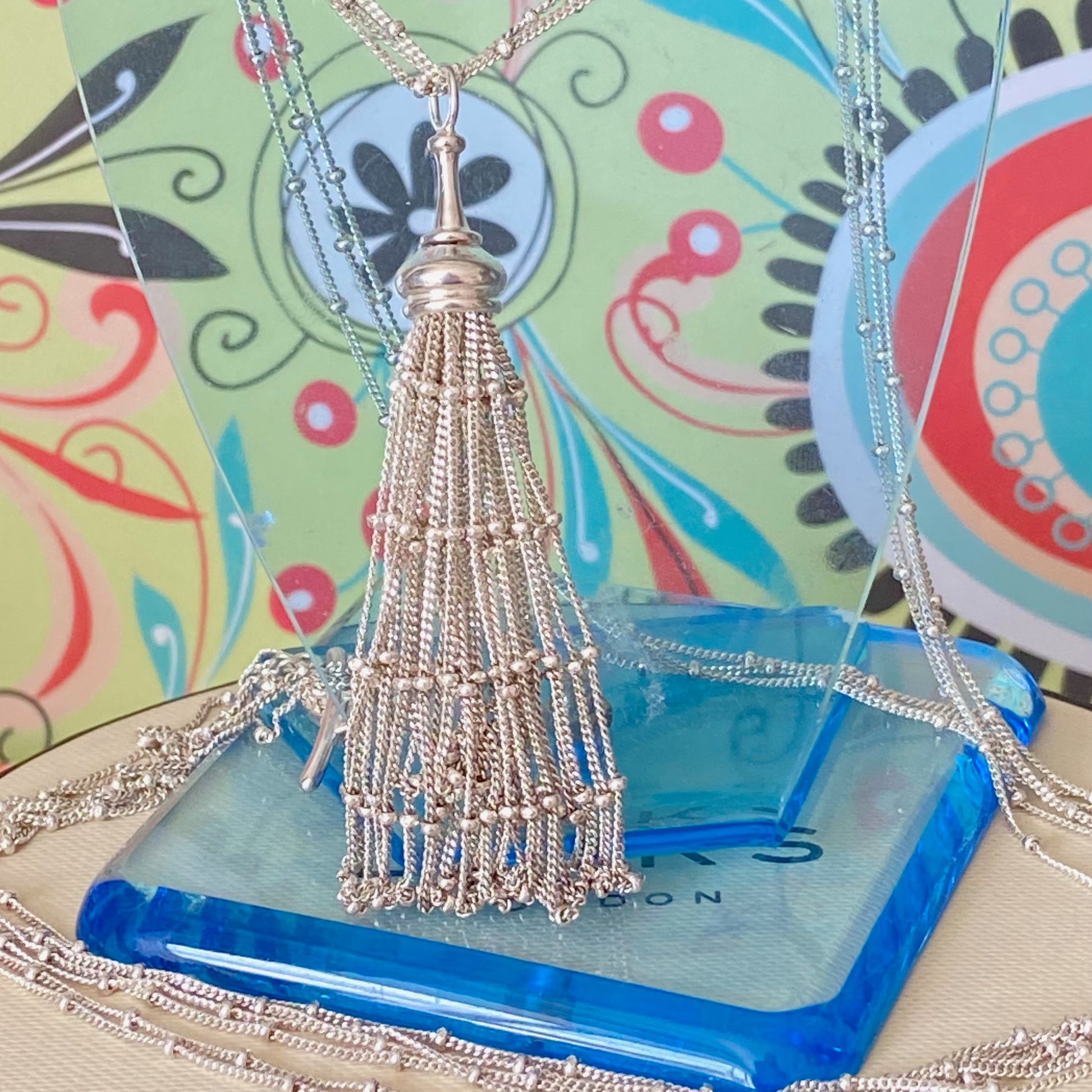 Multi Strand necklace with tassel, can be worn as a long necklace or can be doubled up to make it smaller. T bar clasp, stamped 925 Sterling Silver