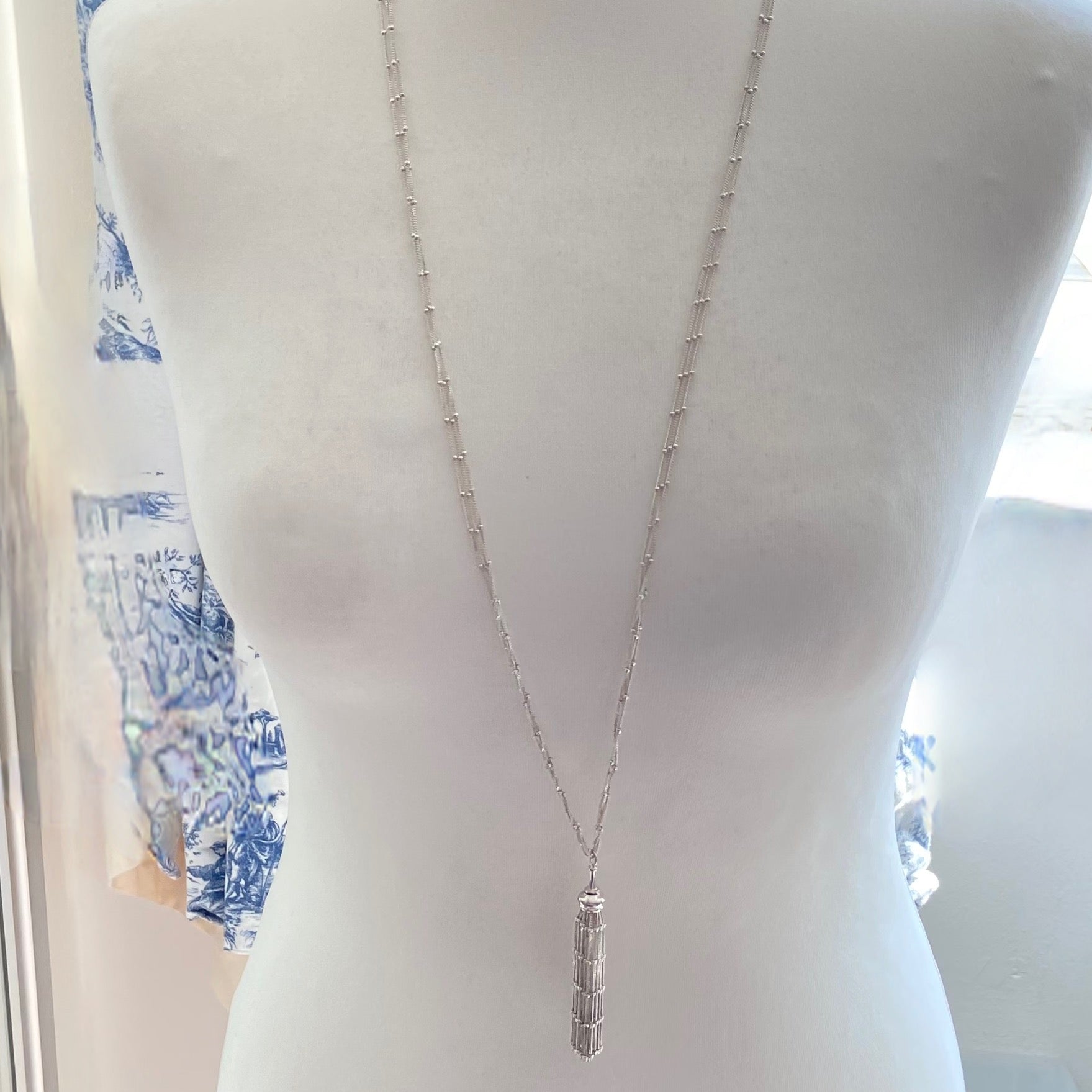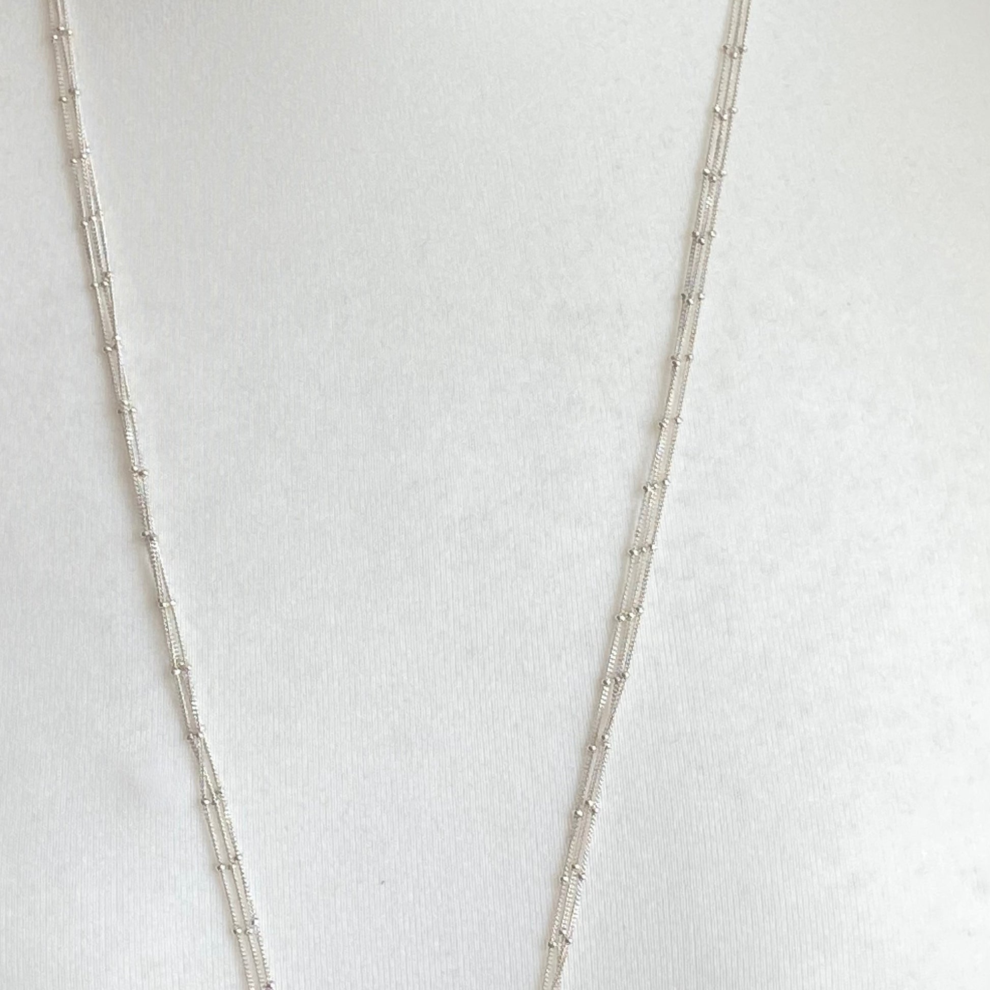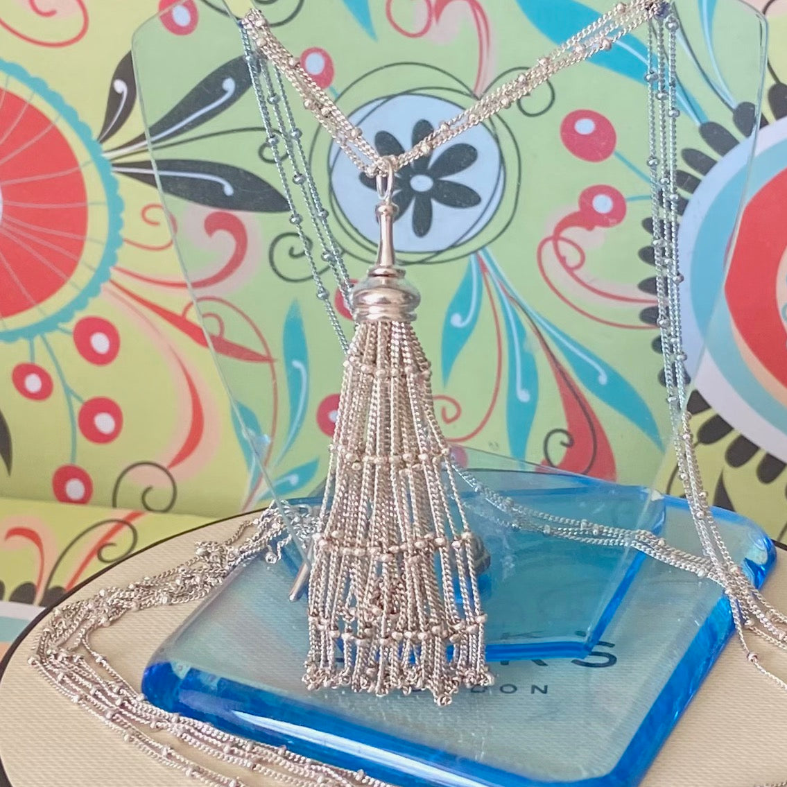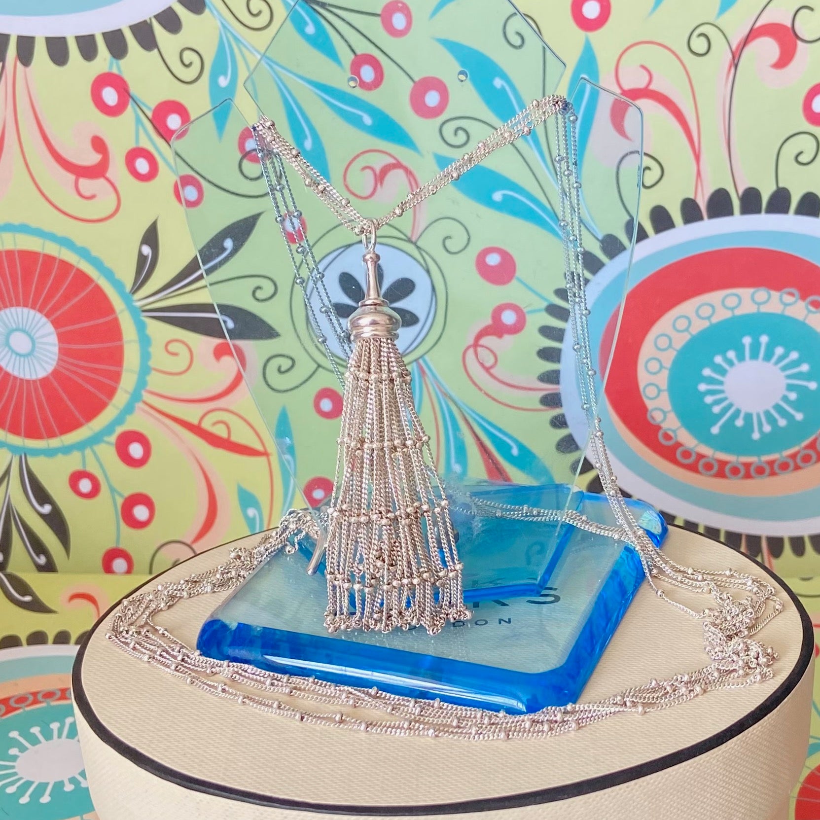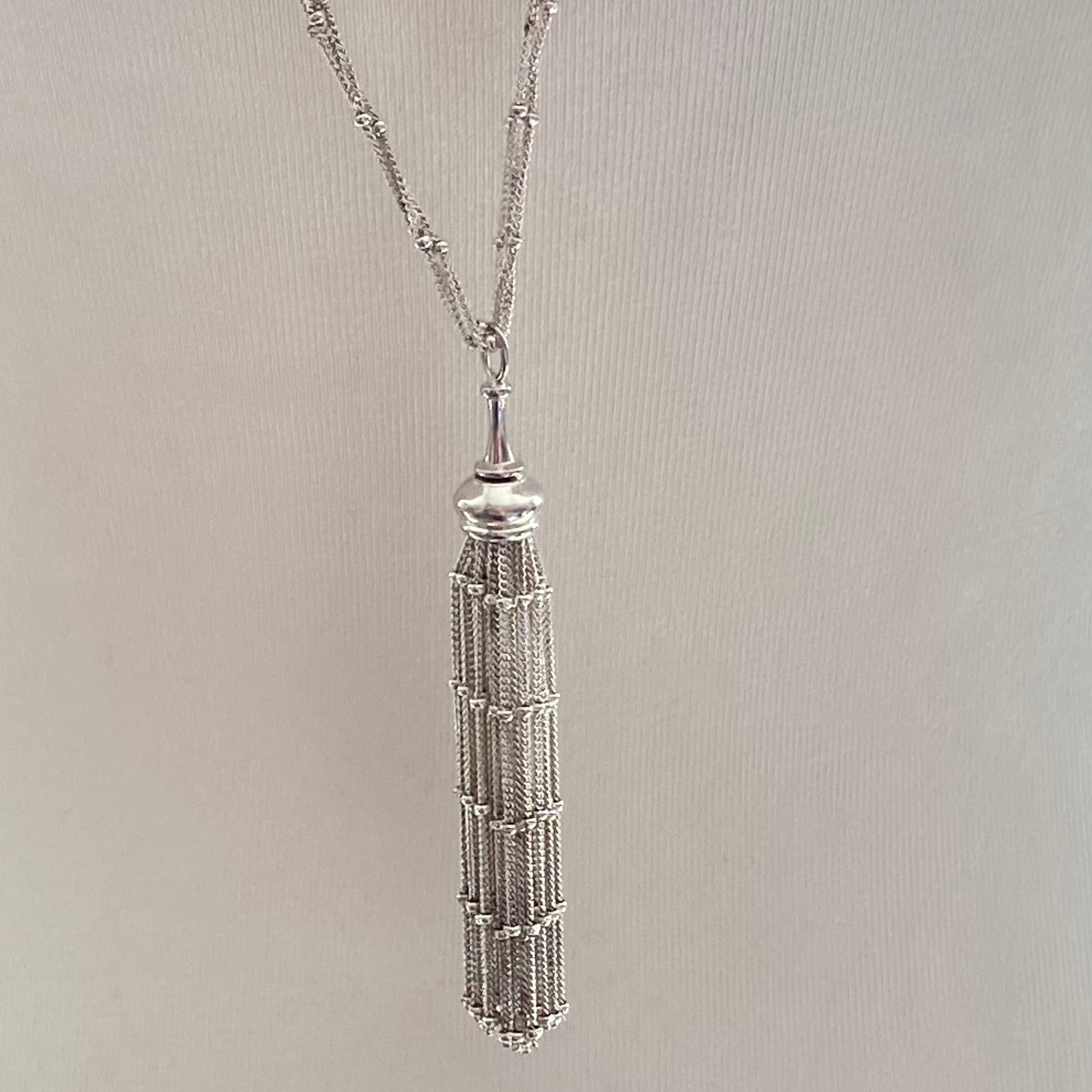 Multi Strand necklace with tassel, can be worn as a long necklace or can be doubled up to make it smaller. T bar clasp, stamped 925 Sterling Silver