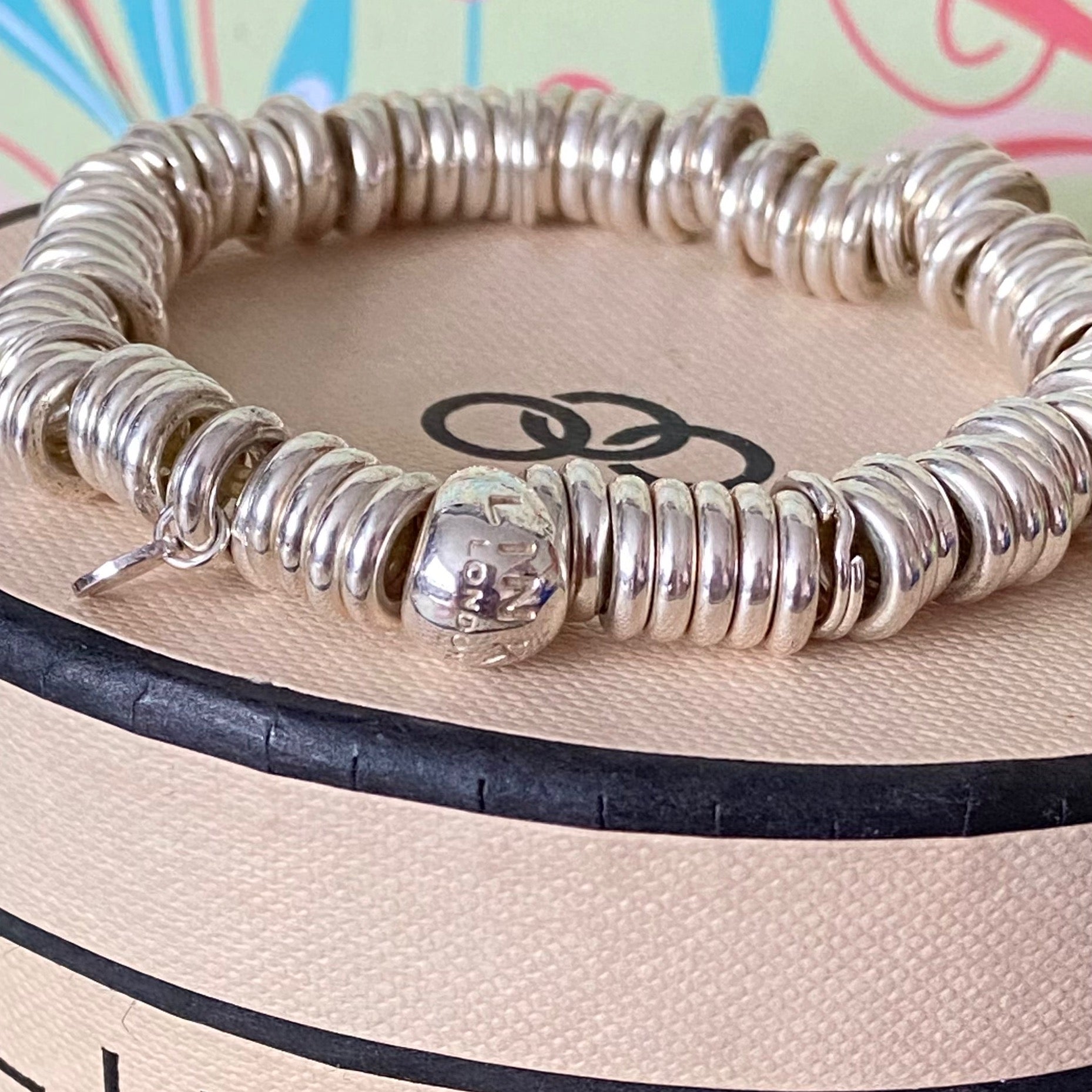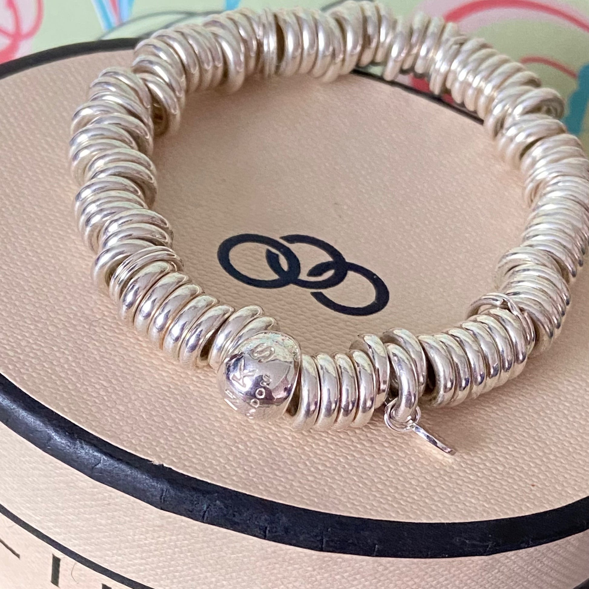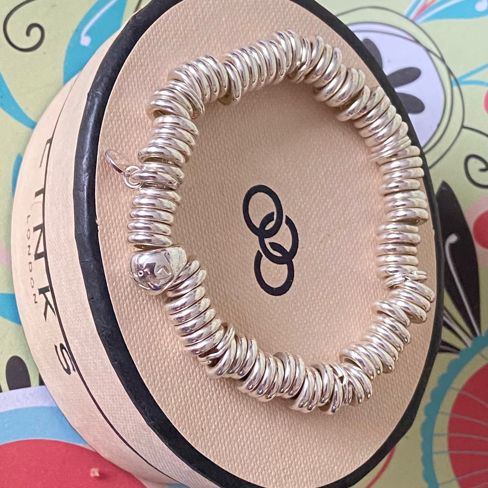 The Links of London three ring Logo is on the Bracelet with the silver bead and Links Logo tag displays their unique Links of London Sterling Silver Hallmarks.