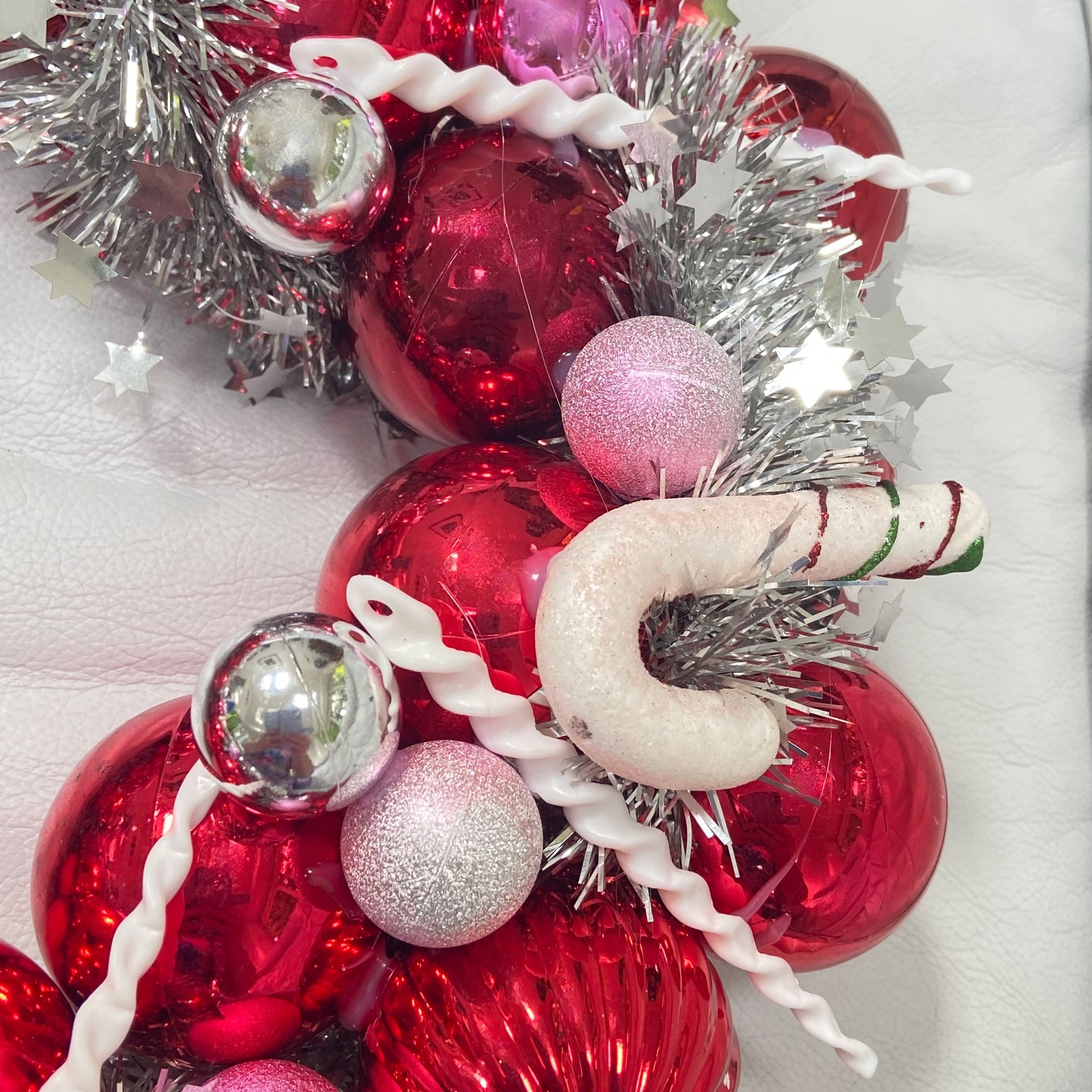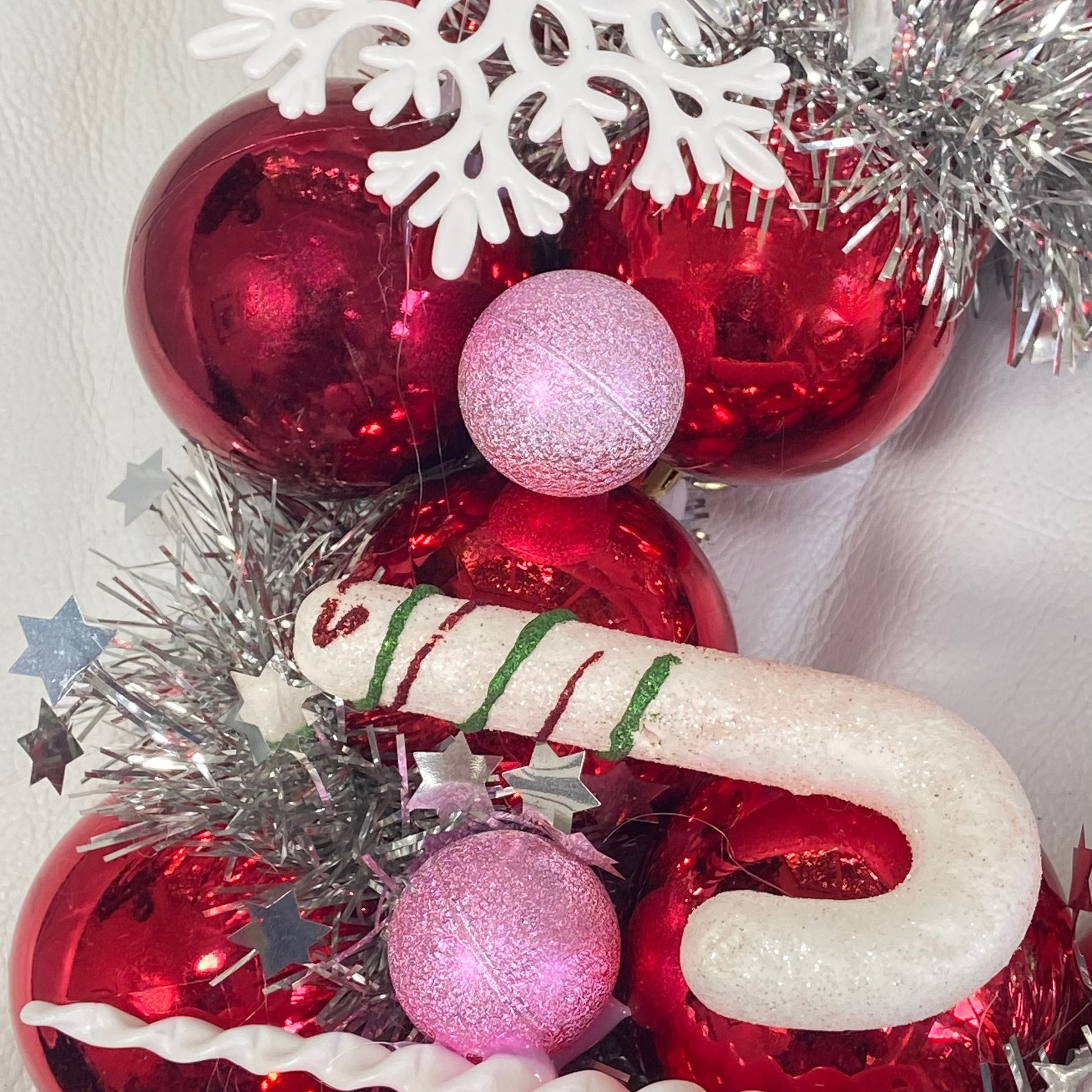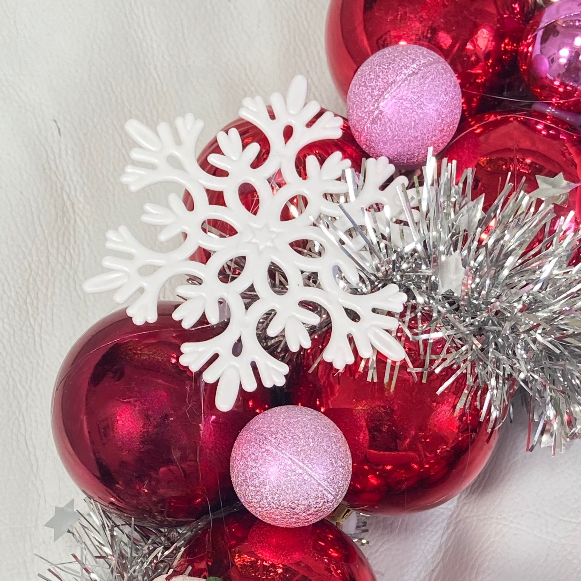 The Wreath is a mix of baubles in stunning tones of Red, silver and White with tinsel to add that extra sparkle and when placed outside it moves with the wind creating a lovely moving shimmer.