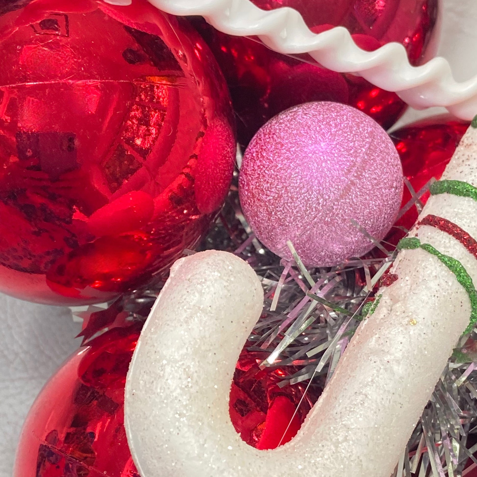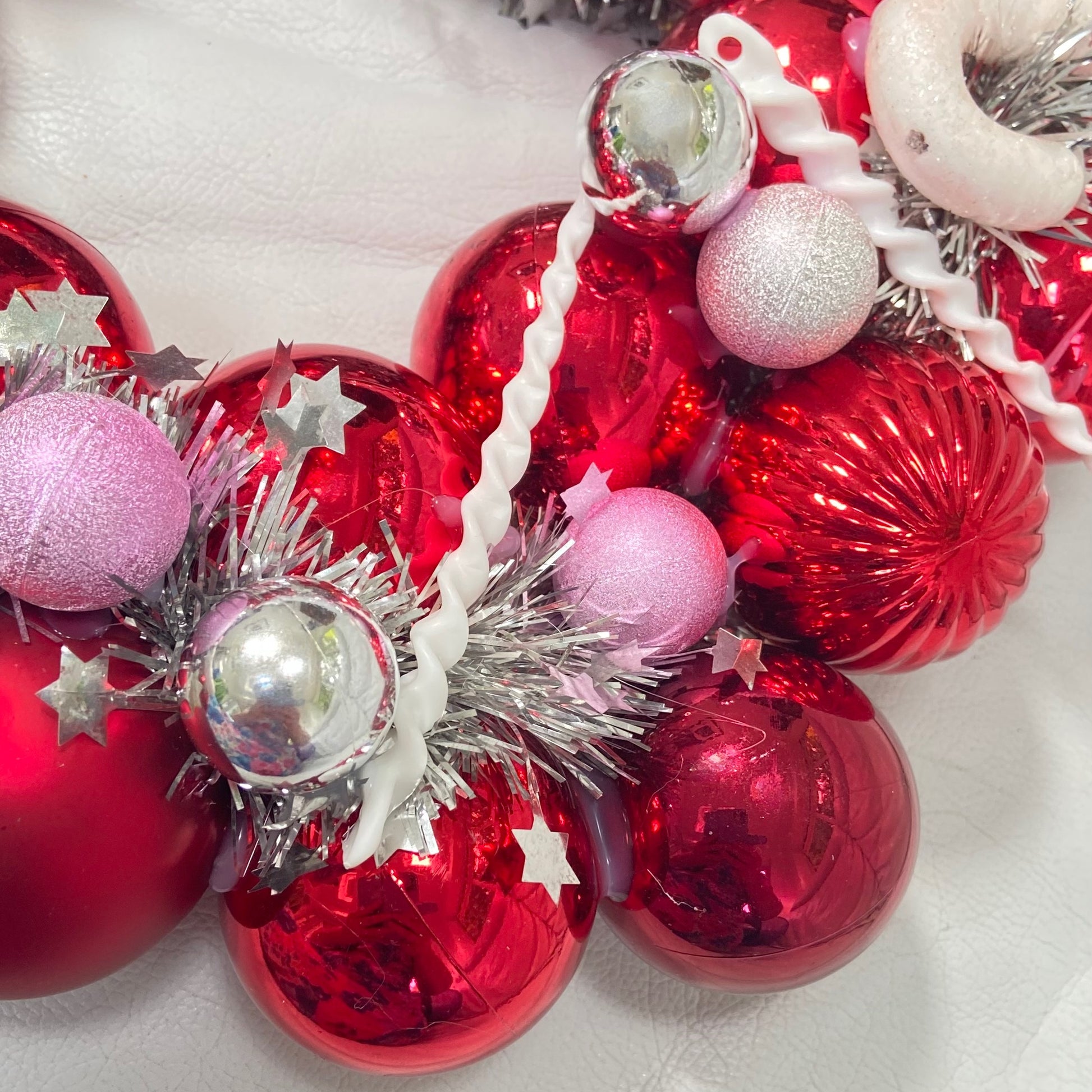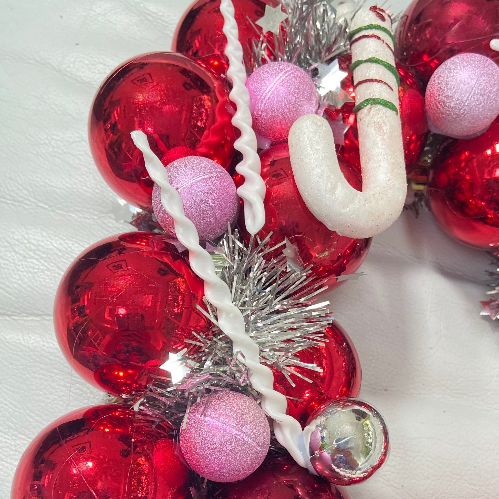 The Wreath is a mix of baubles in stunning tones of Red, silver and White with tinsel to add that extra sparkle and when placed outside it moves with the wind creating a lovely moving shimmer.