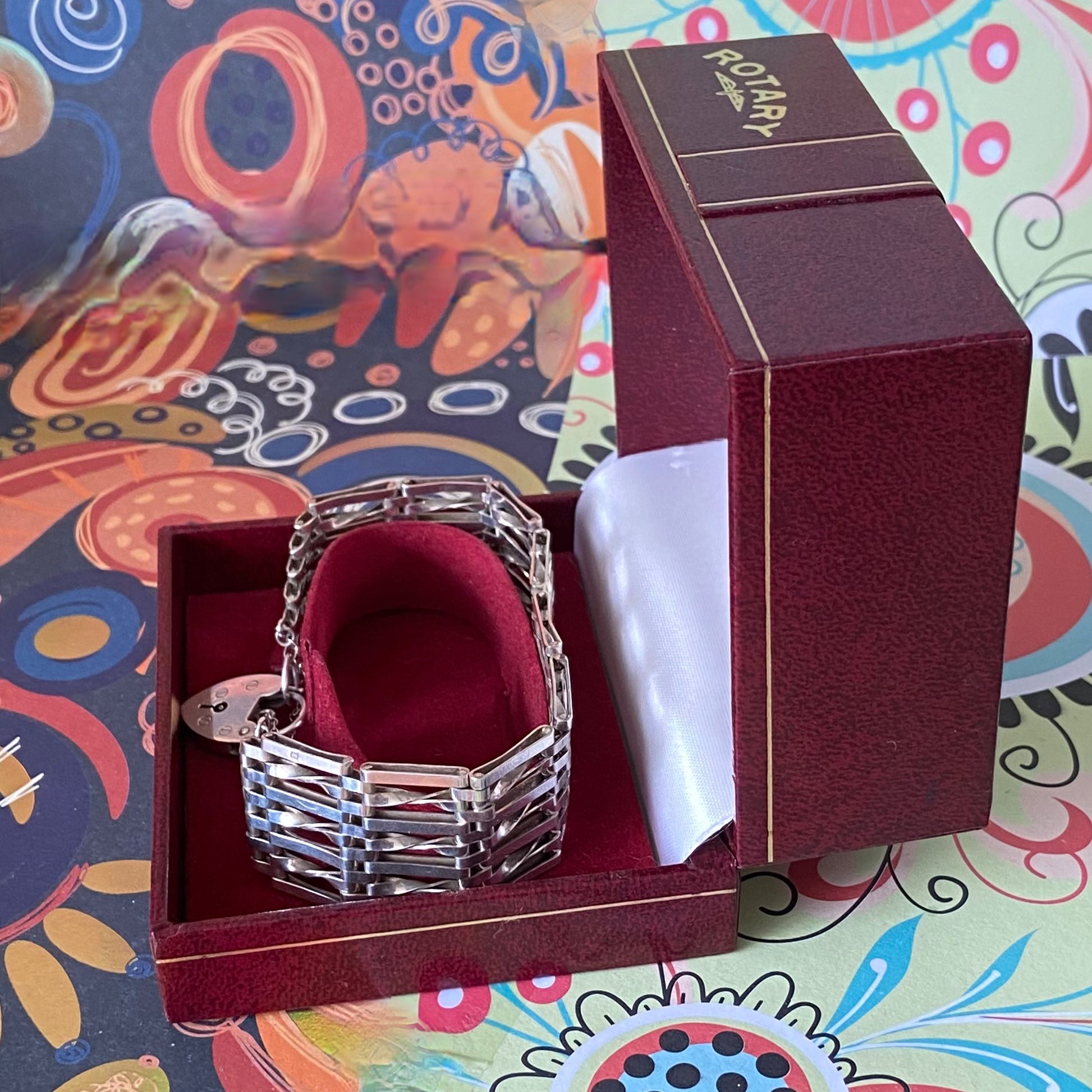 This vintage Sterling Silver 7 Gate Bracelet, is absolutely stunning, with a safety chain and Hallmarked Padlock. Please see the photos for Hallmarks.