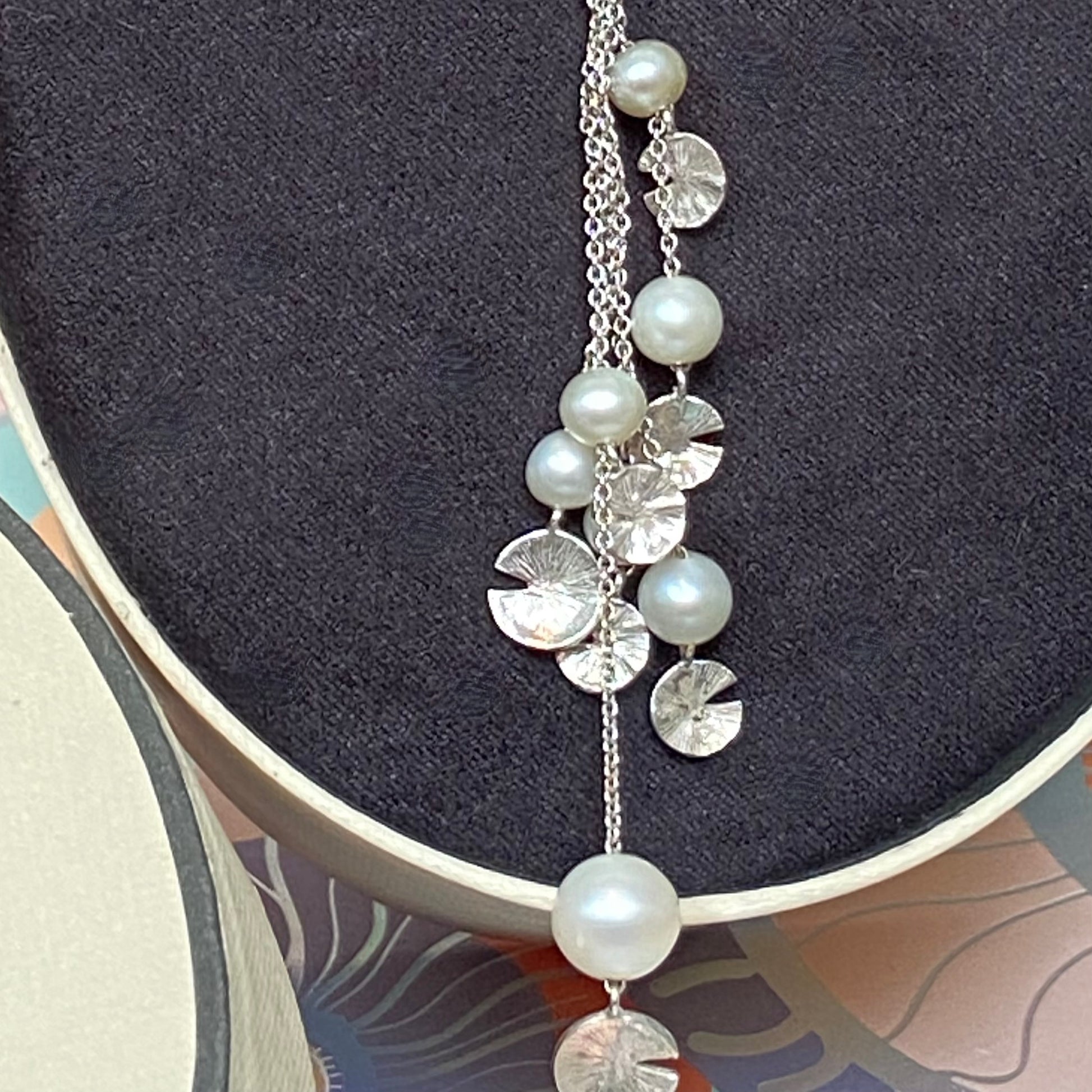 Fully Hallmarked 925 Sterling Silver and Pearl Necklace with silver Lilly Pads dropping from a chain. This would make a super gift and the perfect addition to a stylish jewellery collection.