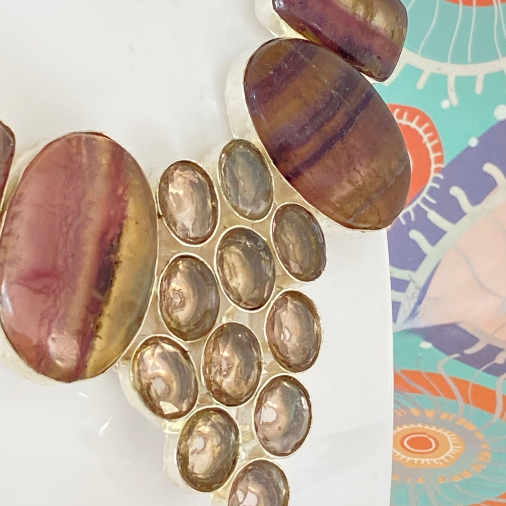 This lovely necklace covered in Fluorite Rainbow Gemstones, making a very dramatic statement.