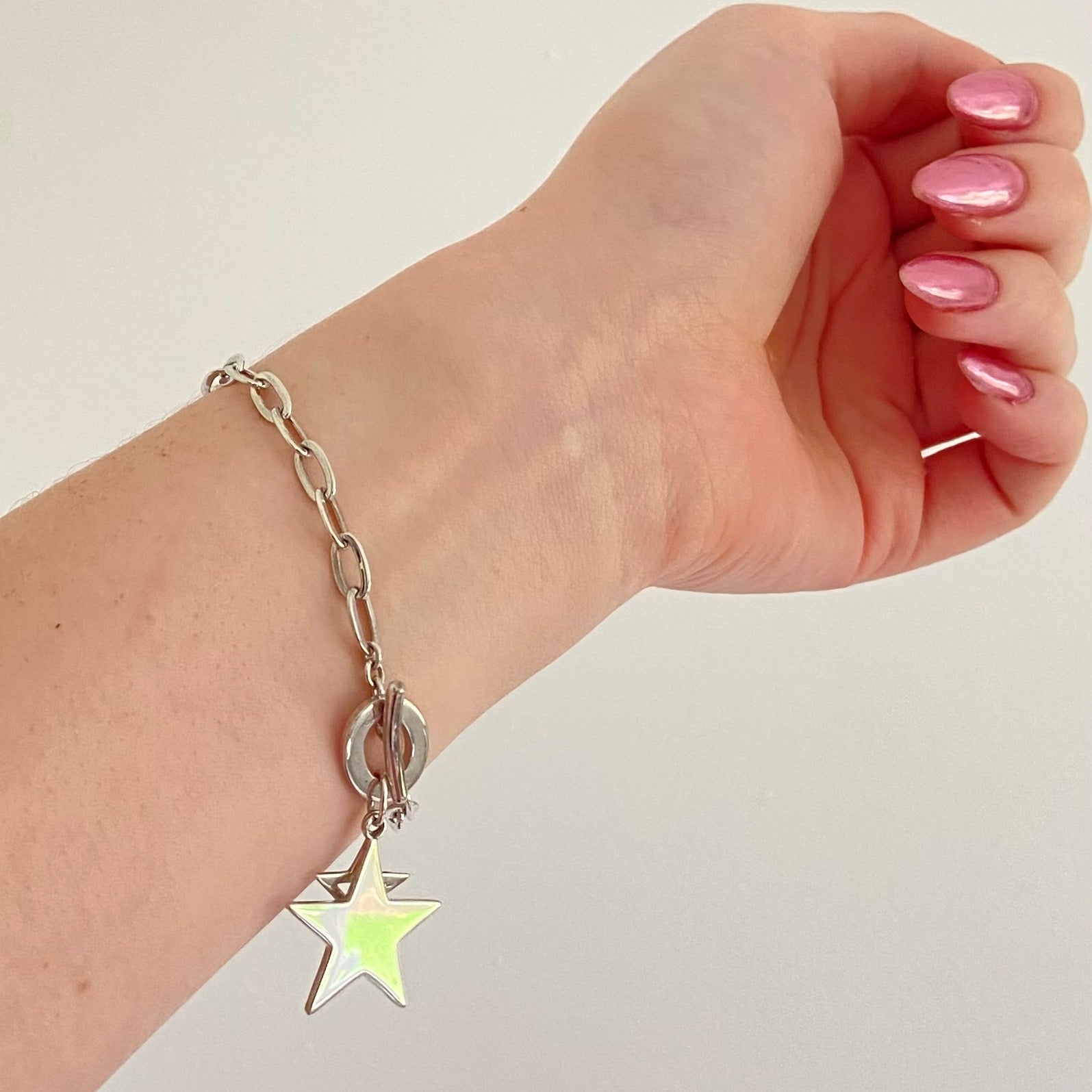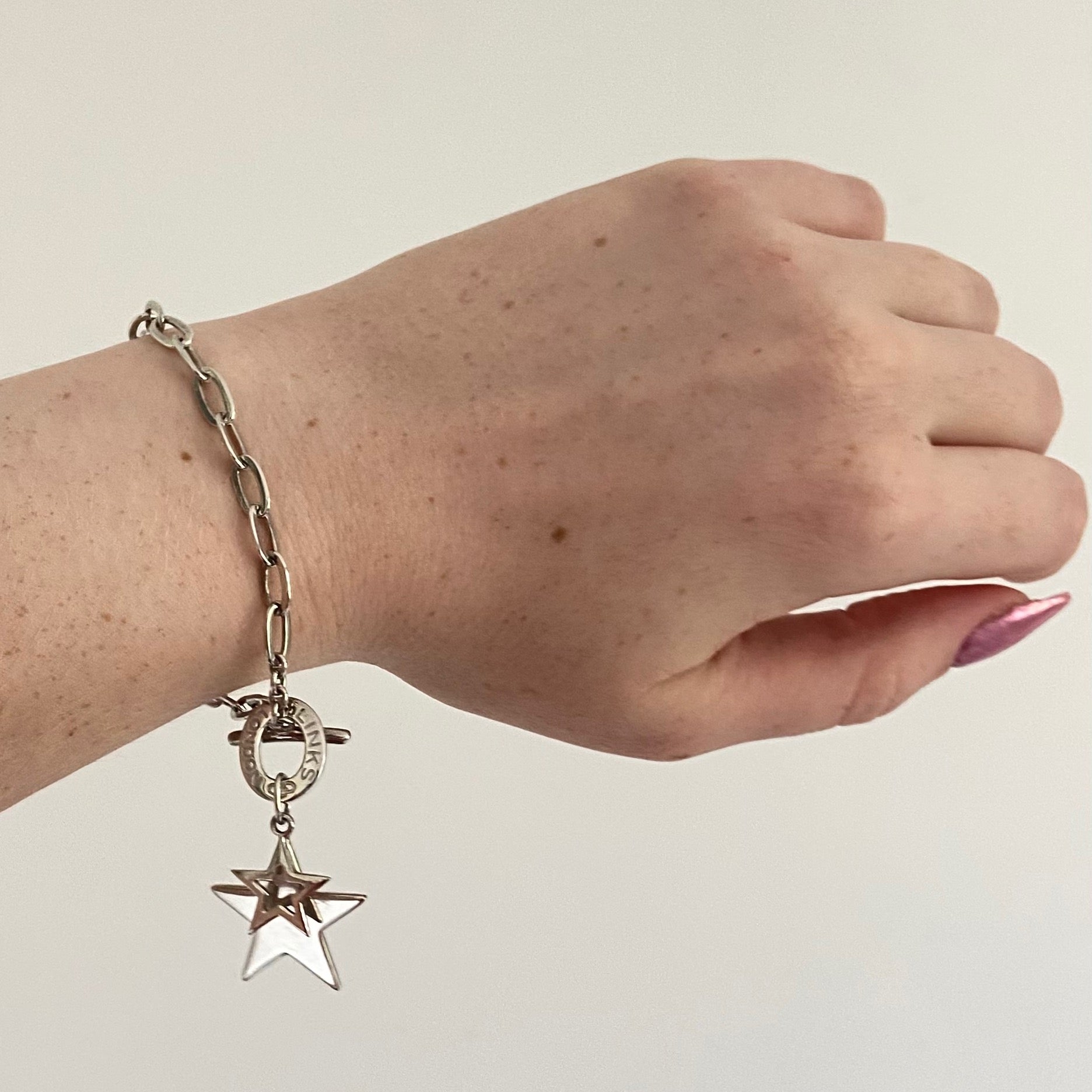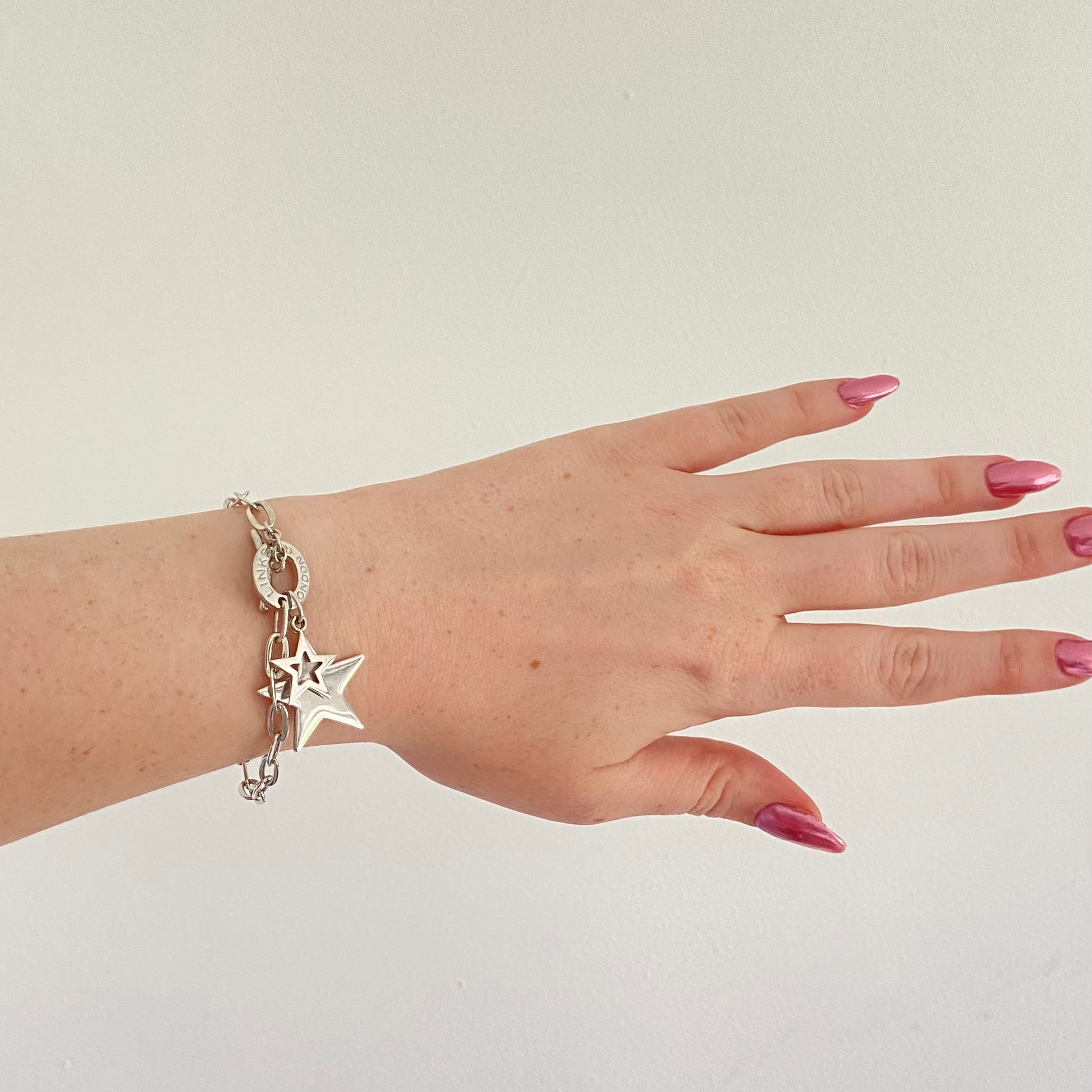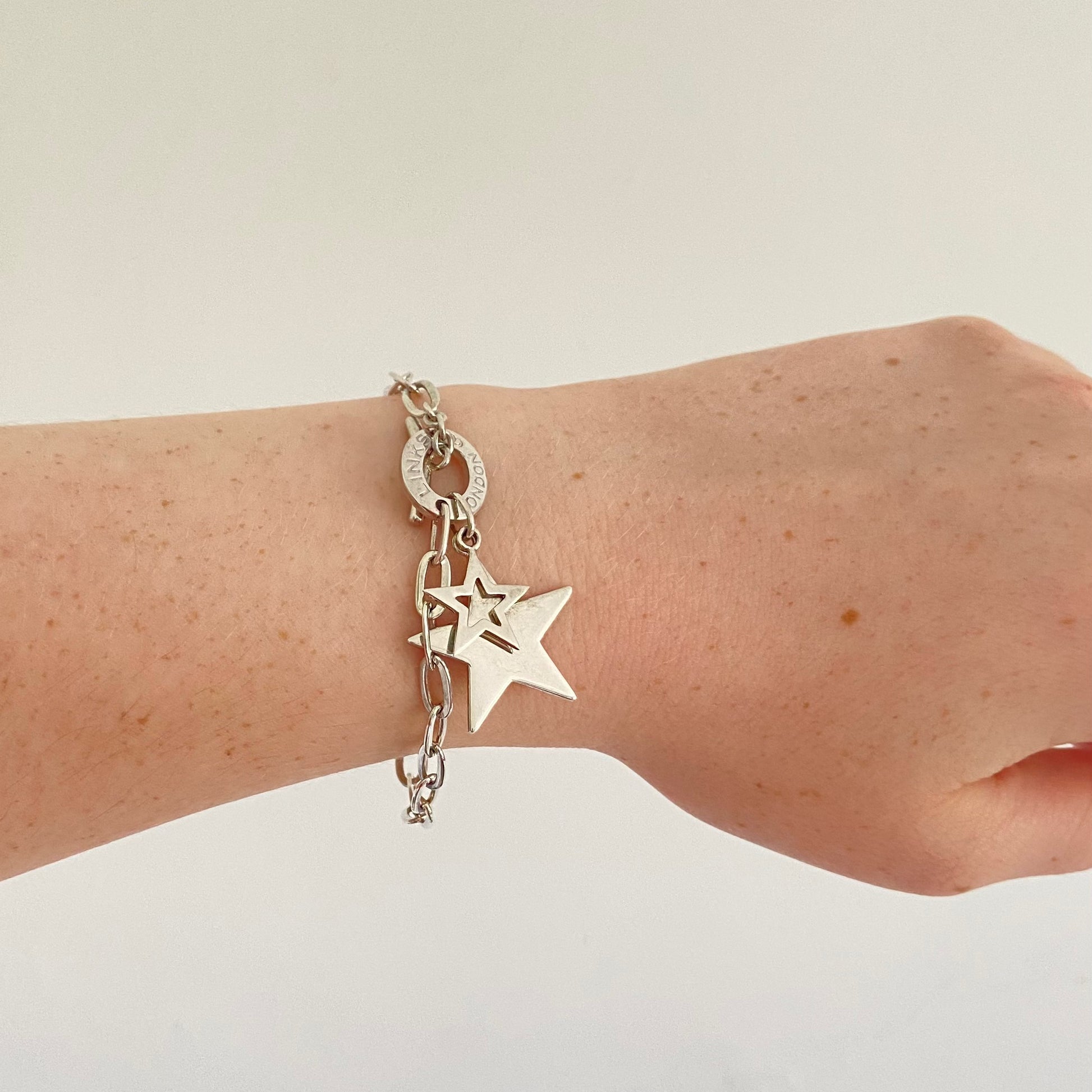 Links of London Sterling Silver Toggle Bracelet with two Stars. Fully Hallmarked and in New Condition with the Links of London Authentic Slim box. The oval link chain offers a classic appearance, with a T Bar clasp to secure the bracelet. The two stars highly polished offer that extra bit of glamour. Quite a lovely find this bracelet and quite rare.