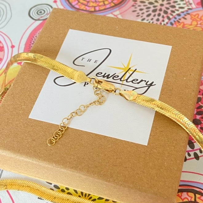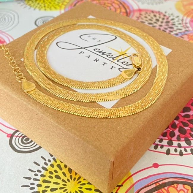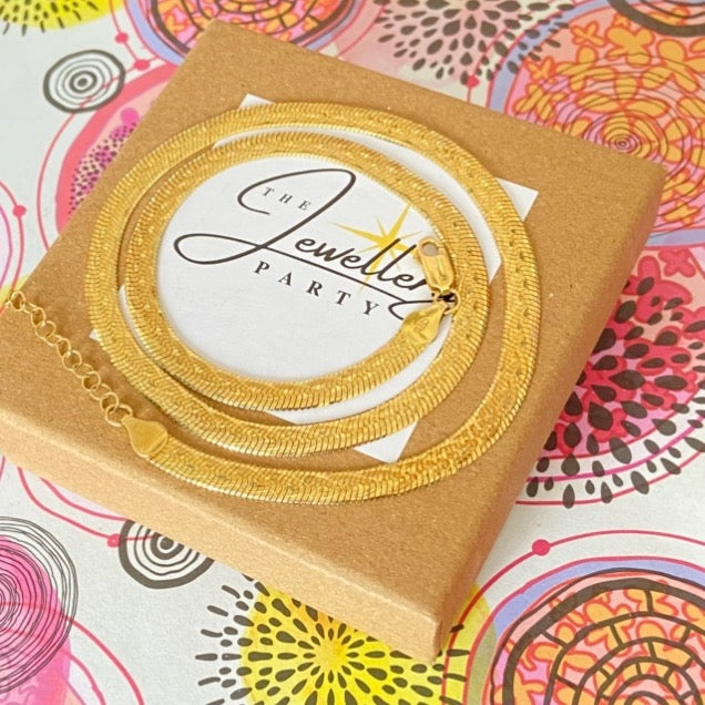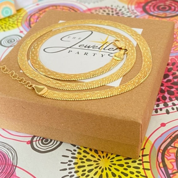The chain is exquisitely designed with a plain herringbone chain one side and on the other side is a more textured feel, please see my pictures showing this.