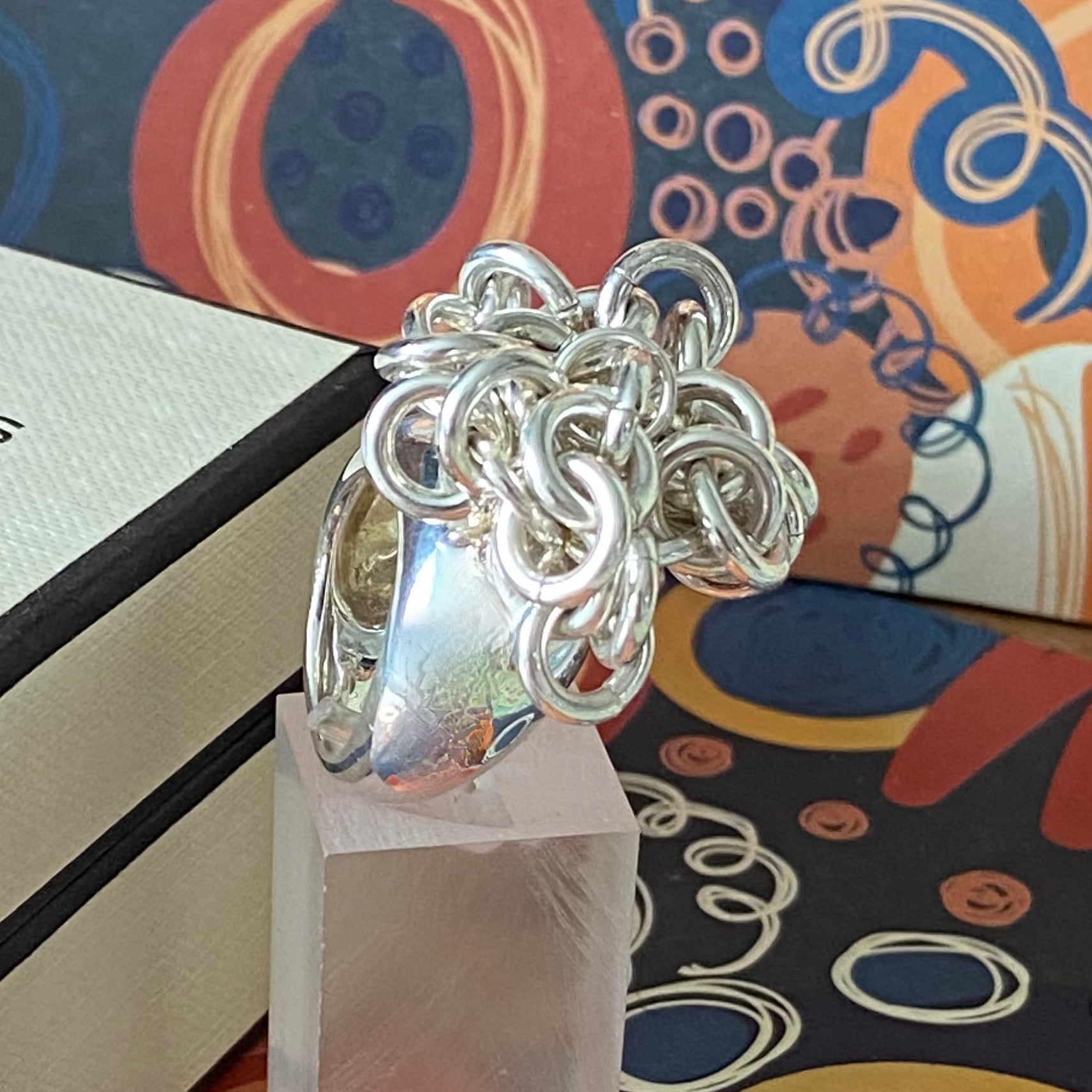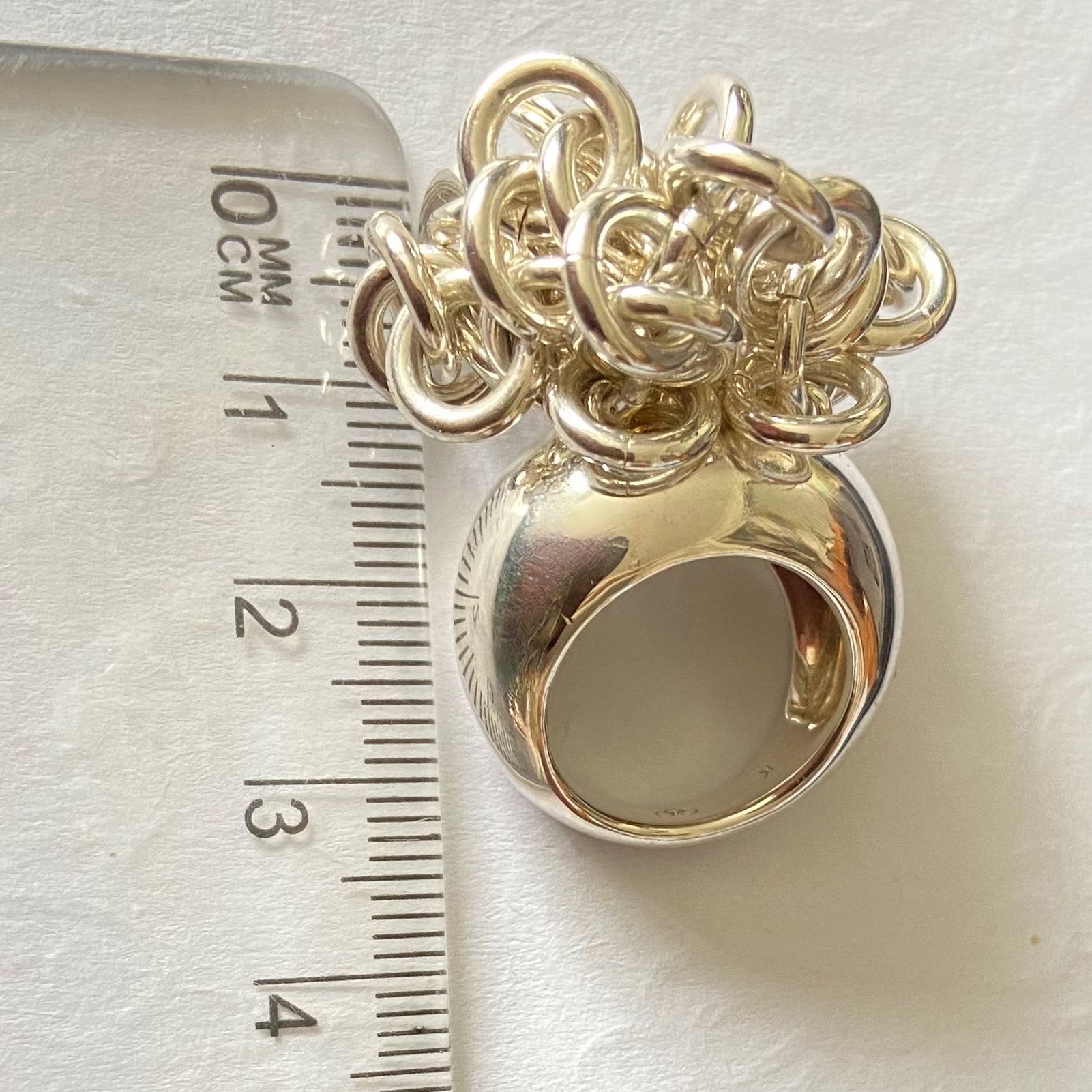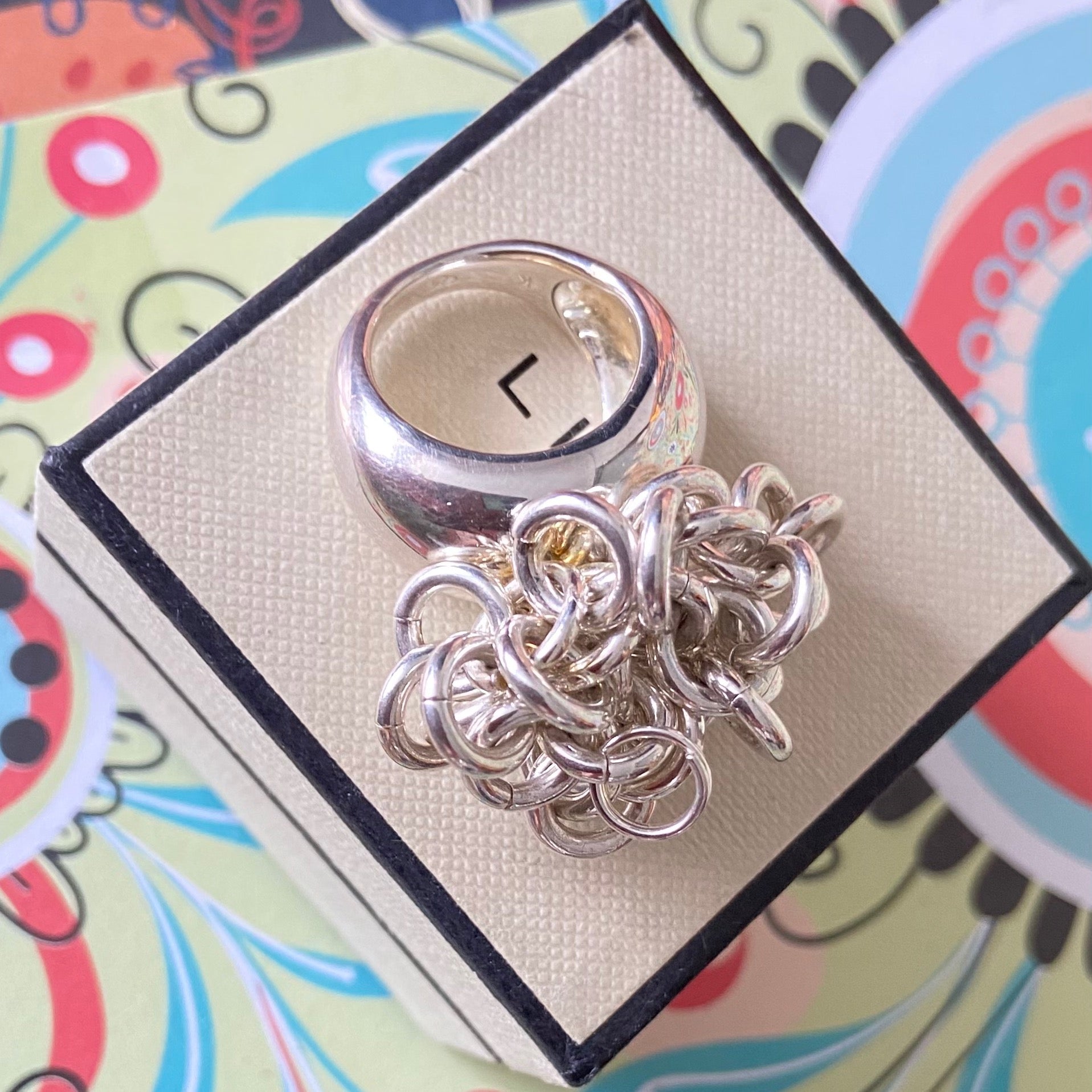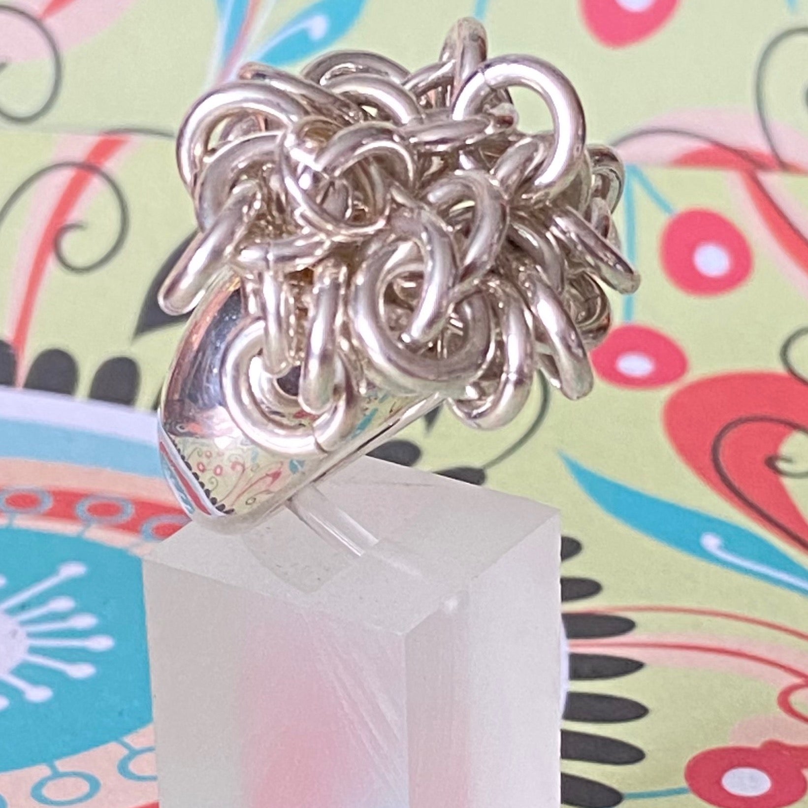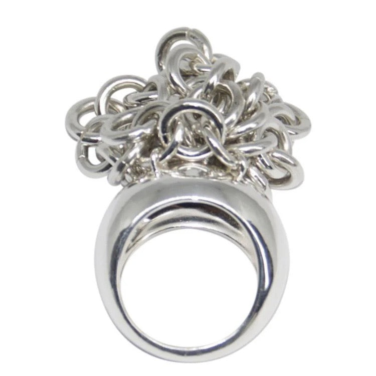 The ring is adorned with sweetie links that move freely and make a lovely jingle noise. This is a very solid ring 31 Grams of Solid Sterling Silver, this ring is for wearing and enjoying.