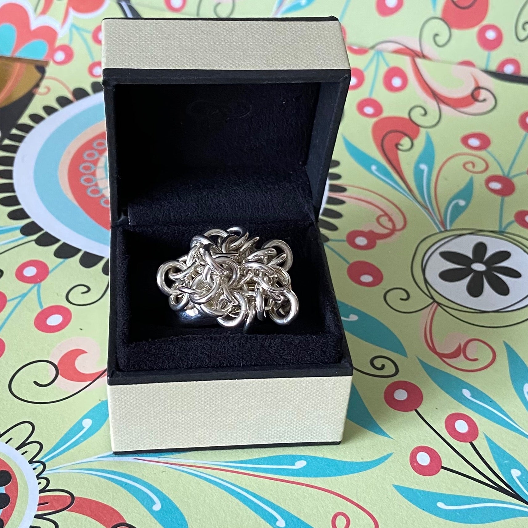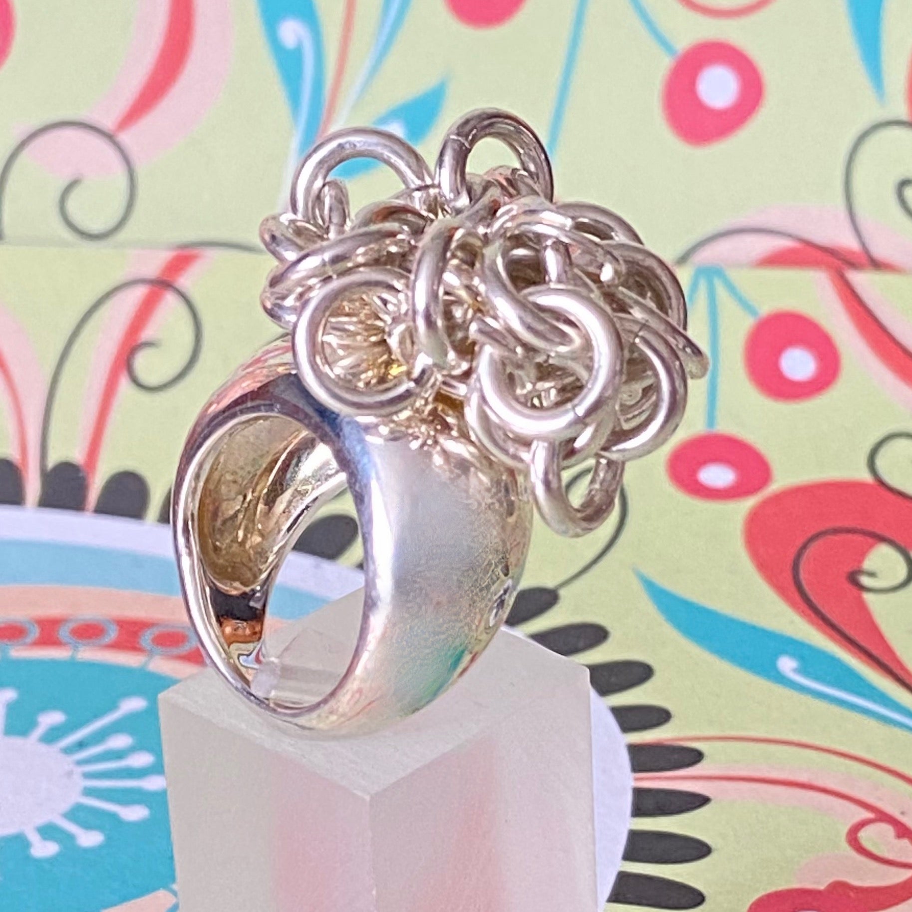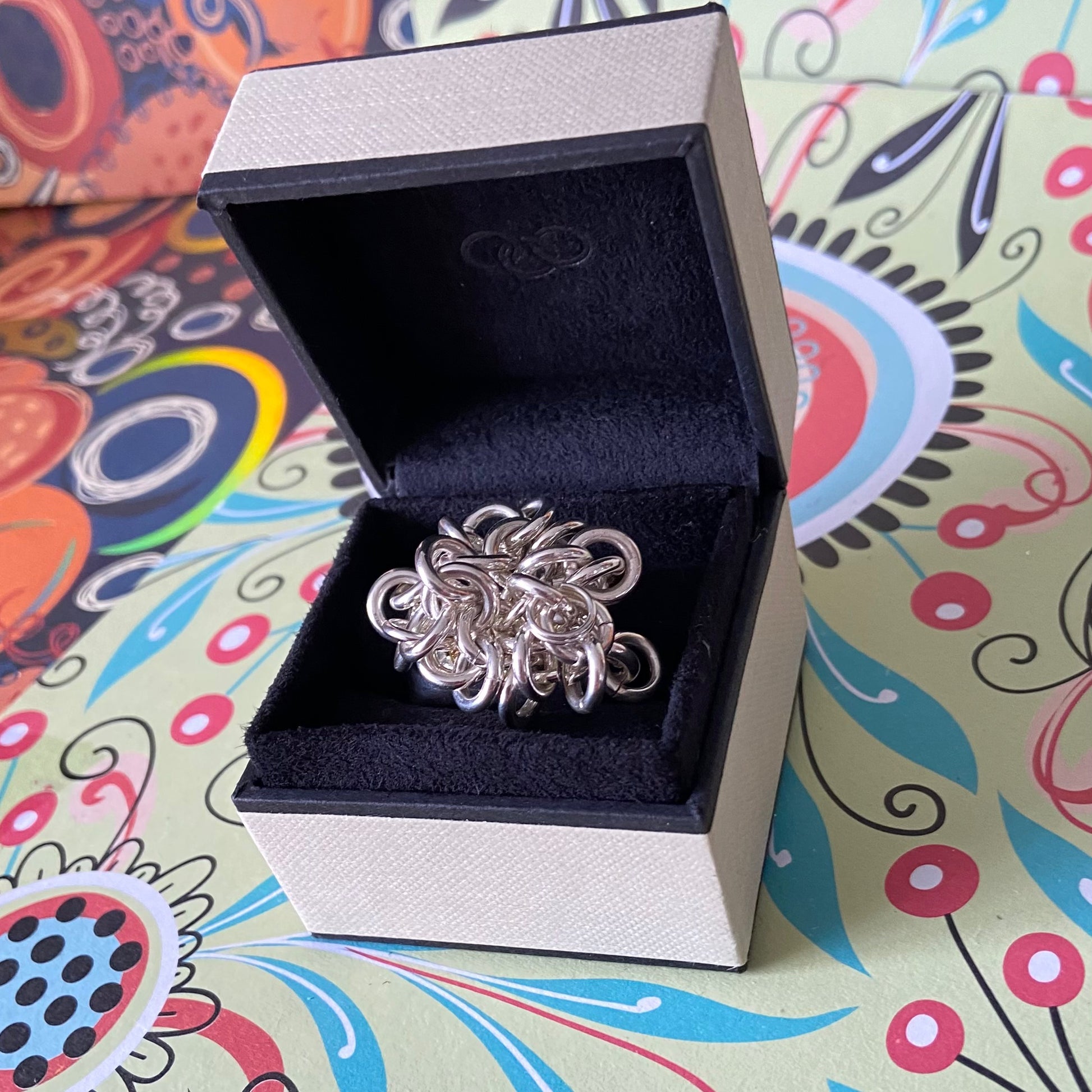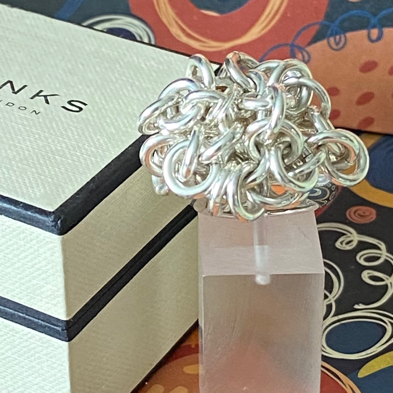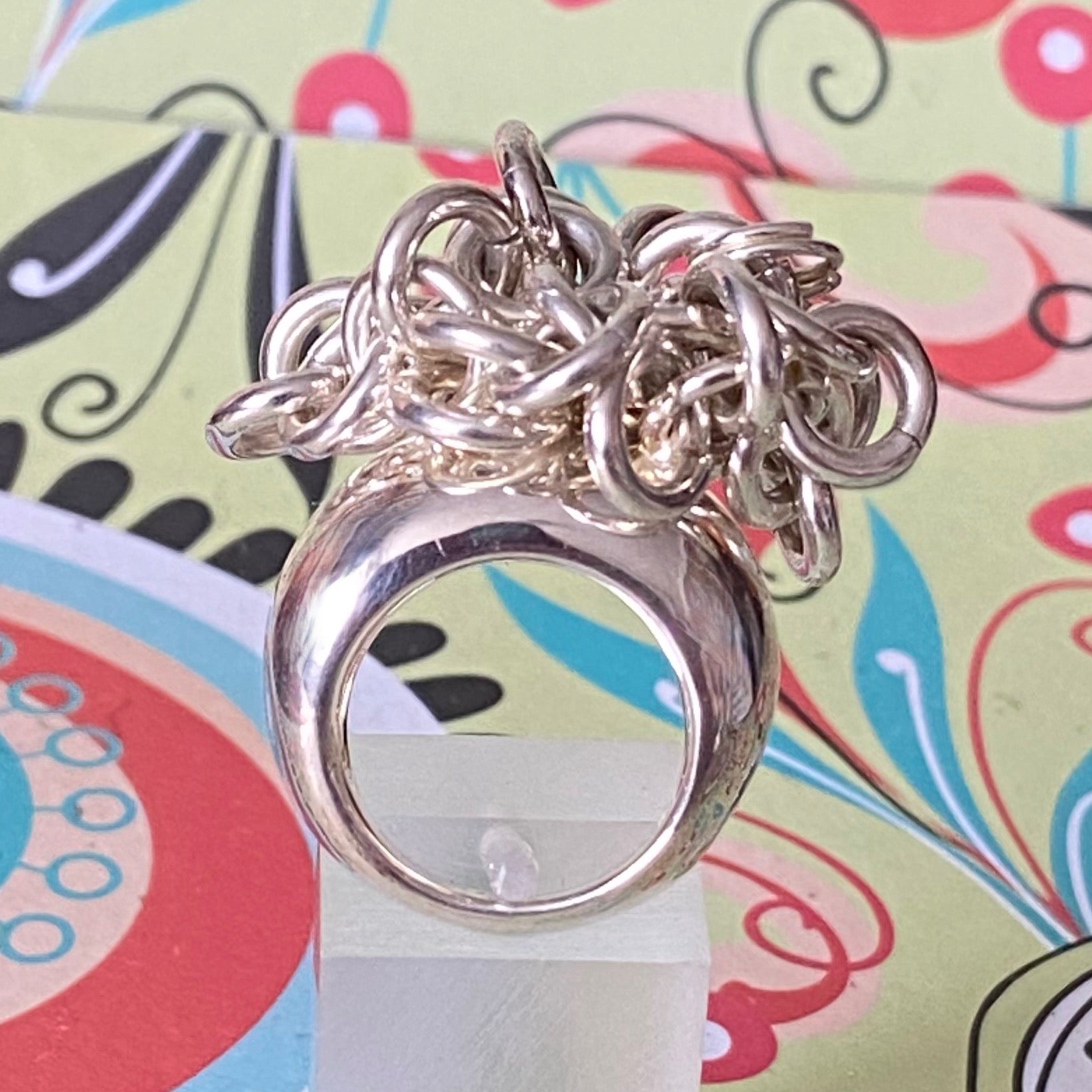 The ring is adorned with sweetie links that move freely and make a lovely jingle noise. This is a very solid ring 31 Grams of Solid Sterling Silver, this ring is for wearing and enjoying.