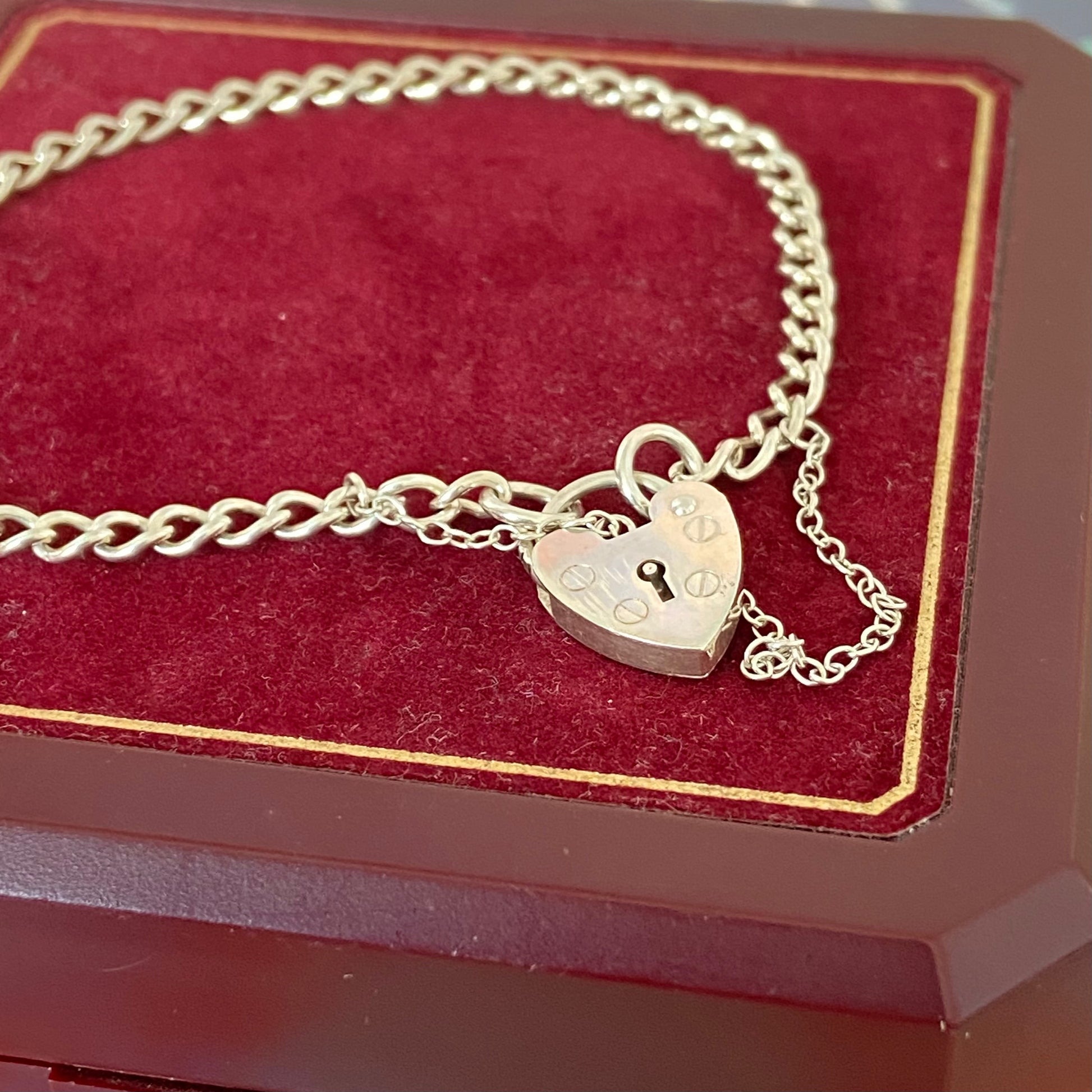 A lovely Vintage bracelet with a heart padlock clasp and safety chain. Lovely light weight bracelet ideal to start their charm collecting and the world of charm collecting.
